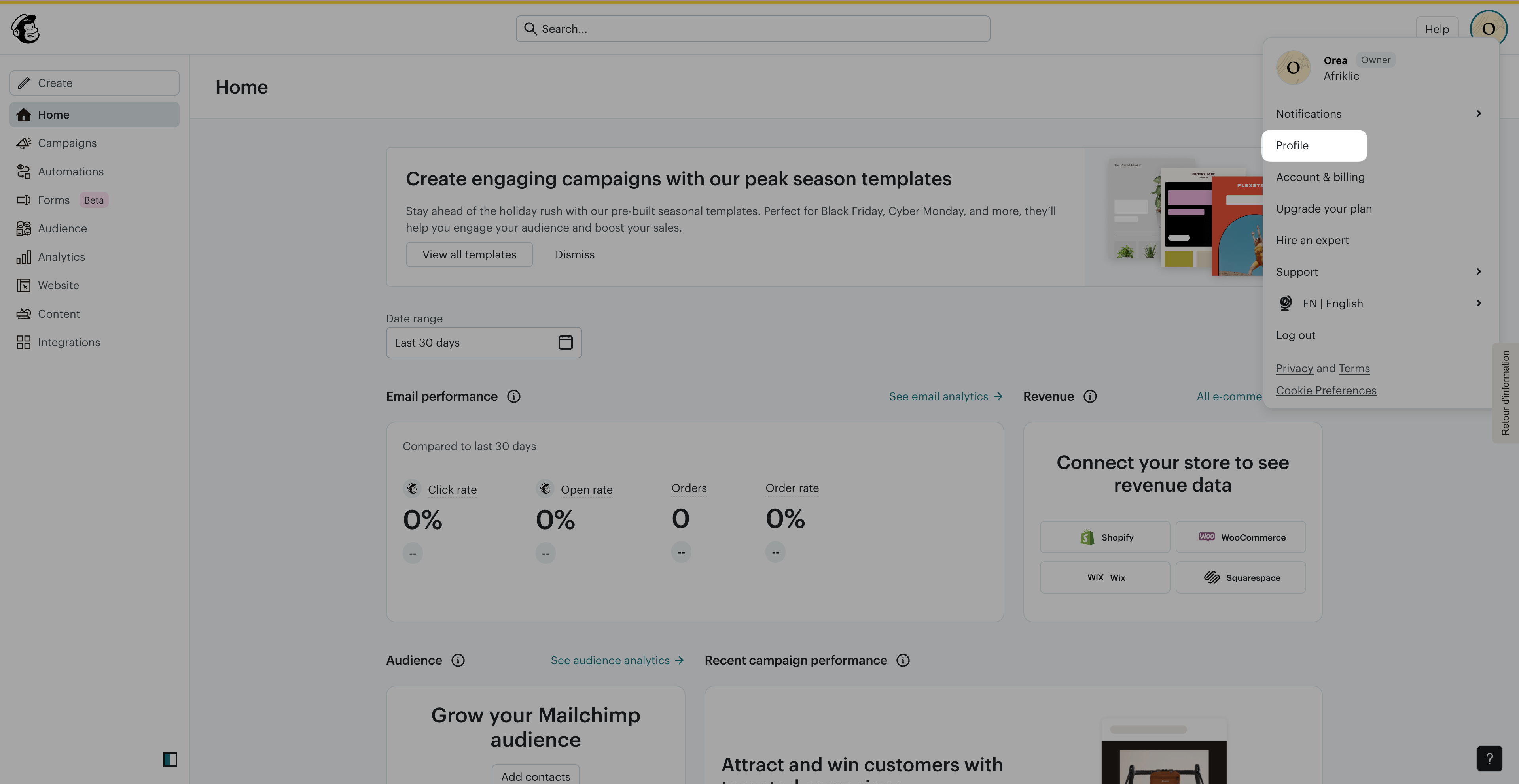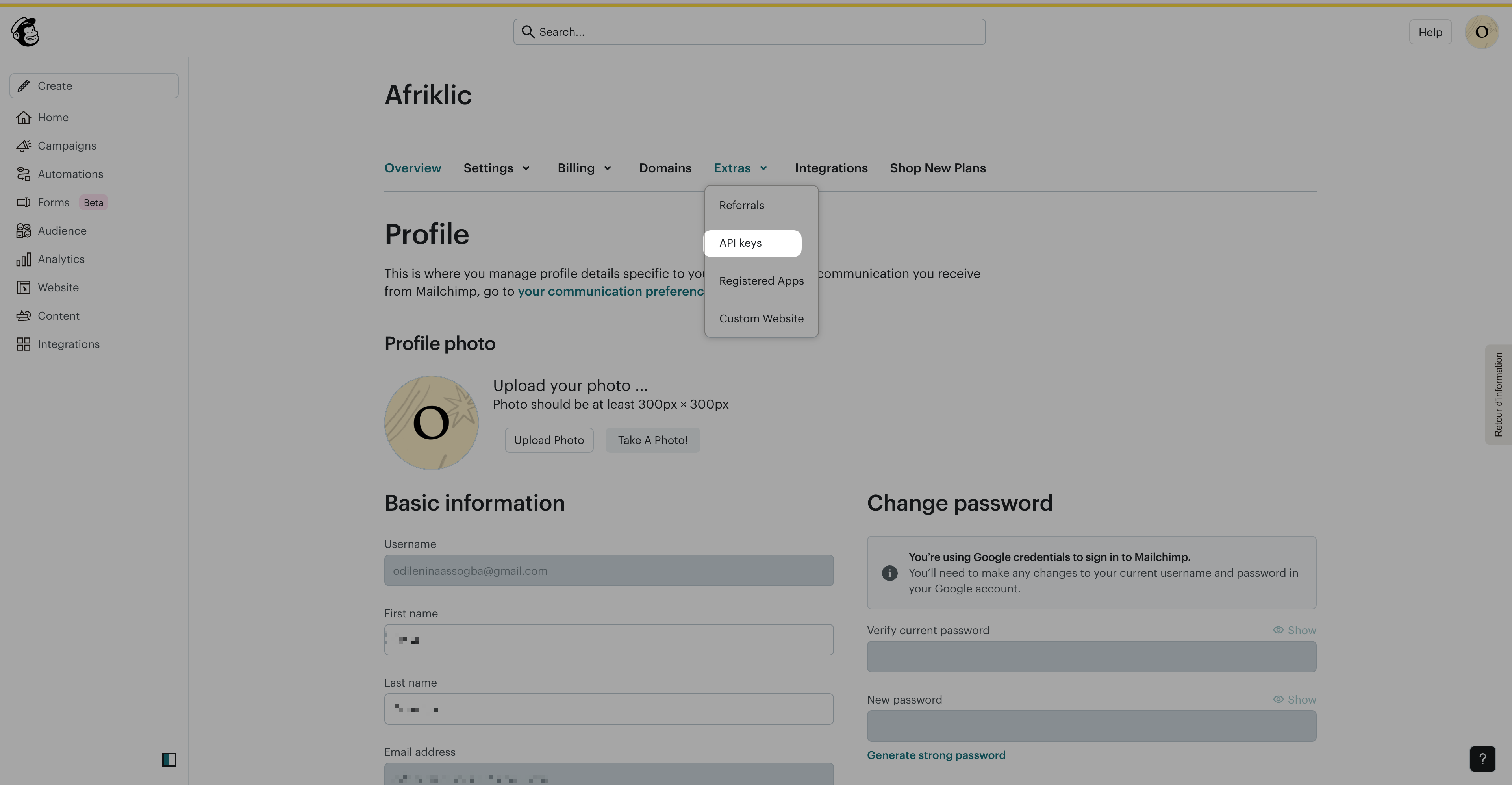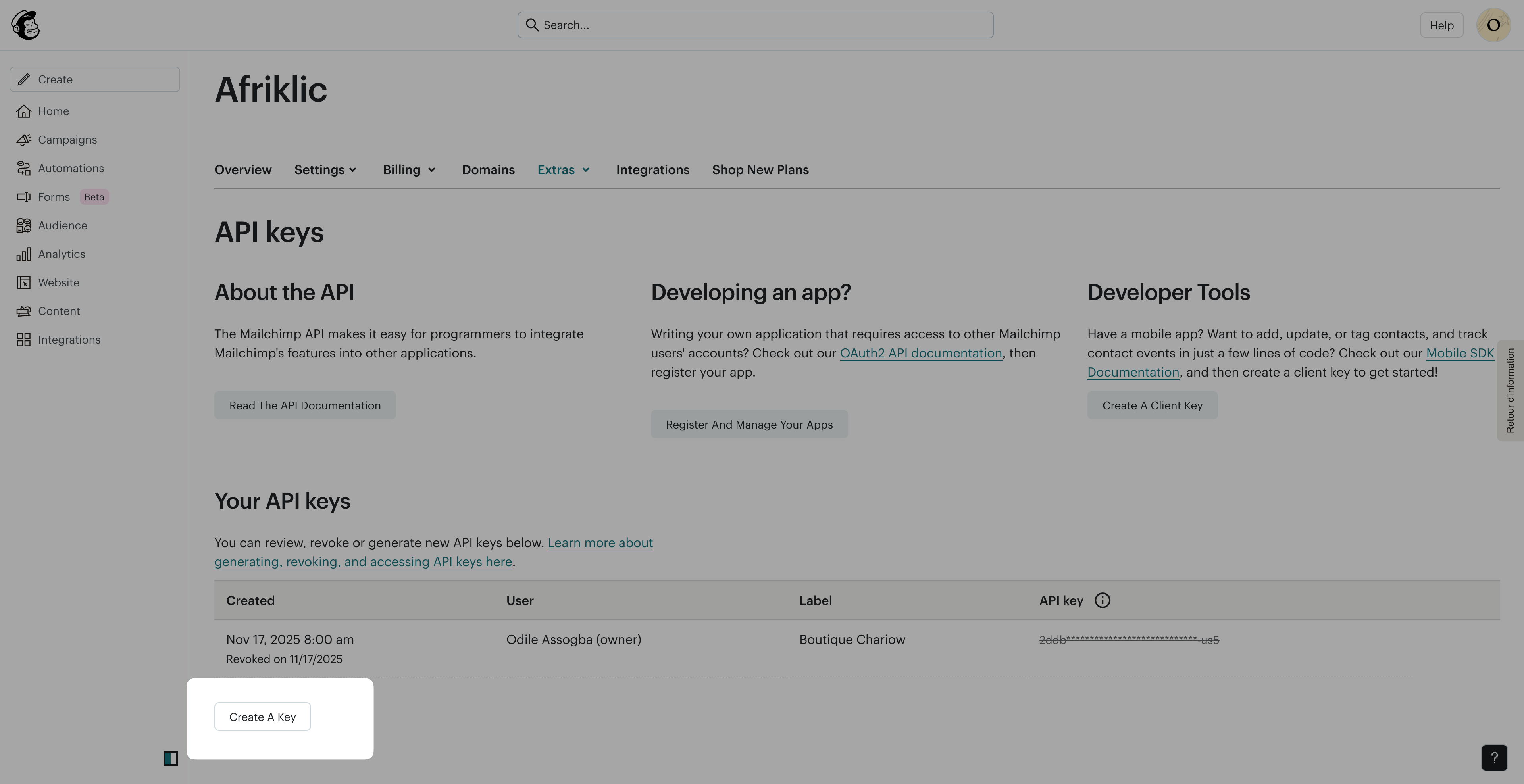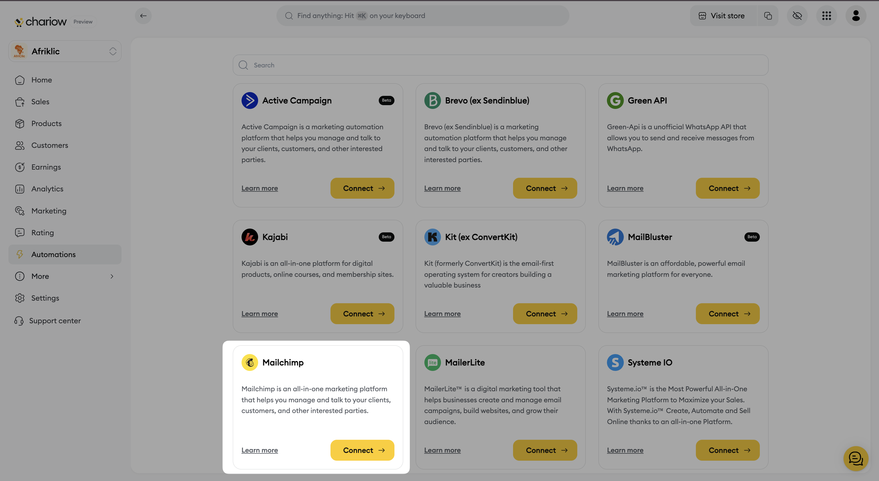 To connect your Chariow store to your Mailchimp account, you’ll need to get your Mailchimp API key and enter it in the Chariow integration interface.