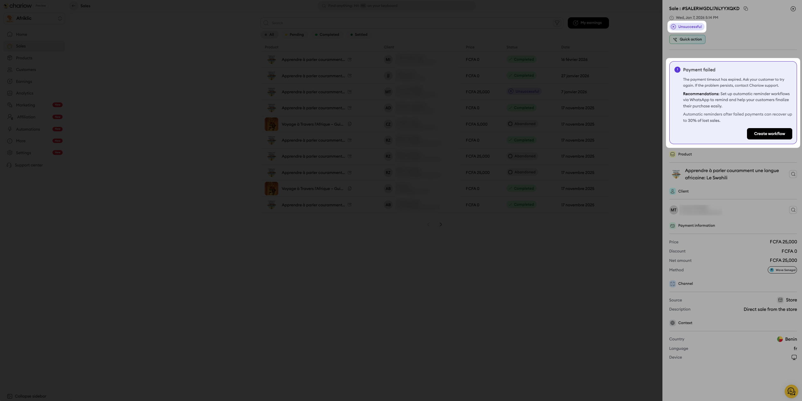 When a transaction fails, it’s super important to understand why it failed so you can take action—whether that means reaching out to the customer, following up with workflows, or tweaking your product’s settings. Chariow lets you easily check the exact reason for each failed payment.