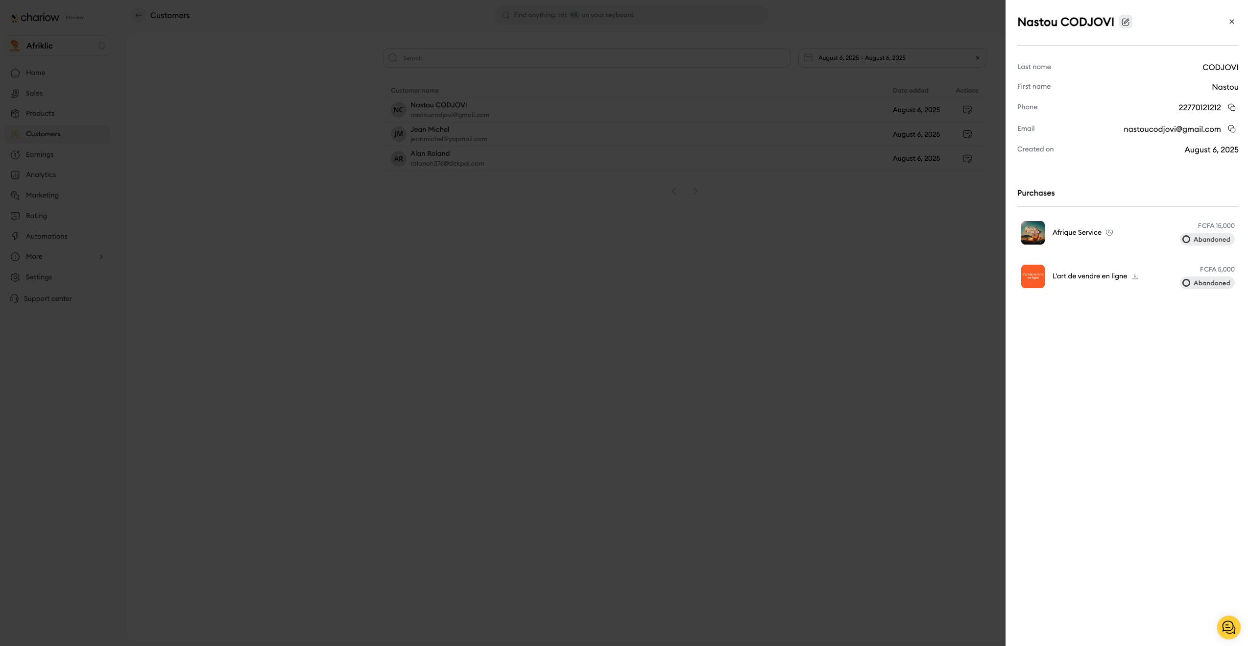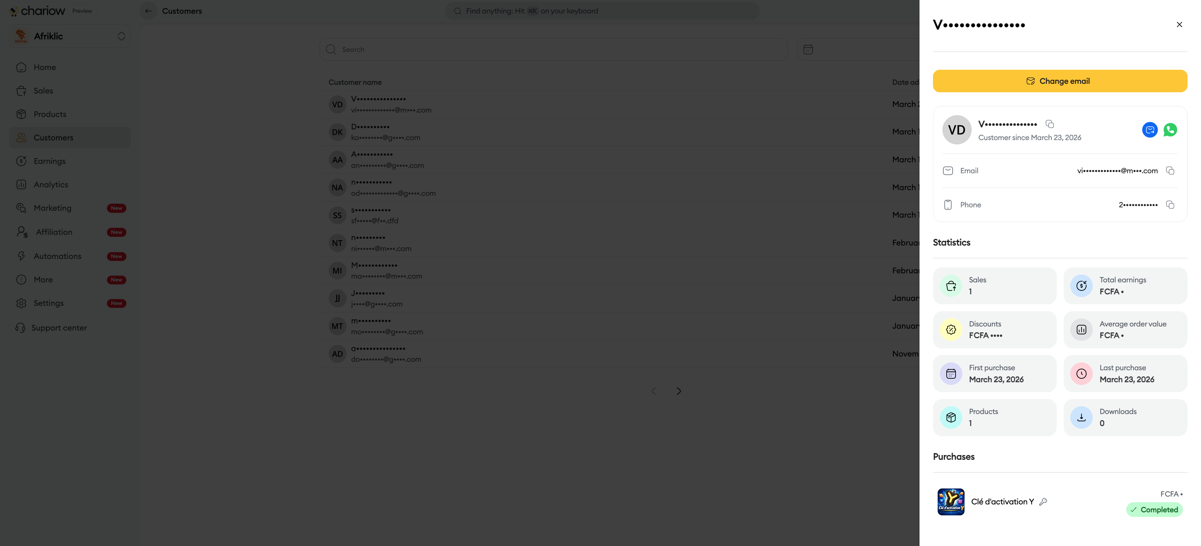 The "Clients" section lets you view and manage everyone who made a purchase in your Chariow shop. It's a handy tool to keep track of your customers and build lasting relationships.