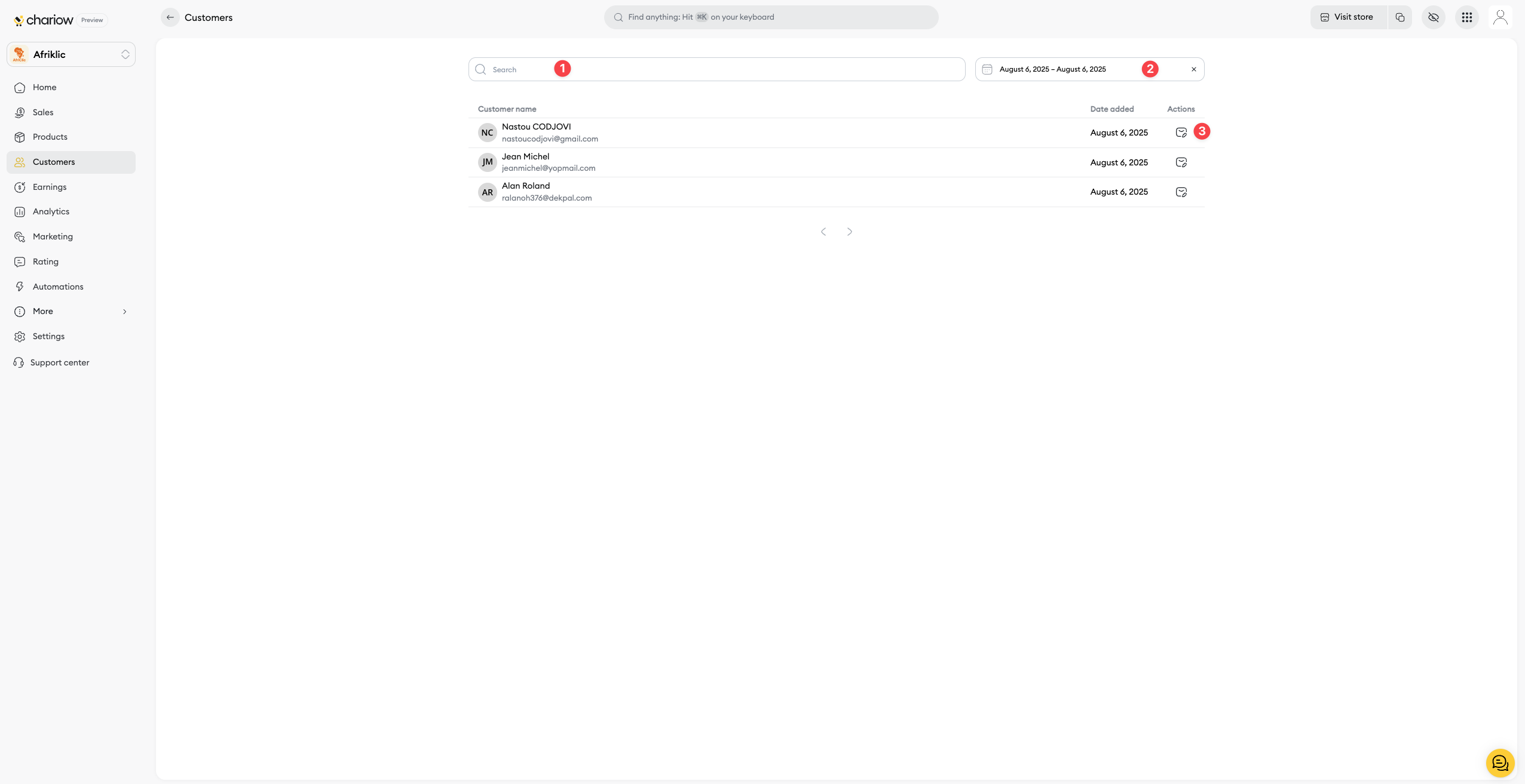 Search bar (1): Use the search bar to find a specific customer by their name or email address.