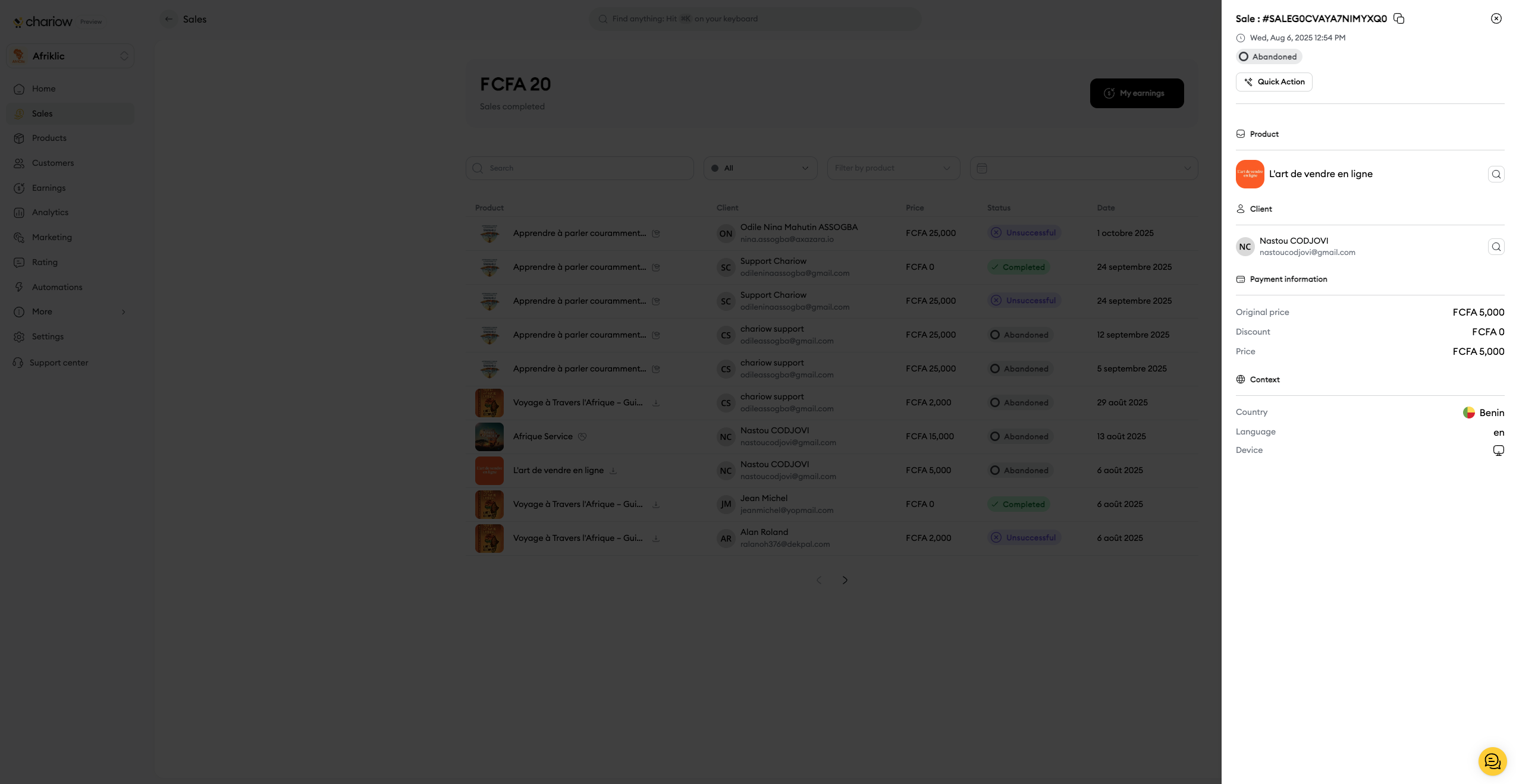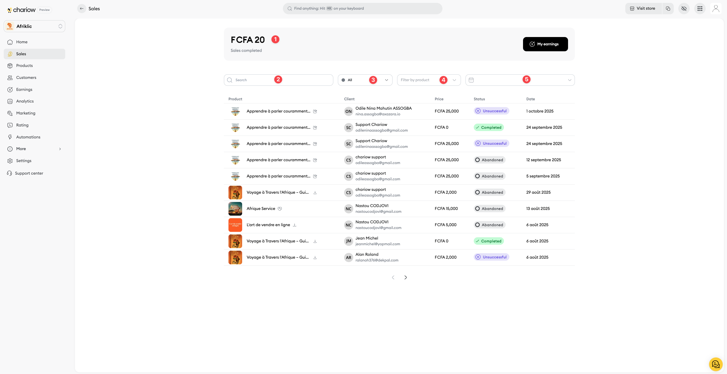The "Sales" section is an essential tool for tracking and analyzing your shop's performance on Chariow. It gives you a complete view of all your transactions, so you can make smart decisions to grow your business.