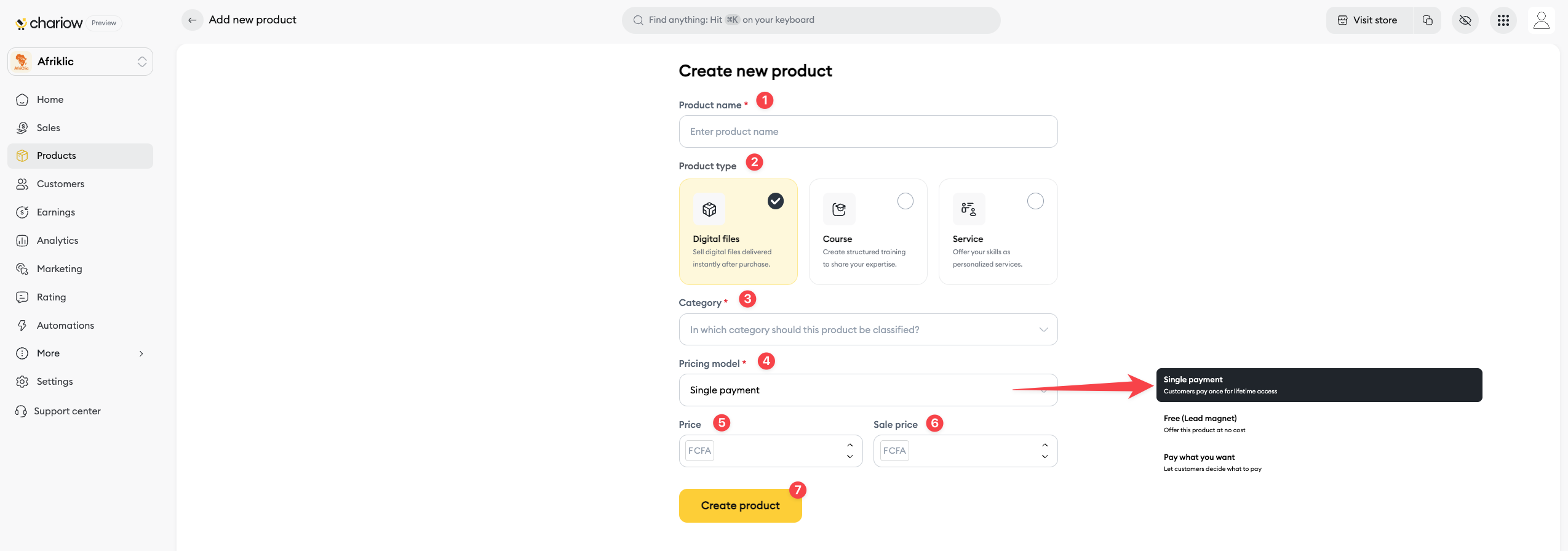 Creating a product on Chariow is a simple and intuitive process. In just a few steps, you can set up your digital product or service and make it available for sale on your store.