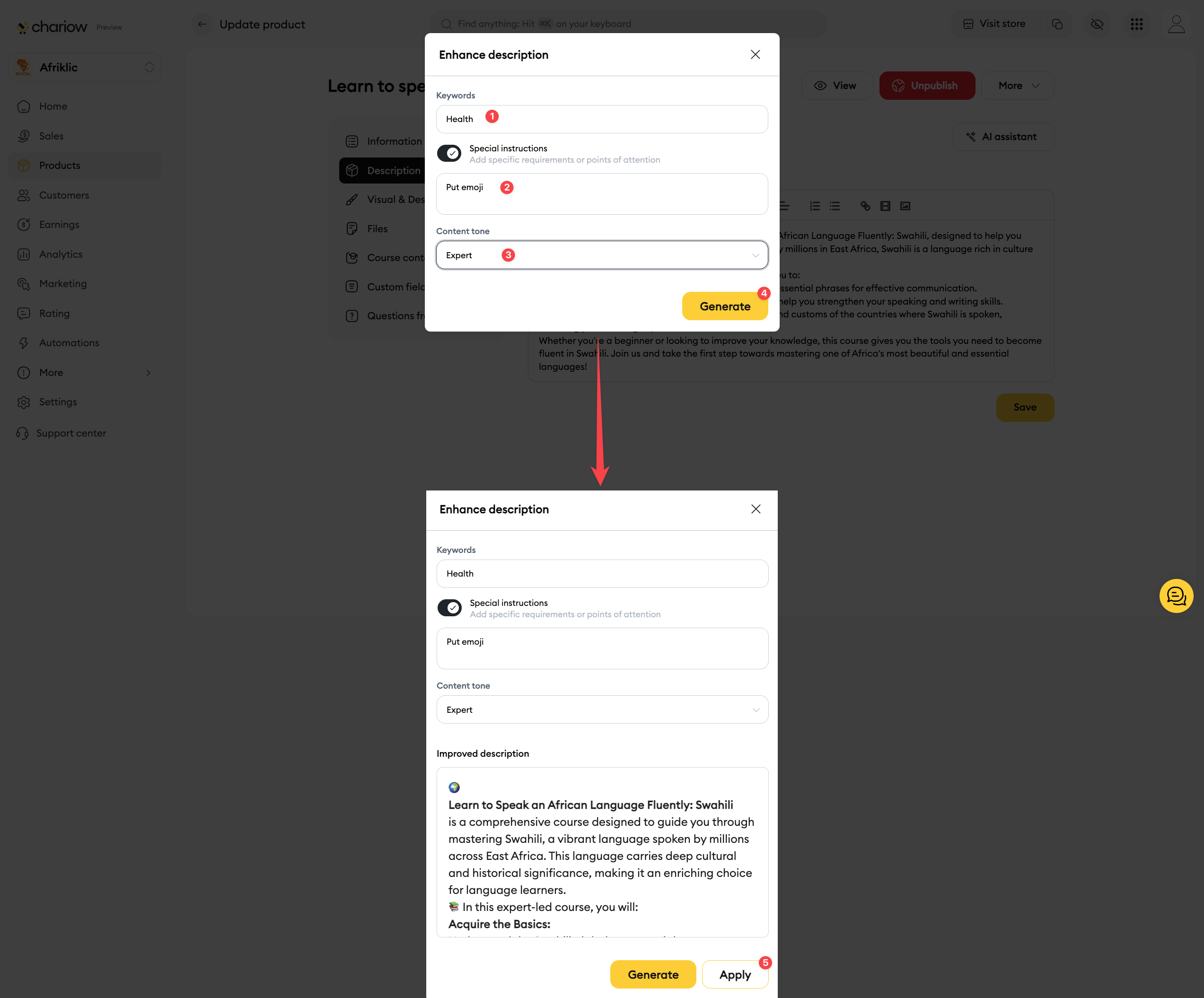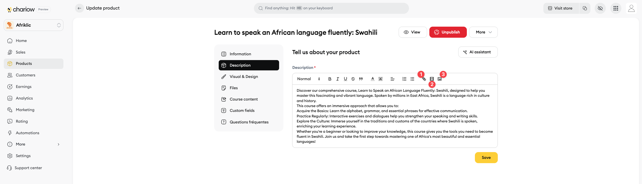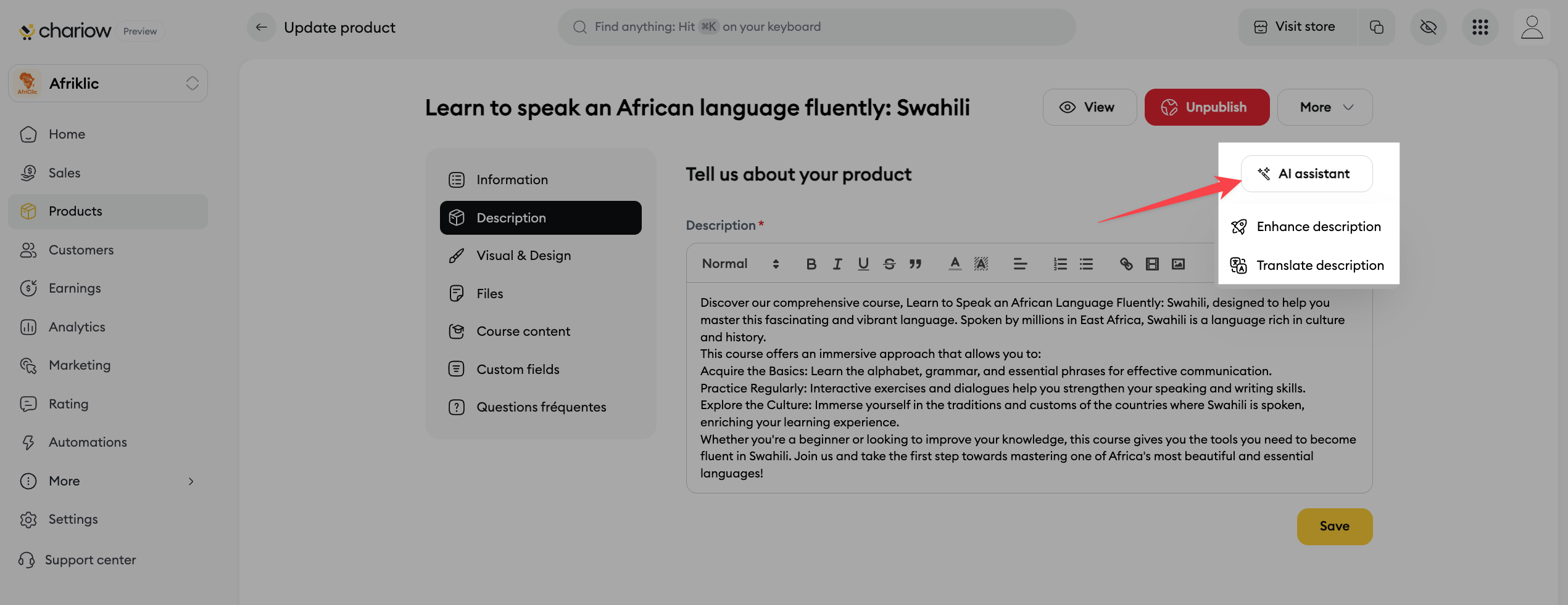 Chariow offers an AI assistant to help you write a punchy description in just a few clicks or translate your description. This option is optional, but it can save you time and improve the quality of your text.