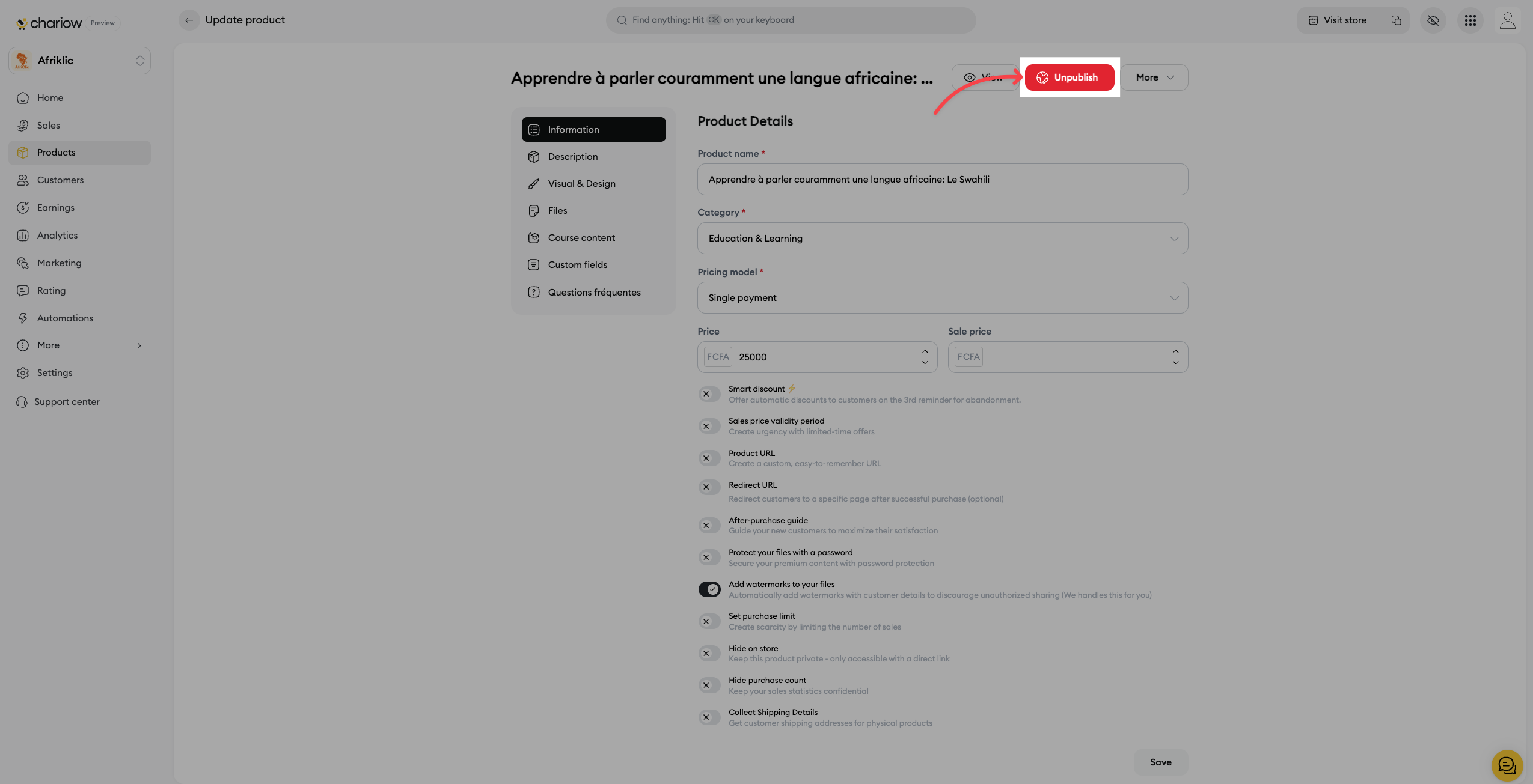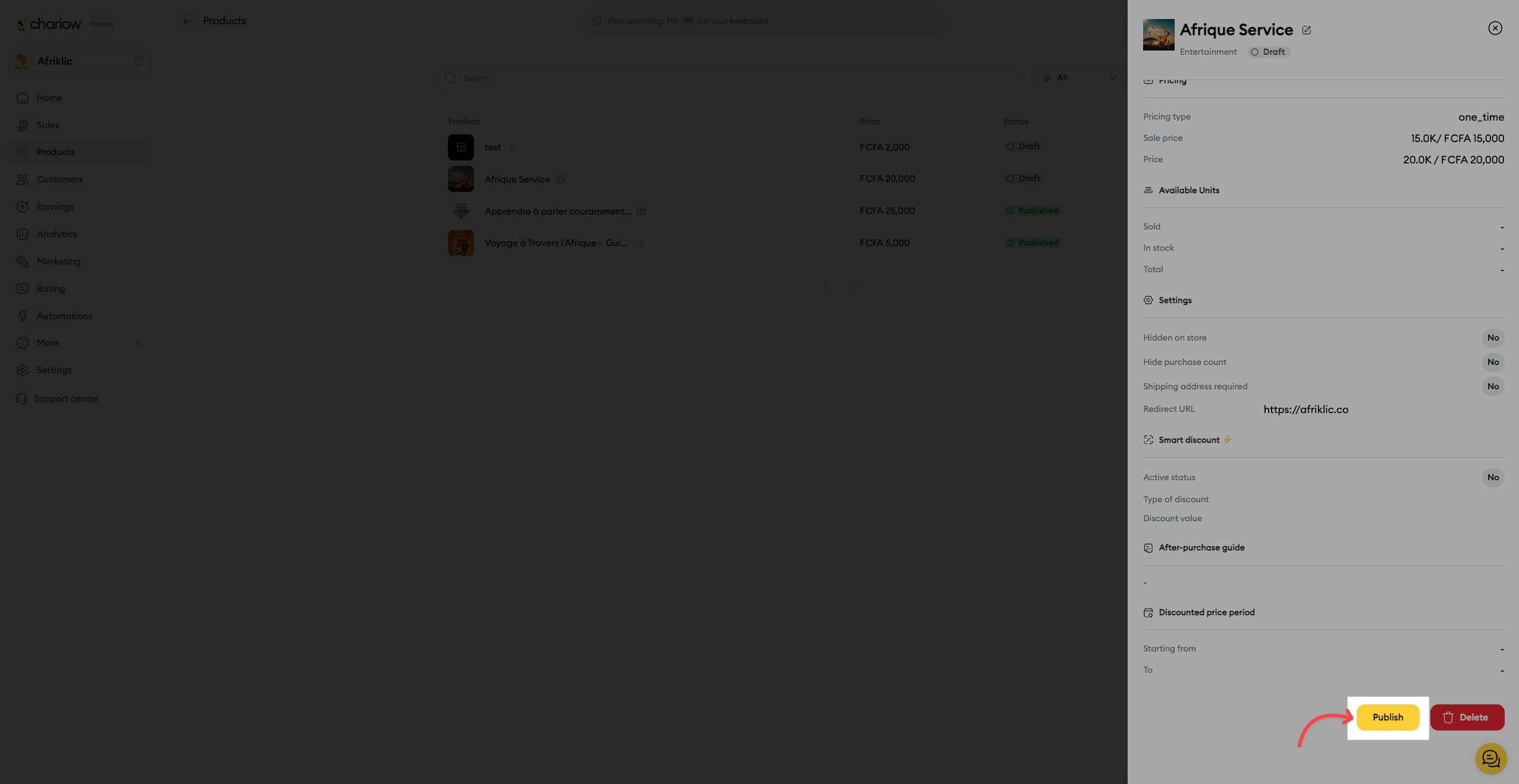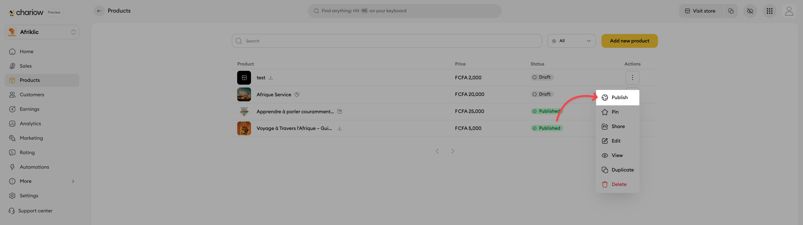 Managing your product visibility is key. On Chariow, every new product starts as "Draft" and isn't visible on your store. You need to publish it to make it accessible to your customers. In the same way, you can unpublish it anytime to hide it without deleting it for good.