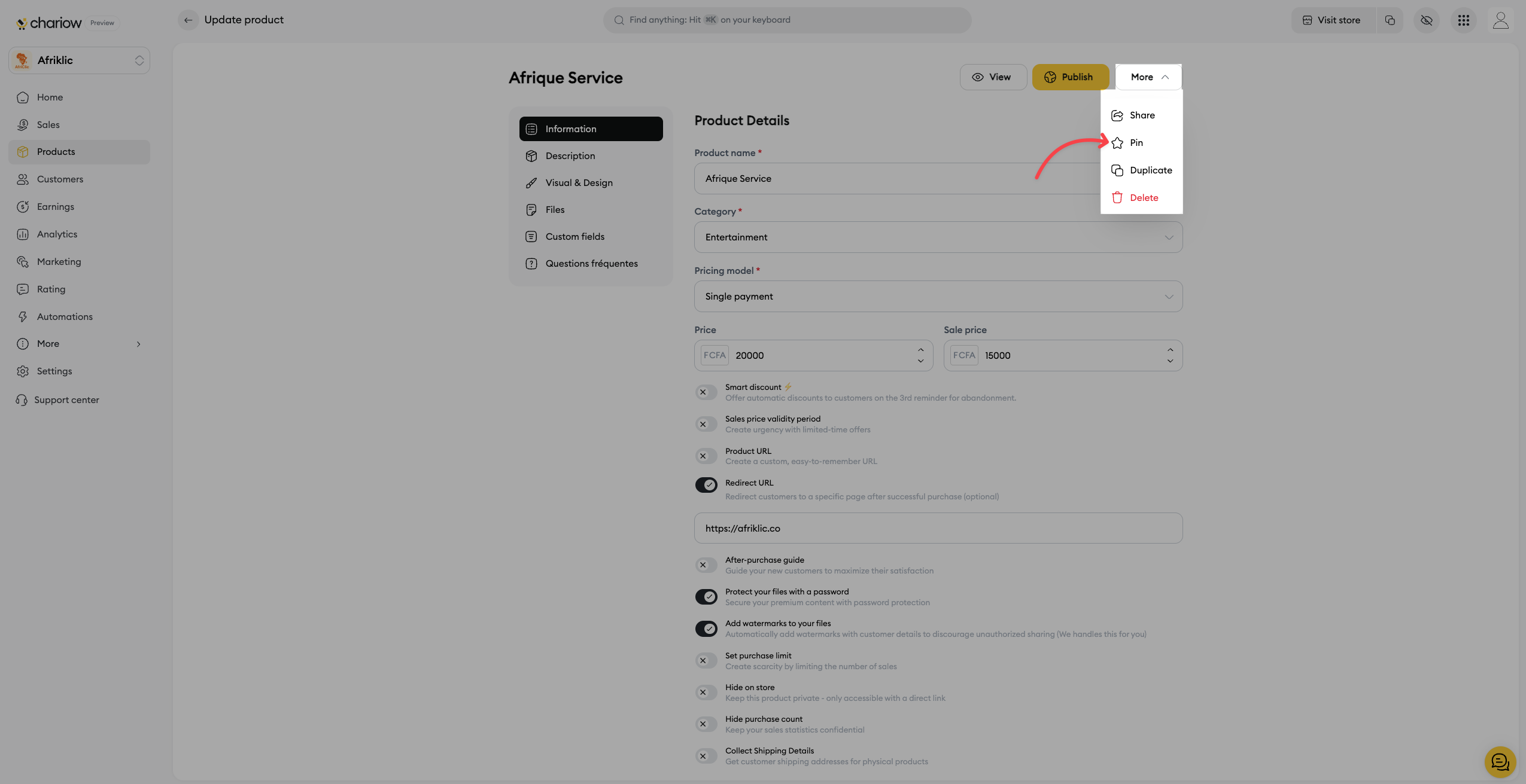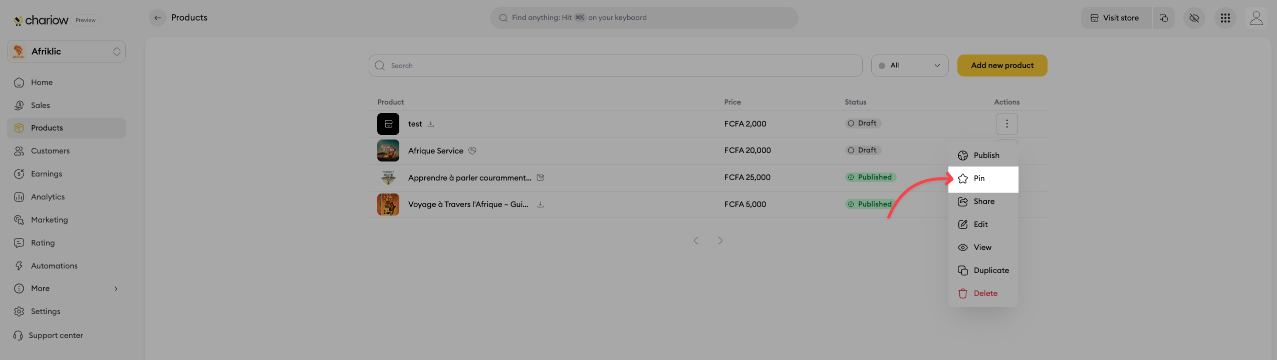 To highlight your most popular or newest products, Chariow lets you "pin" them to the top of your store. A pinned product always stays at the top spot, no matter how many new products you add. In the same way, you can "unpin" it to put it back in the regular chronological order.