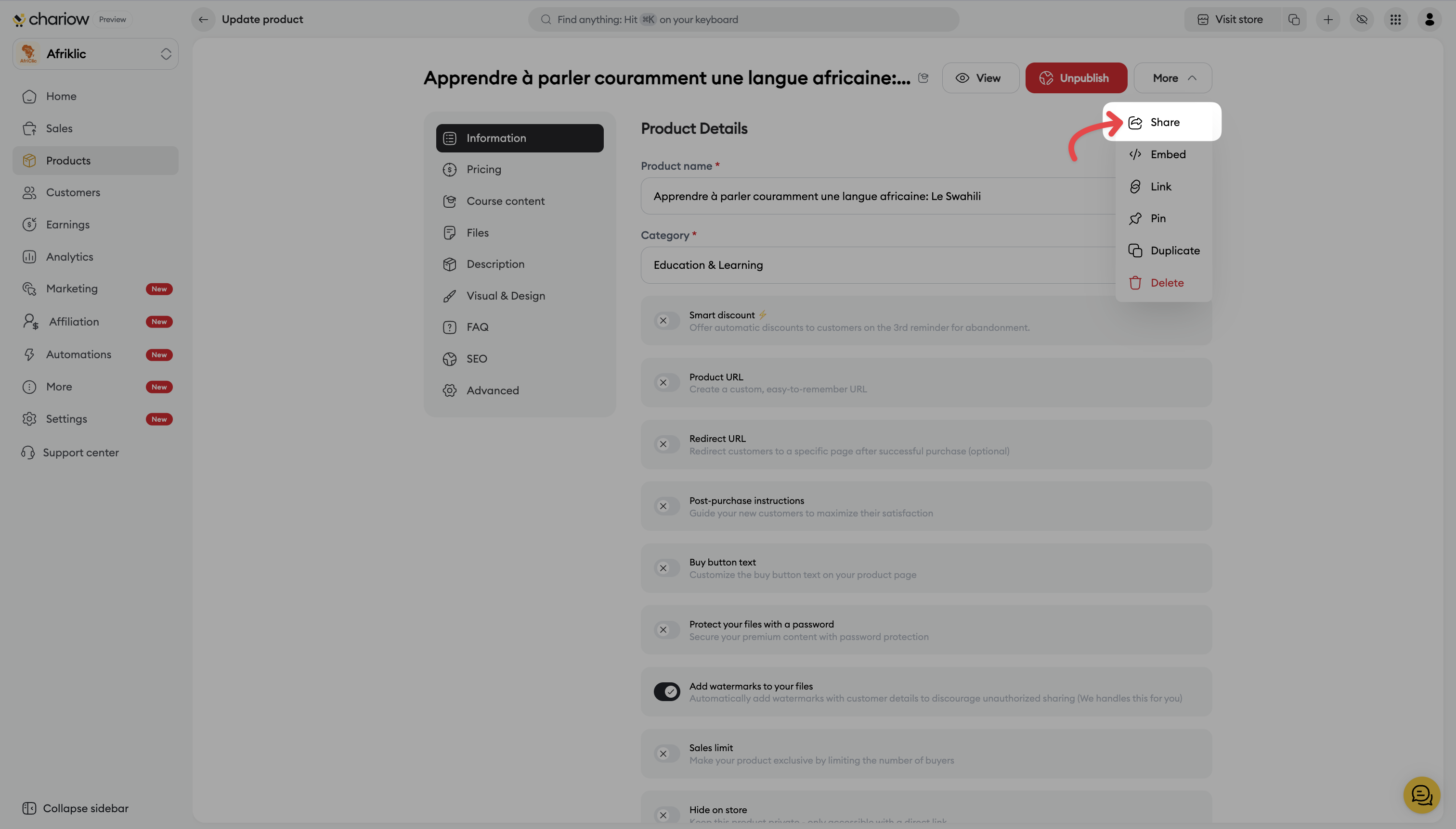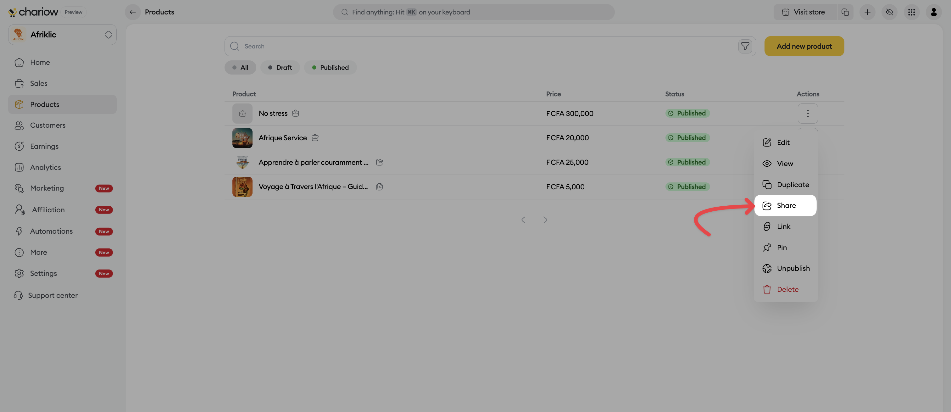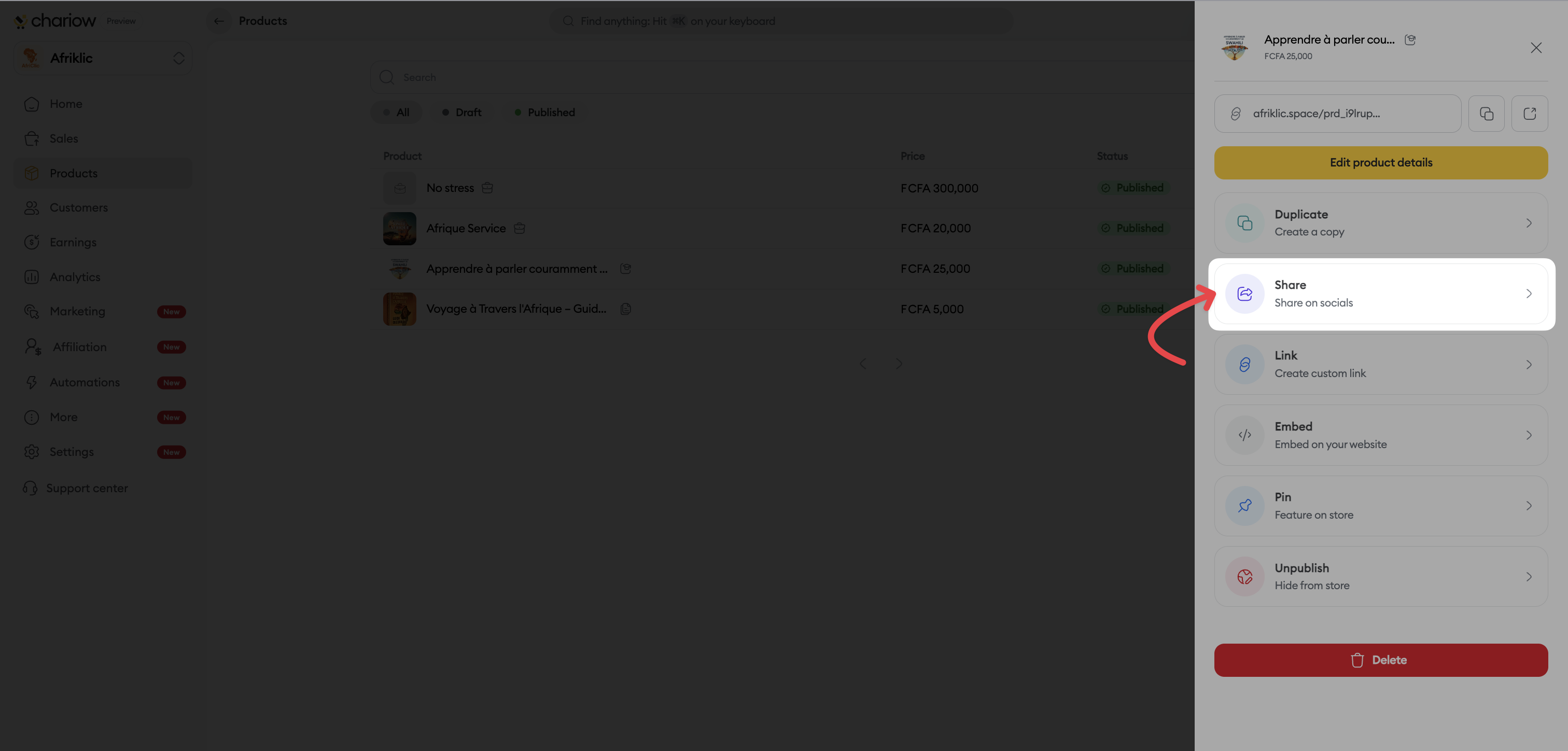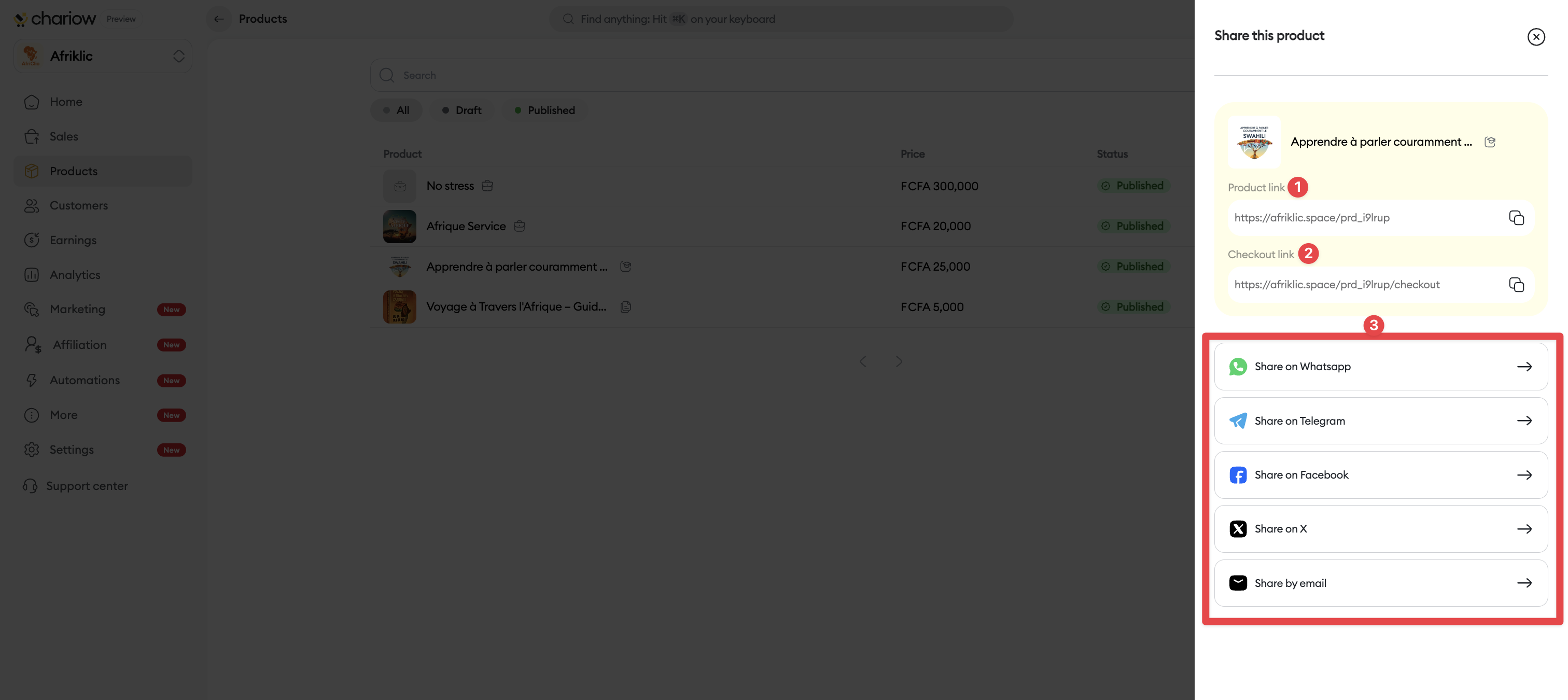 Link sharing is the most direct way to generate sales. Whether it’s via your social networks, a newsletter, or a private discussion, Chariow lets you send your prospects exactly where you want: to the product page or straight to the payment page.
