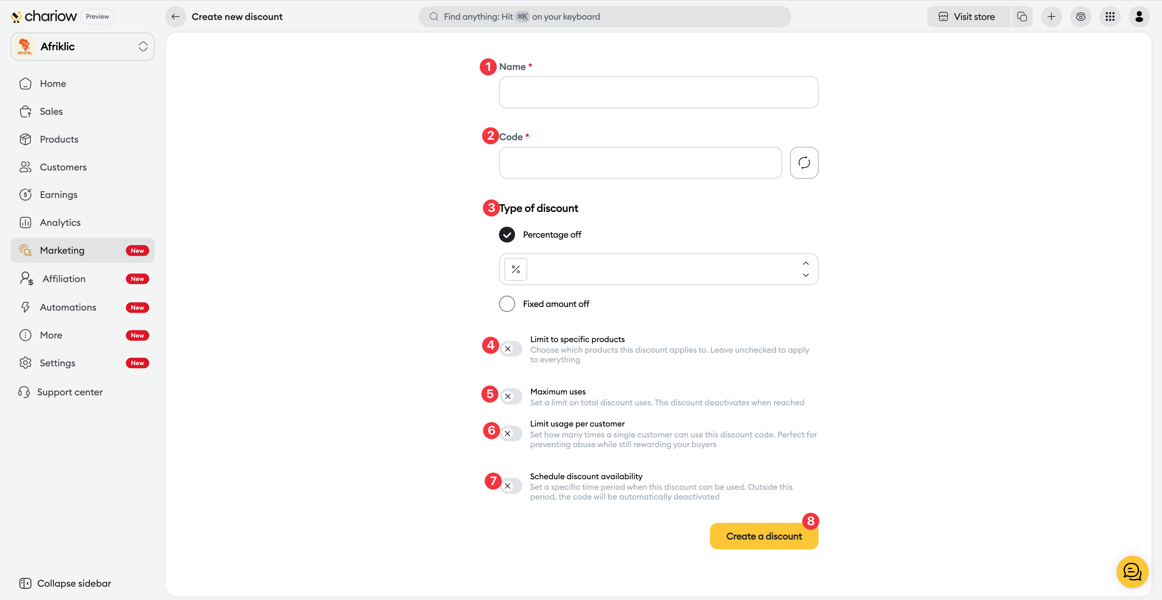 Promo codes are an excellent way to attract new customers, retain existing buyers, and boost your sales. On Chariow, creating a discount is quick and easy.
