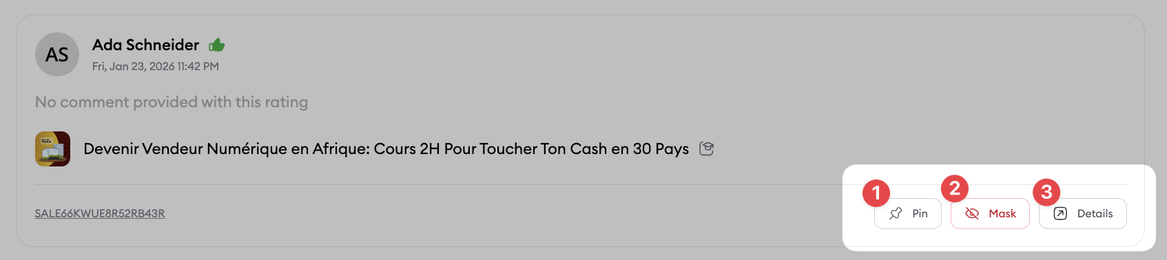 Details : Click this button to open the side panel showing the Review ID, the Related sale, the Product concerned and the customer’s identity.