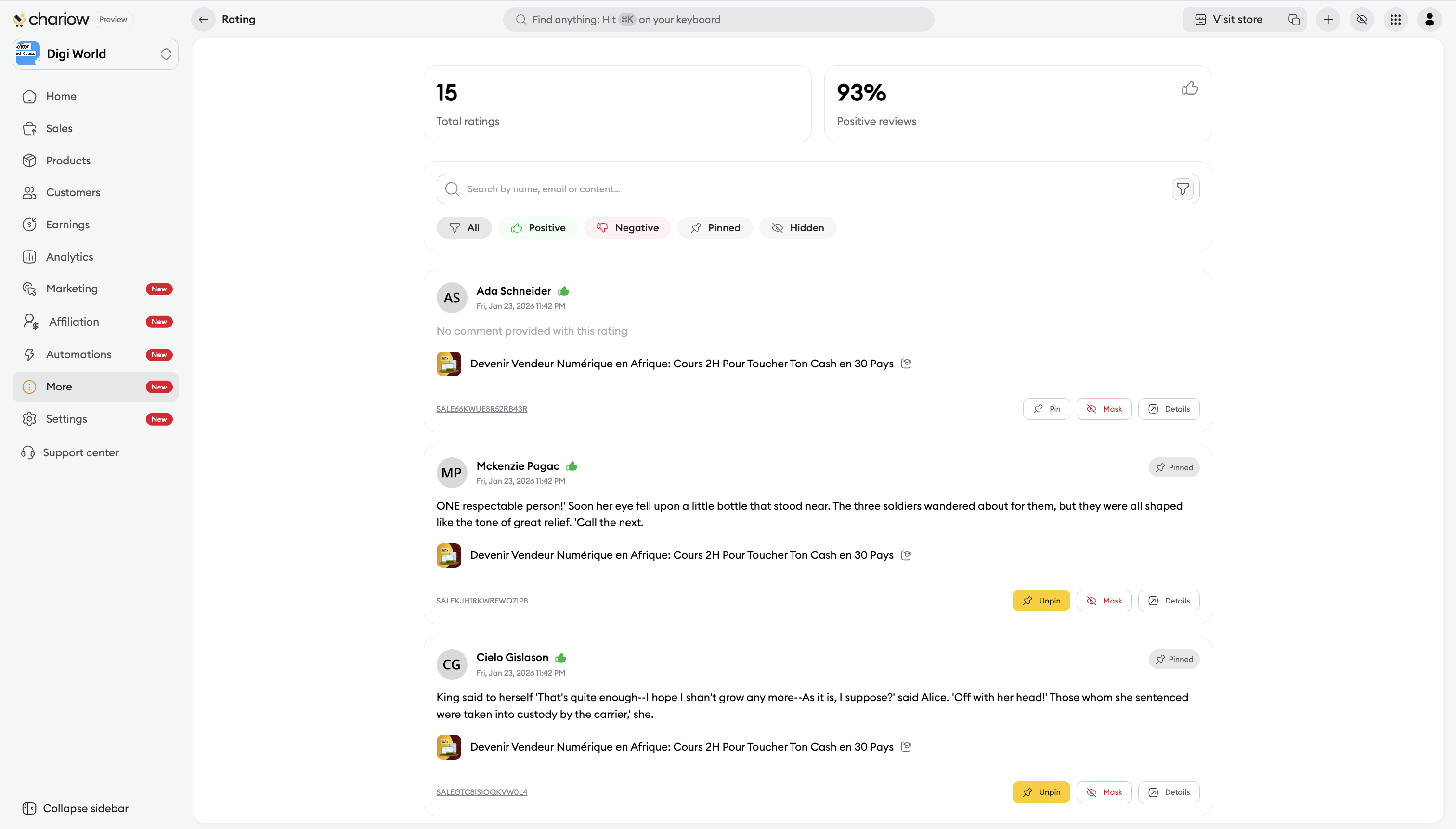 Client Area : Encourage your customers to log in to https://portal.chariow.com to leave their review.