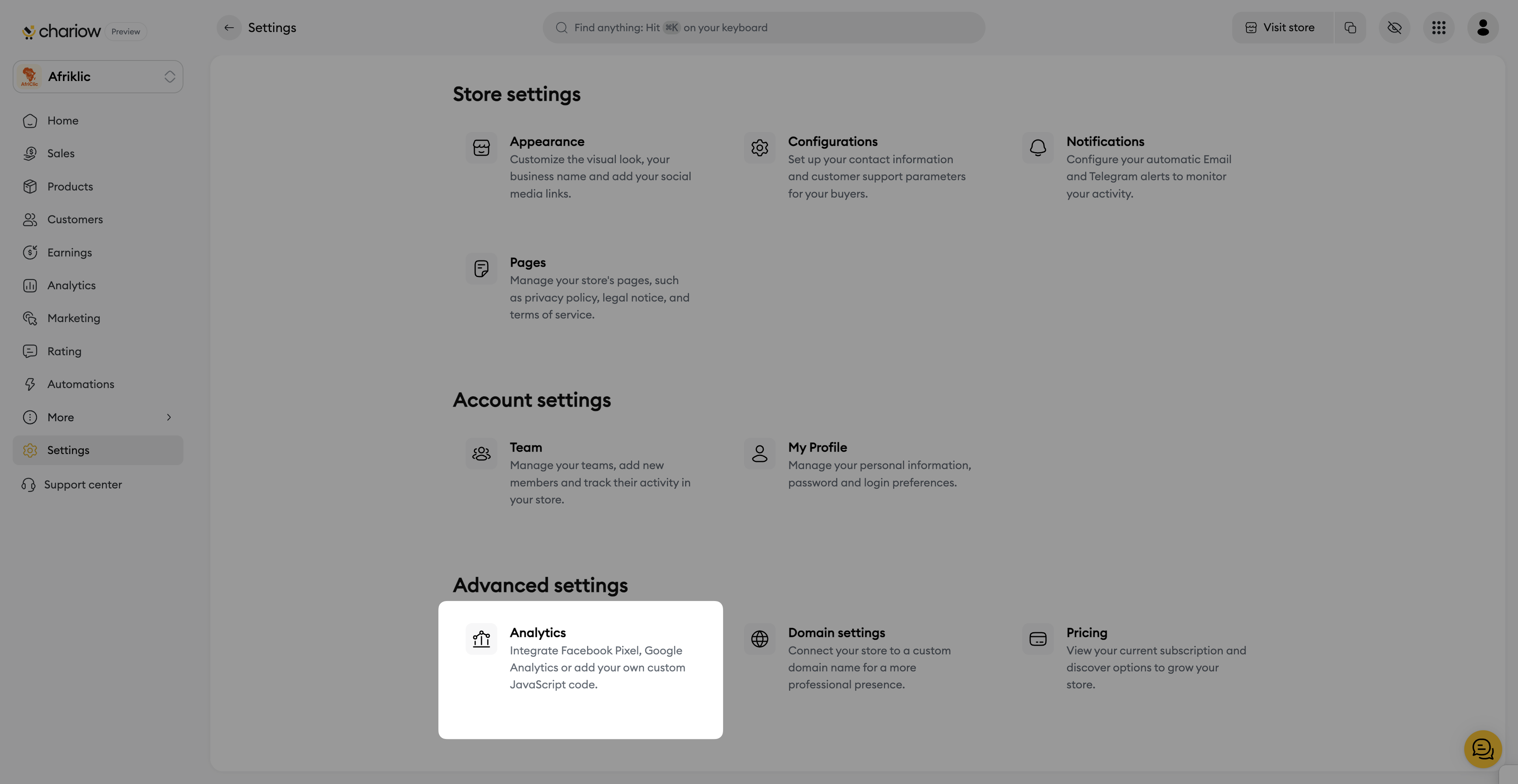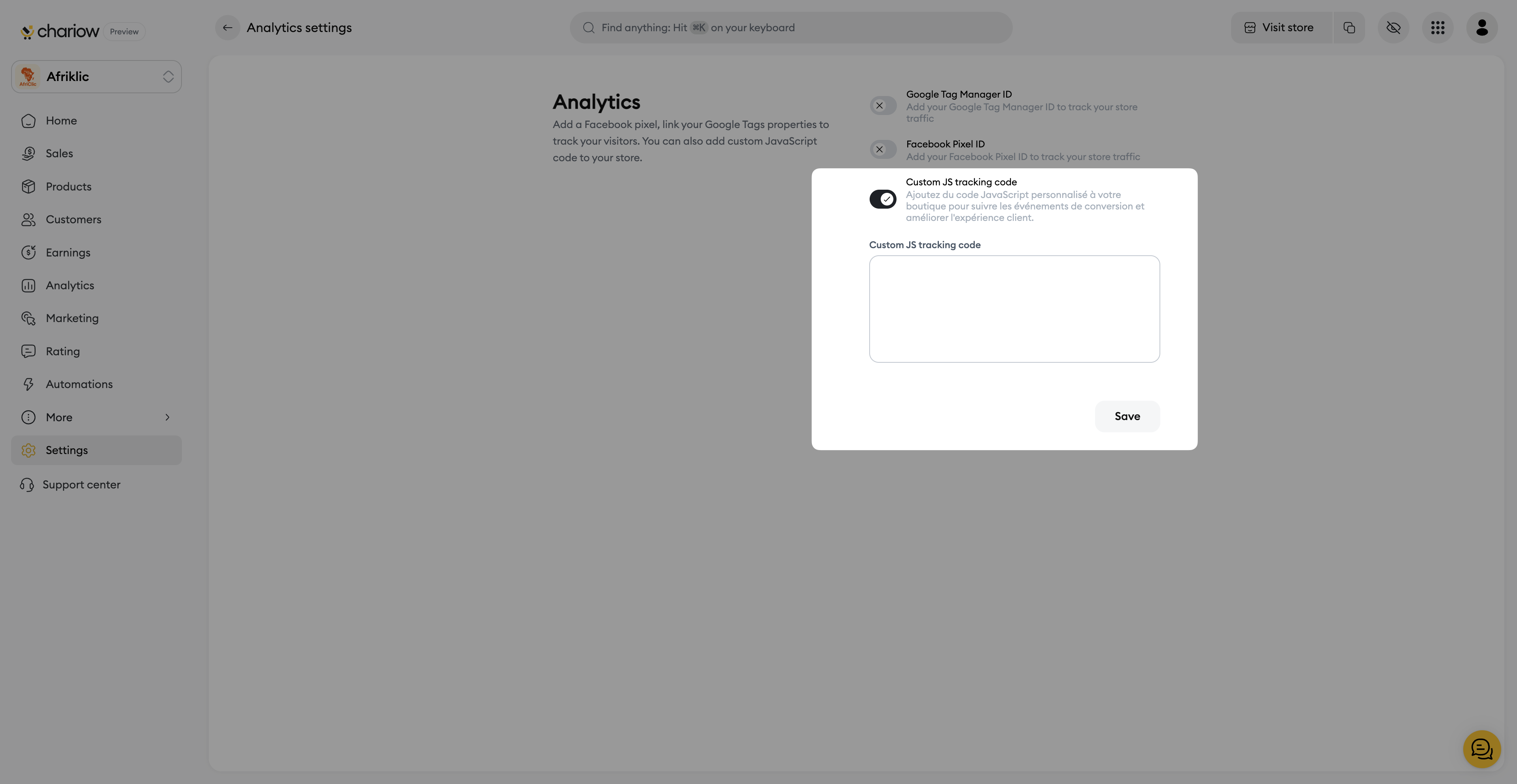 The Analytics Settings section in your Chariow dashboard gives you powerful tools to track your shop’s activity. Along with integrations like Google Tag Manager and Facebook Pixel, you also get the option to add a custom JavaScript code. This feature is perfect for advanced users who want to implement third-party analytics tools or specific scripts for even more detailed tracking of their customers’ behavior.