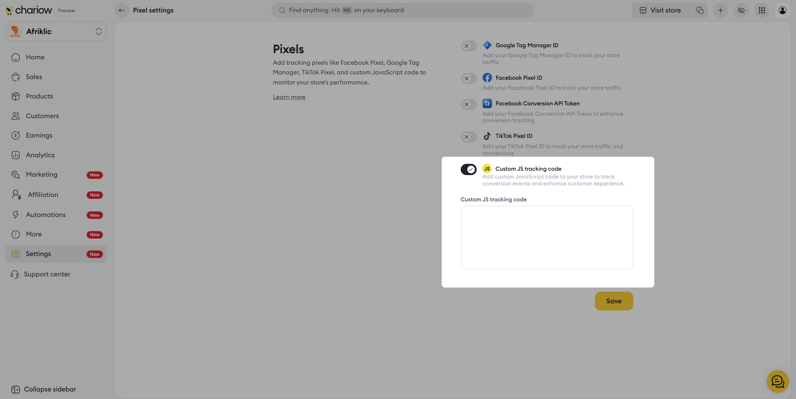 The Pixels & Tracking section in your Settings gives you powerful tools to track your store activity. Besides integrations like Google Tag Manager and the Facebook Pixel, you can also add a custom JavaScript code. This feature is perfect for advanced users who want to implement third-party analytics tools or specific scripts for even more detailed tracking of their customers' behavior.