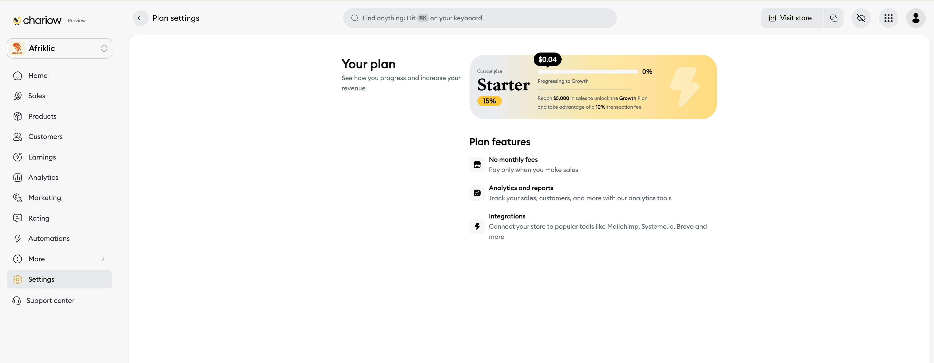 When you’re just starting out on Chariow, your shop runs on the Starter plan.