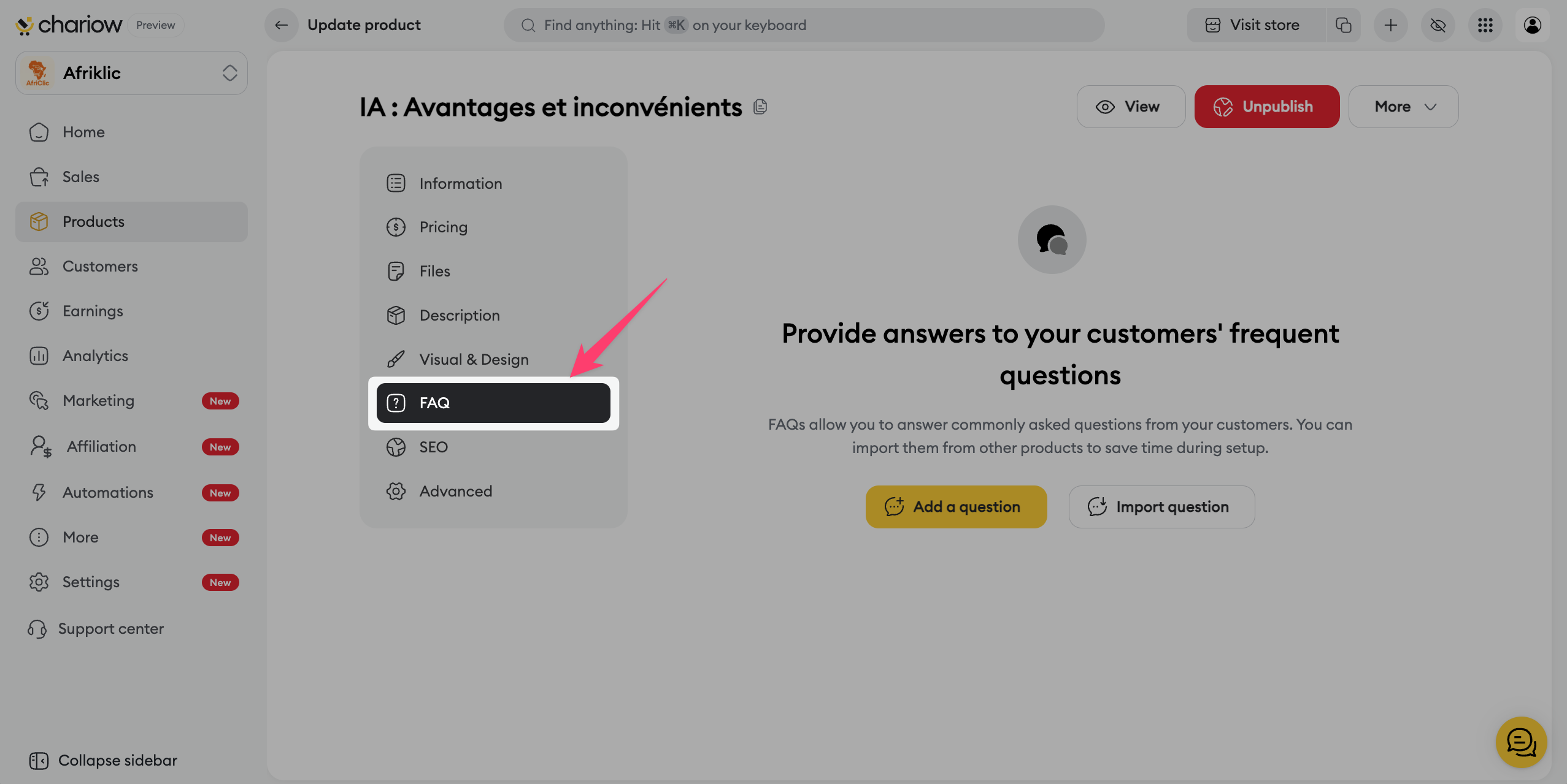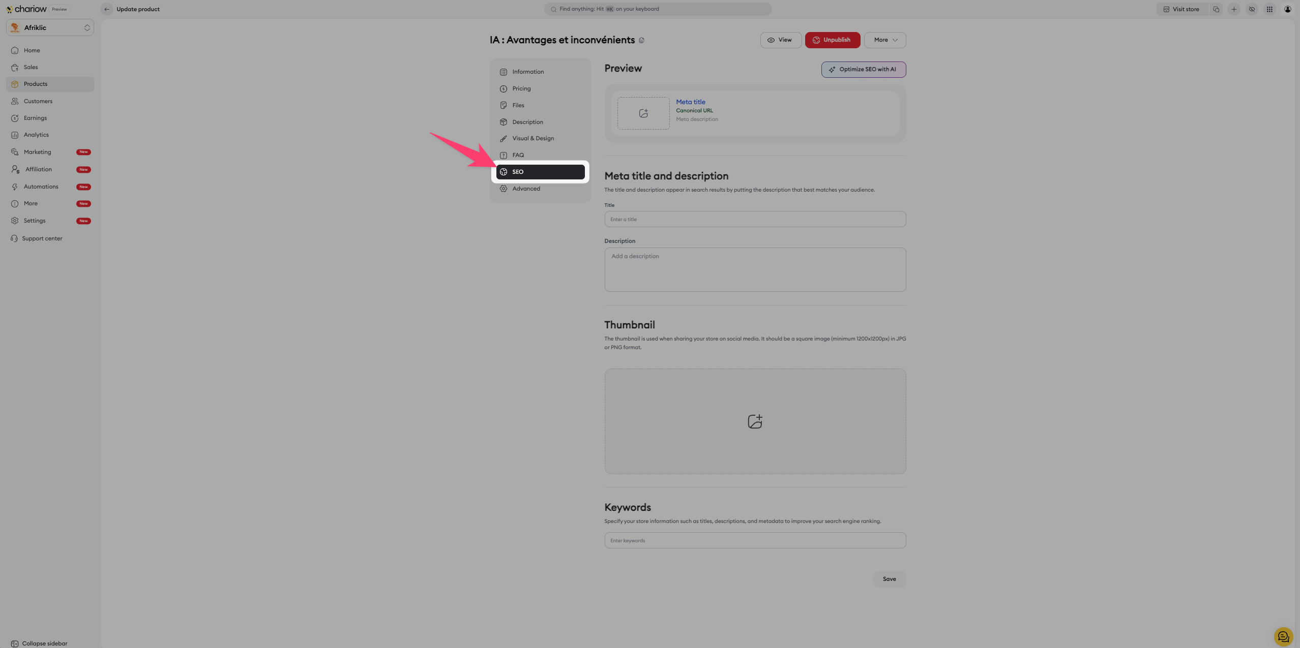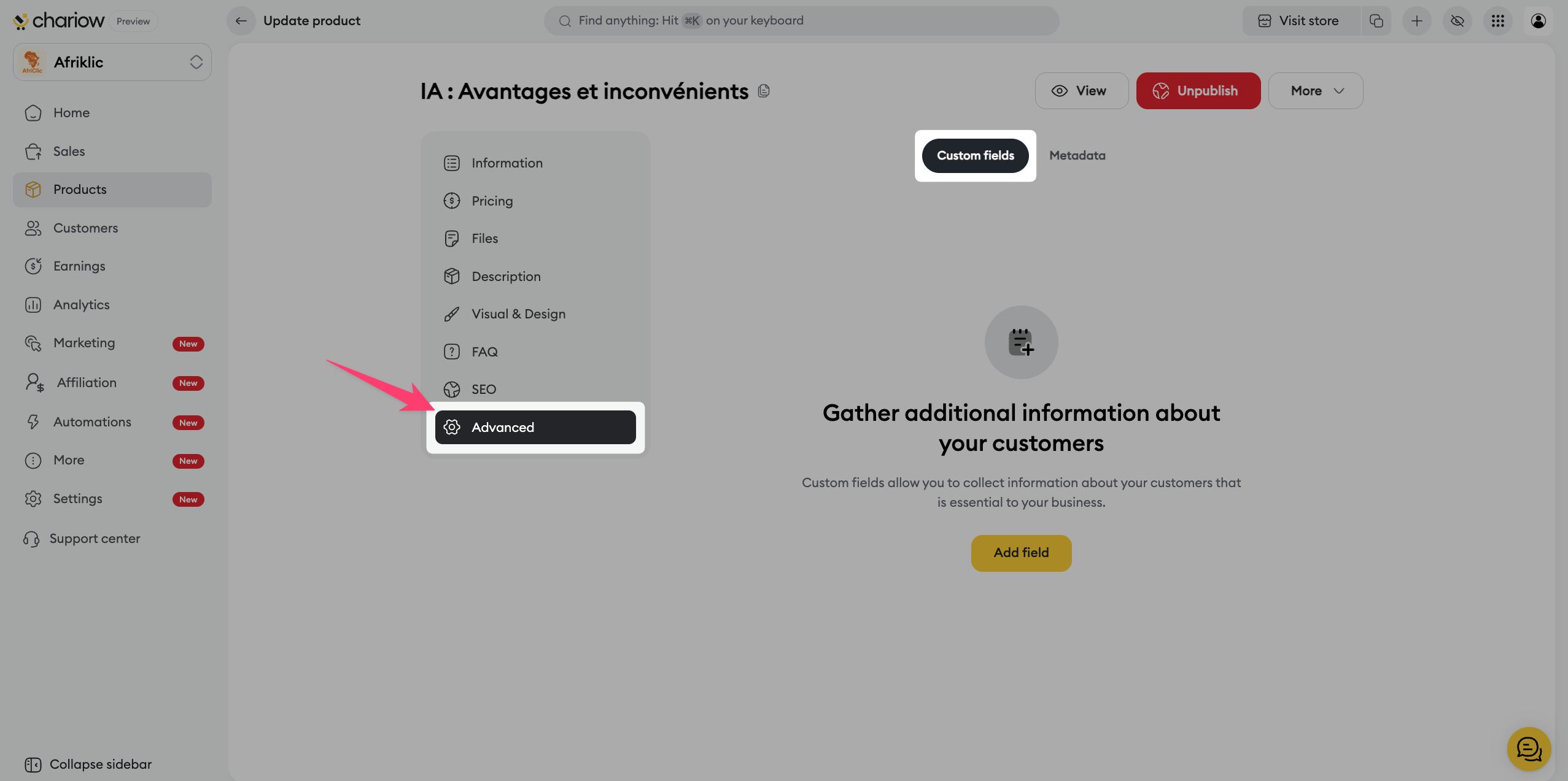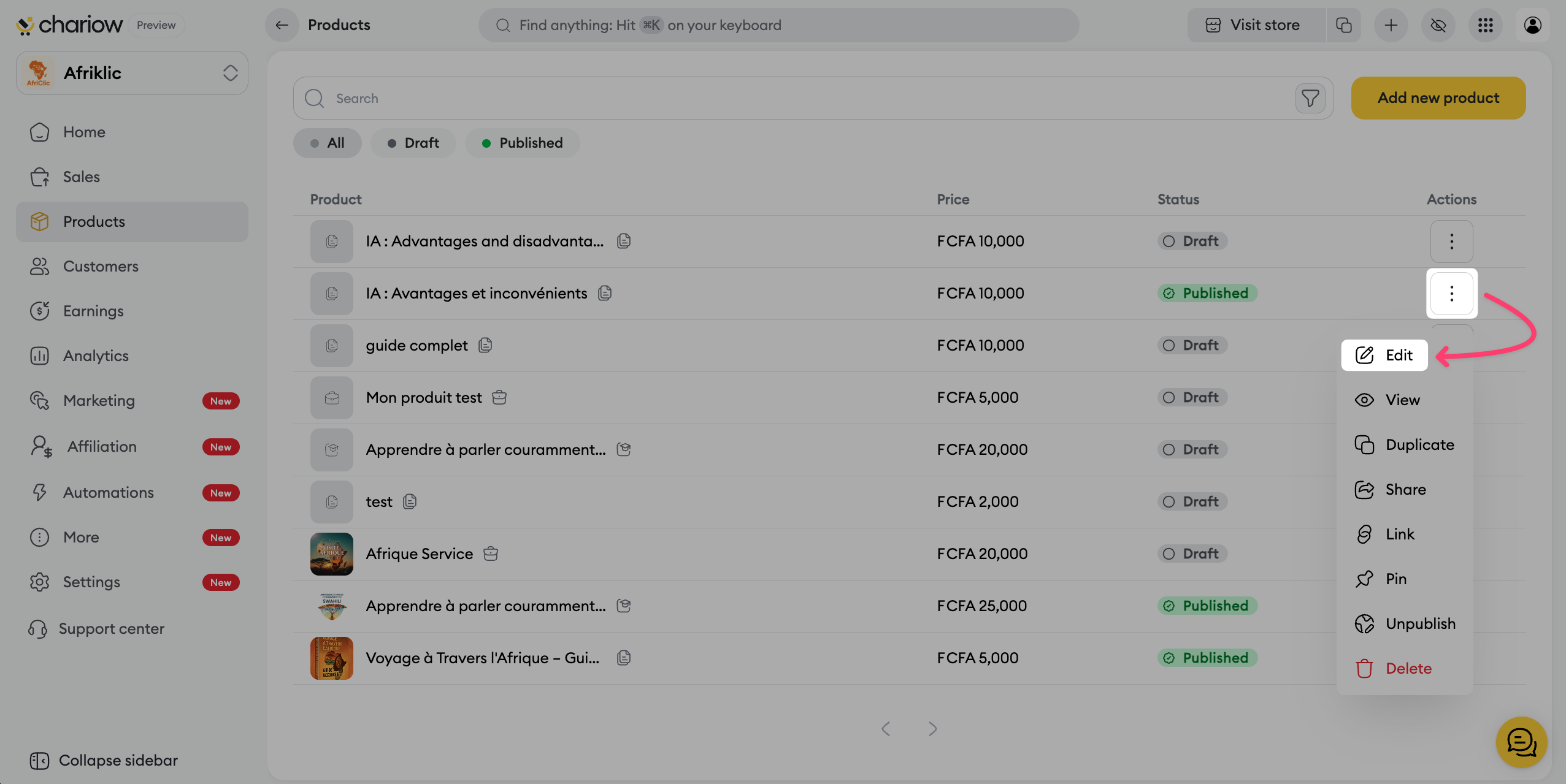 Once your product is created, Chariow lets you access a full control panel to fine‑tune your sales strategy. This article explains how to manage the basic information and redirects you to the specific settings for advanced customization.