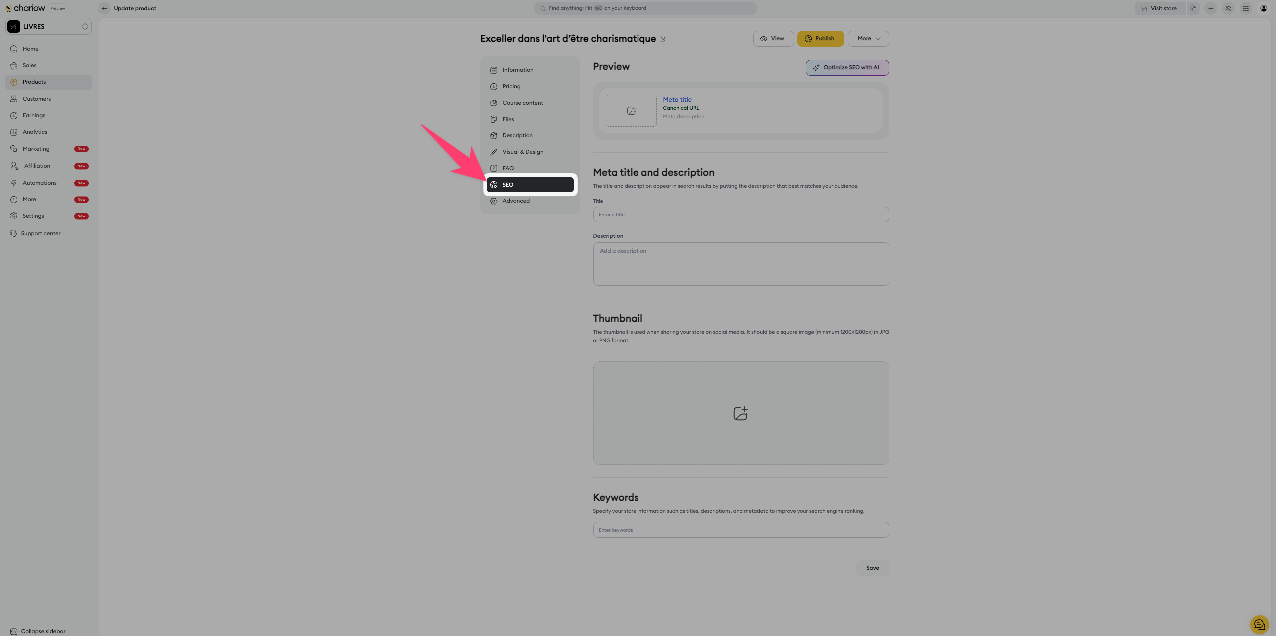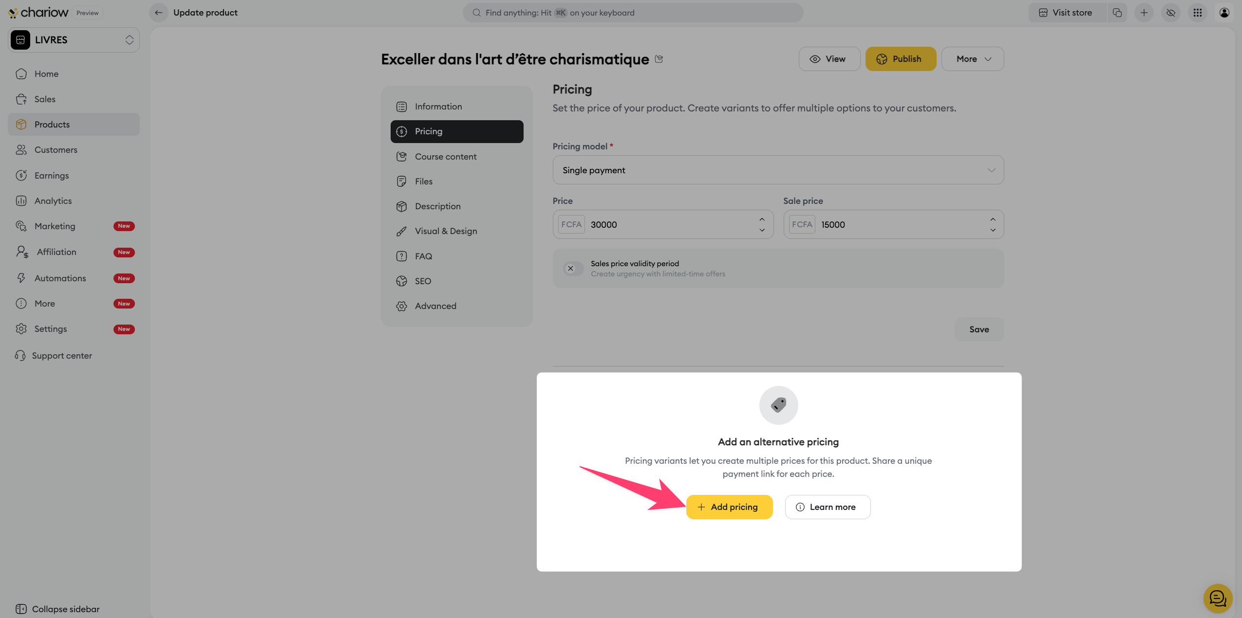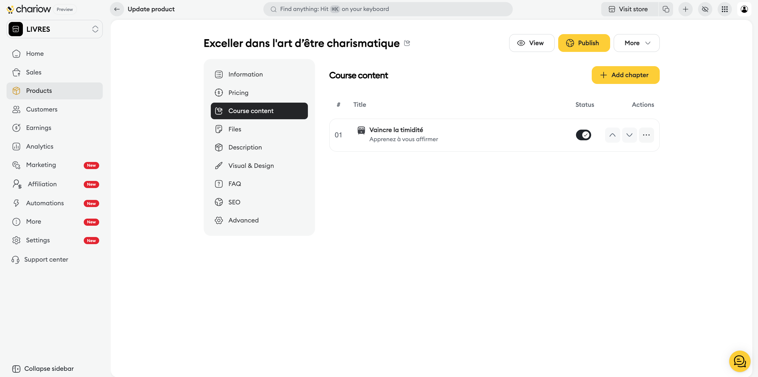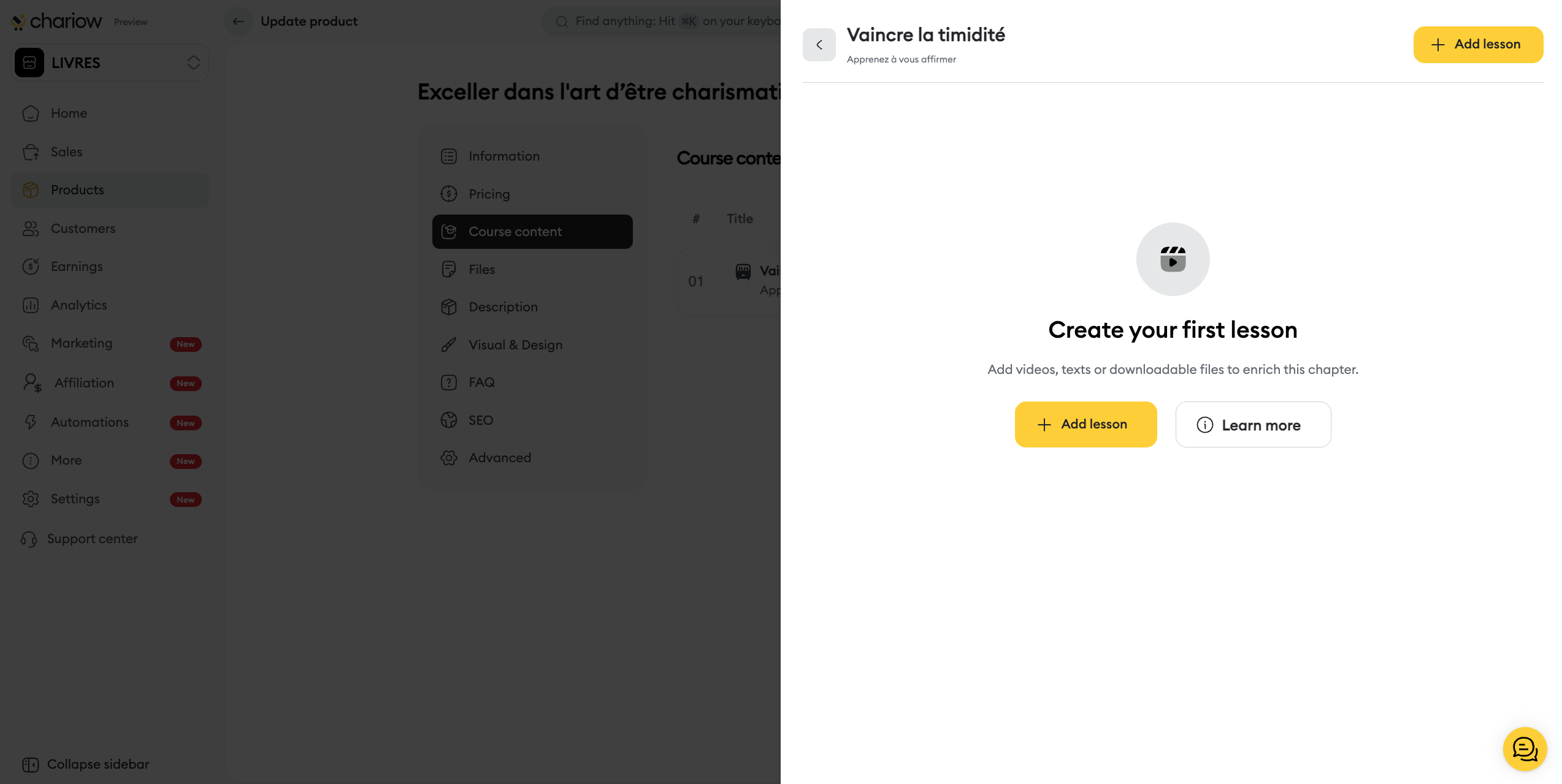 Once your course is created, Chariow lets you access a full control panel to manage your lessons, secure your content, and optimize your sales. This guide details the options specific to the "Courses" type that become available after the initial publication.