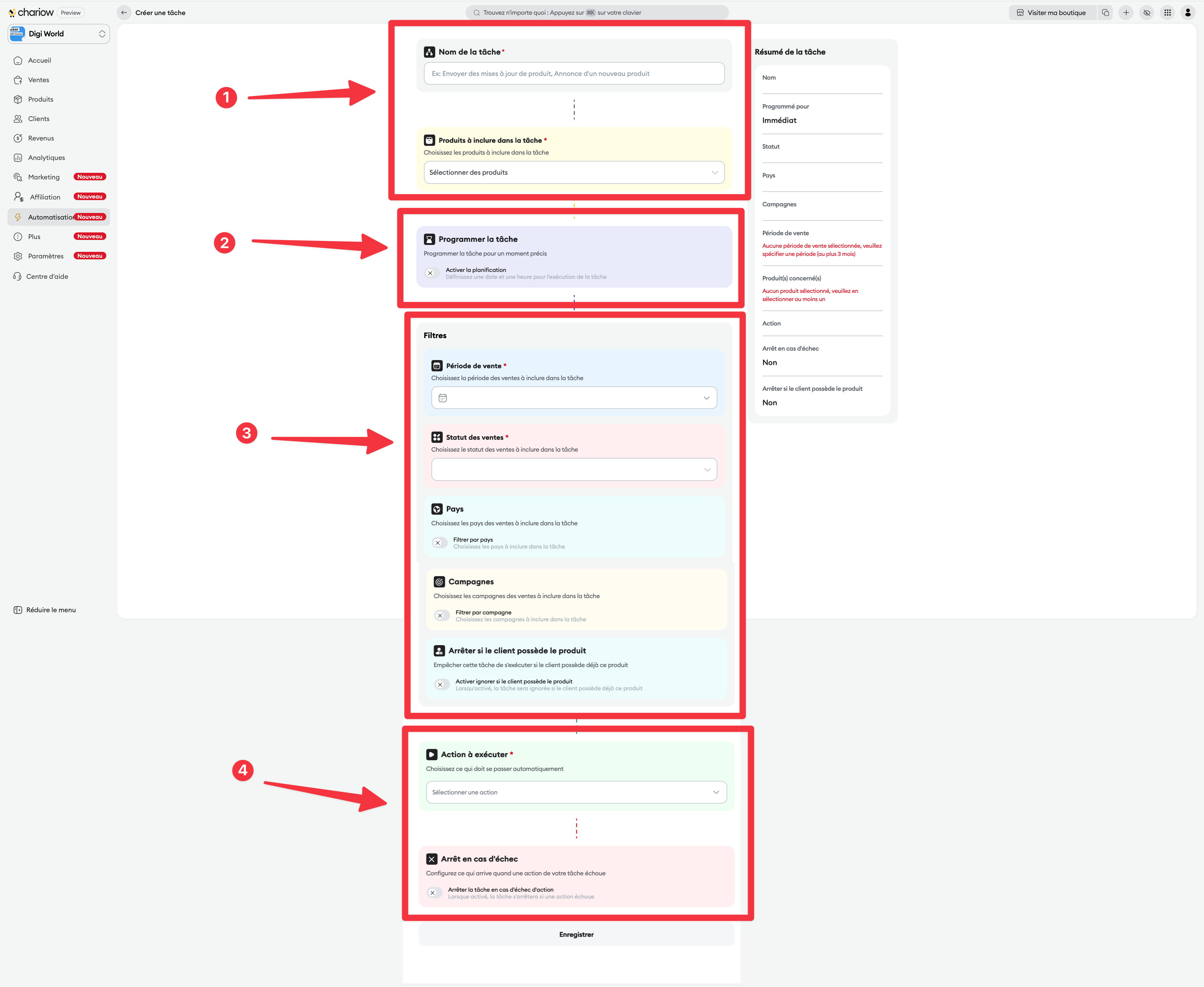 Action to perform : Choose what should happen automatically (e.g.: "Send an email" or "Send a WhatsApp message").