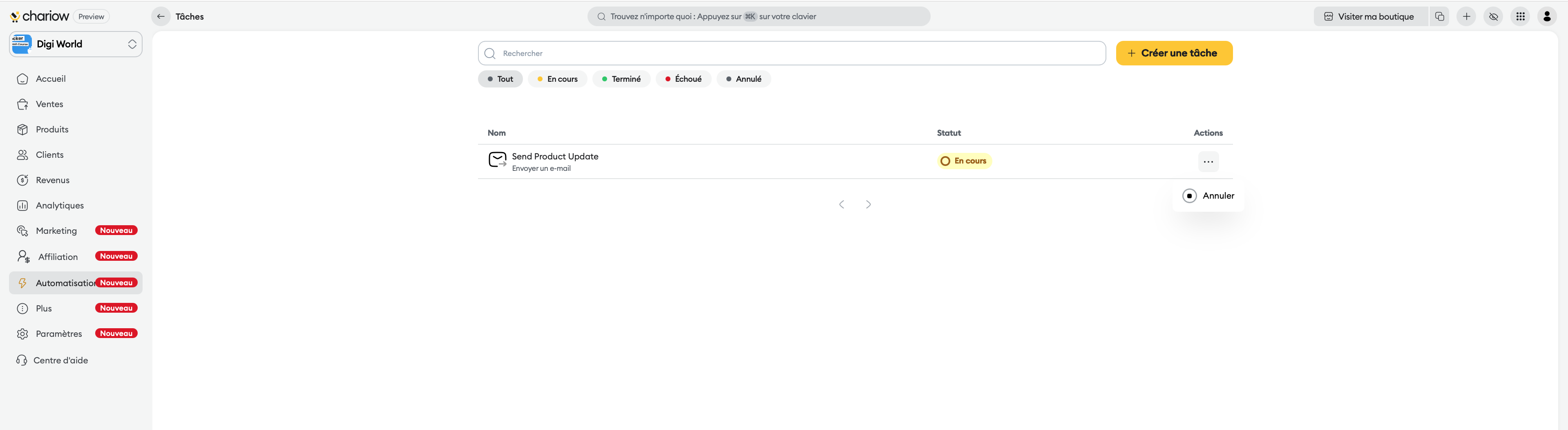 Cancel a task: For a pending or in-progress task, click the three dots (...) in the Actions column, then select "Cancel".