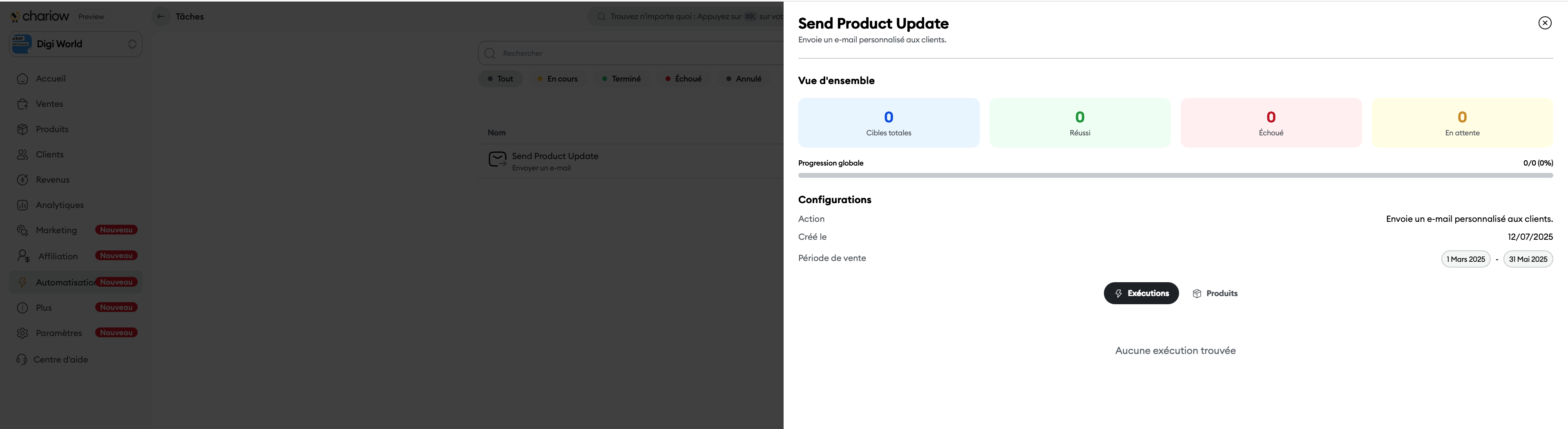 Tasks Tasks are automations designed for batch actions, whether they’re immediate or scheduled. They let you interact with a specific customer base based on historical sales criteria, saving you valuable time on your marketing and operational processes.