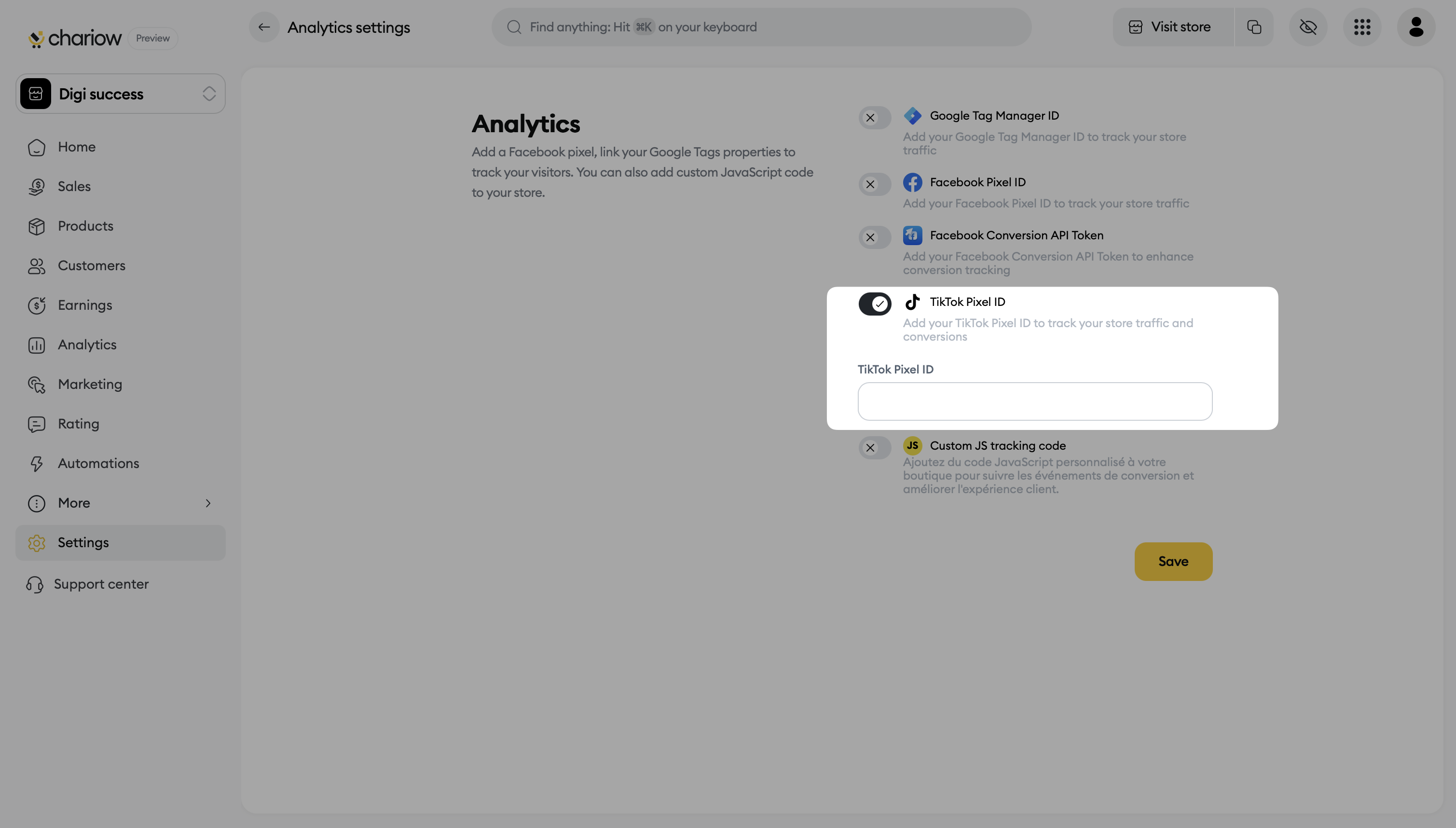 The TikTok Pixel is a powerful ad analytics tool that lets you measure how well your marketing campaigns are doing, understand your visitors’ behavior, and boost your sales on your Chariow store. By installing it, you’ll be able to track conversions, build custom audiences, and retarget users who are interested in your products.