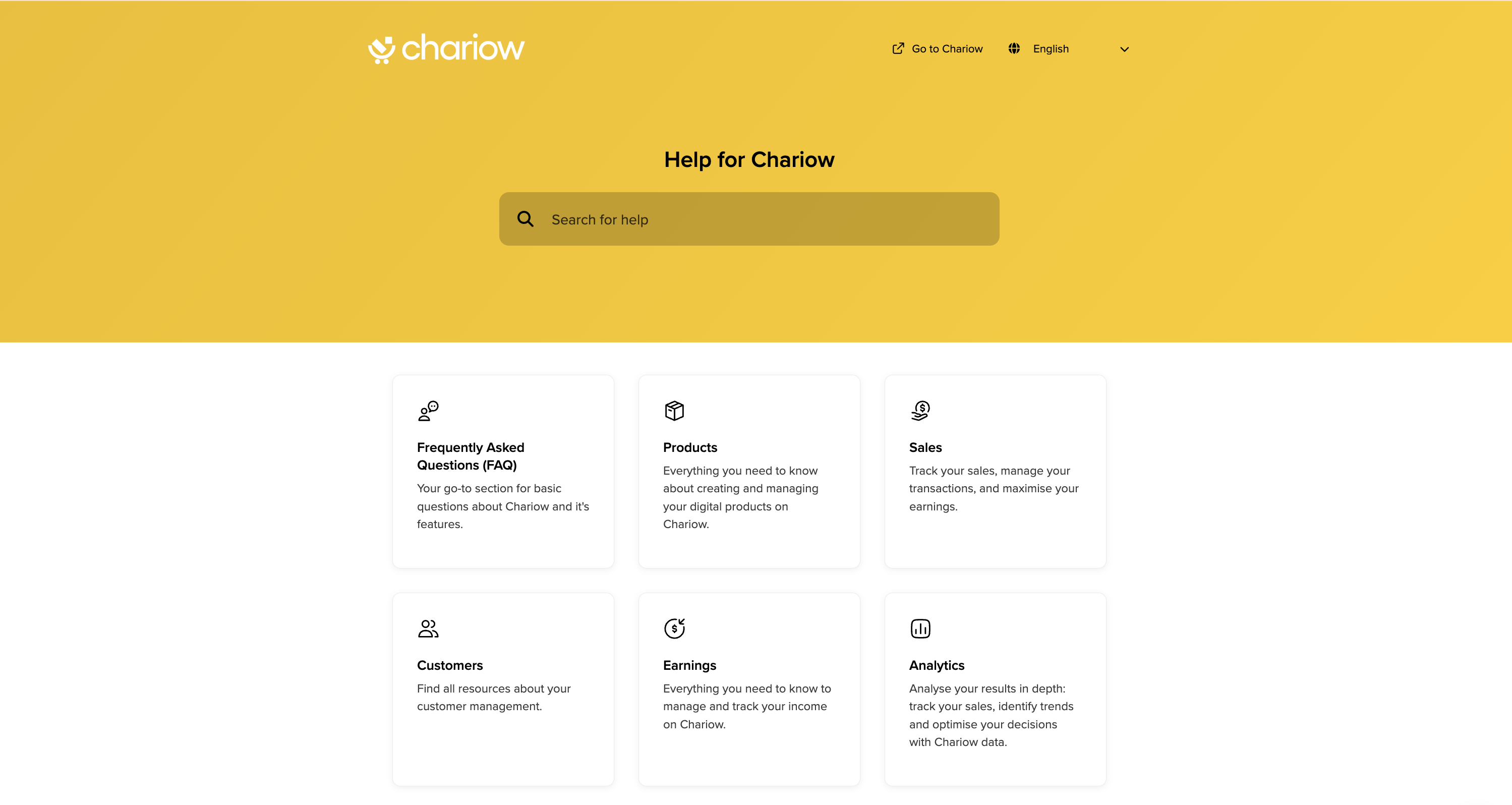 Access: Directly via https://help.chariow.com/ or through the "Help Center" link in your Chariow dashboard.