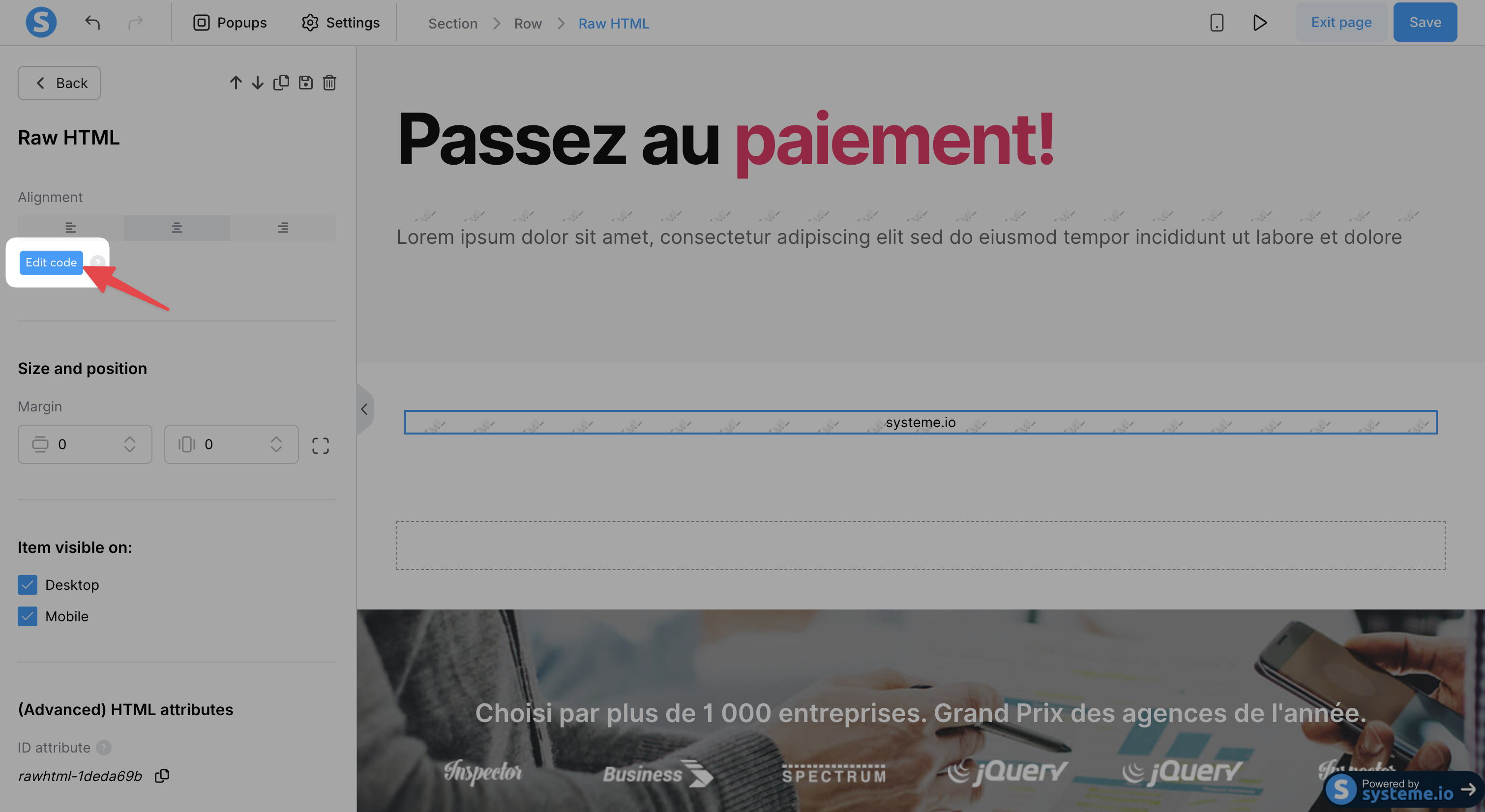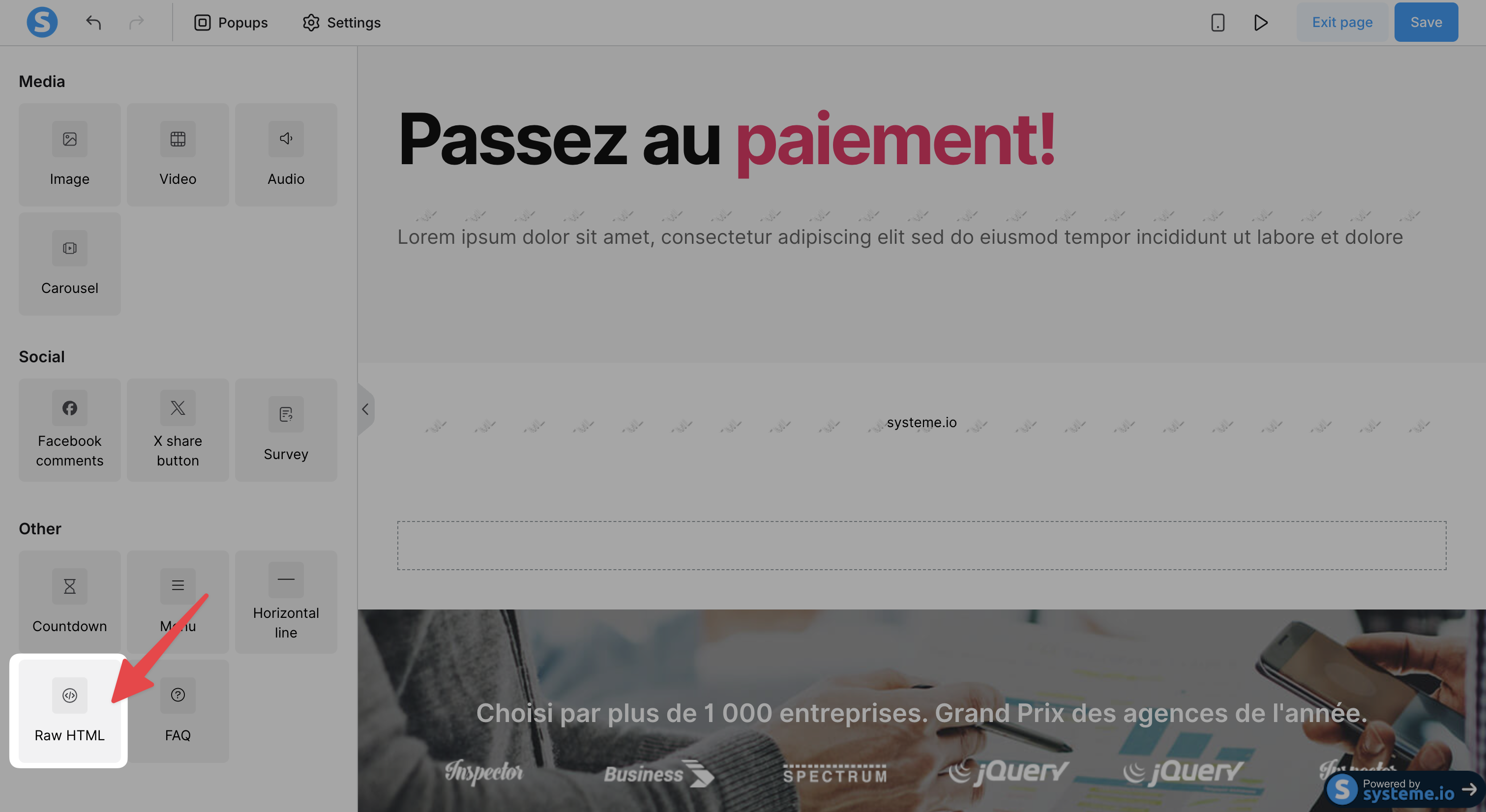 Systeme.io is a popular platform for creating sales funnels, landing pages, and websites. Integrating Chariow’s 'Snap' code is done through the 'Raw HTML' element in the page editor.