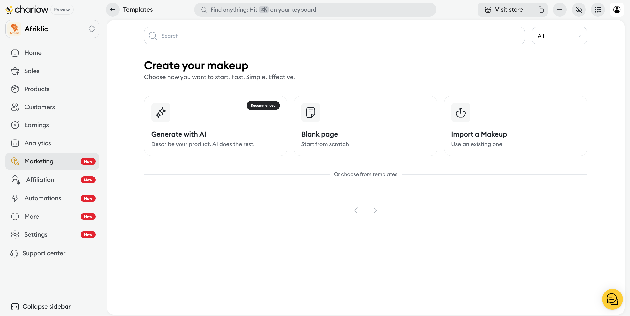 Existing templates: You can pick a pre-designed template by Chariow or one you've saved earlier. This helps speed up page building with a tried-and-tested structure.