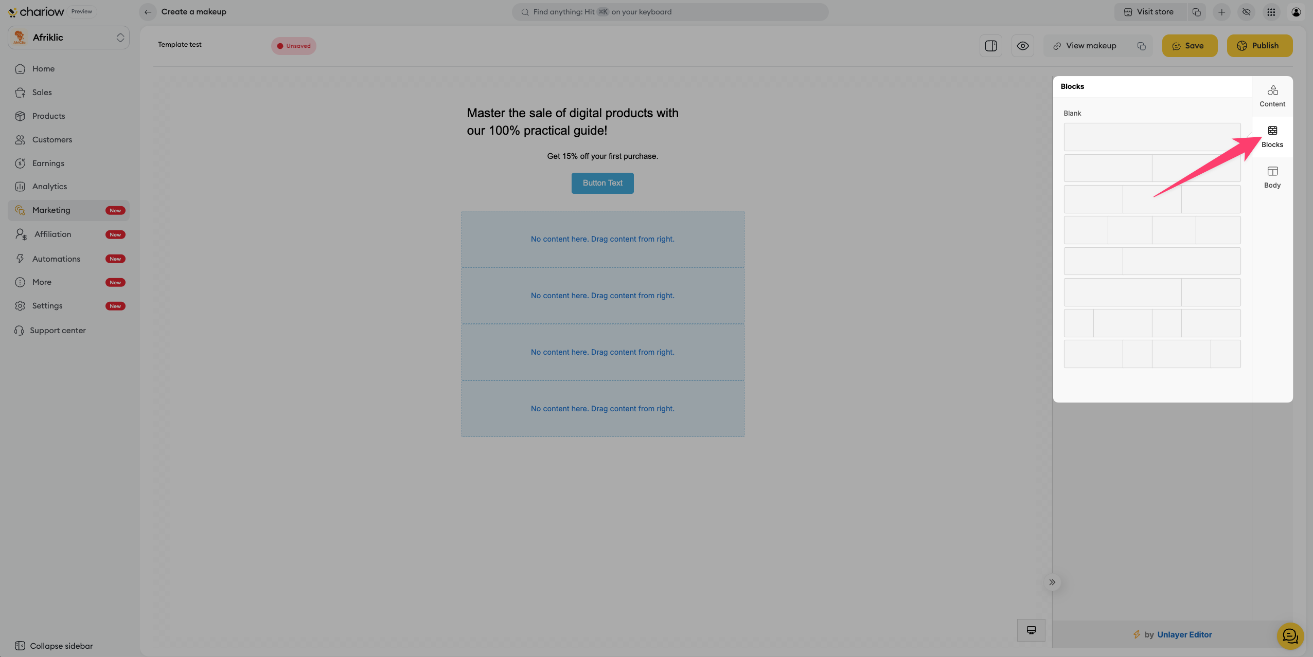 In the navigation menu on the left of your Chariow dashboard, click Marketing.