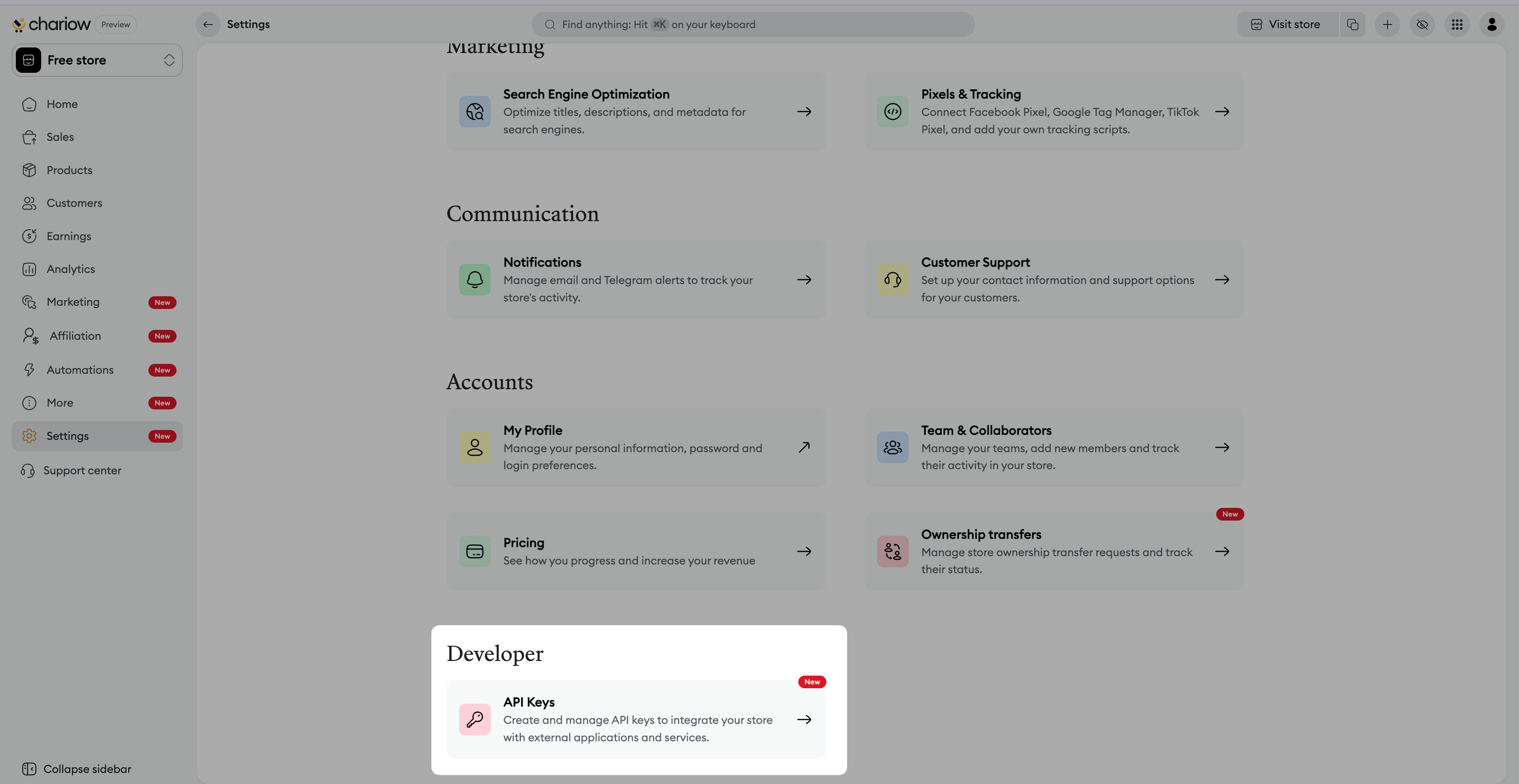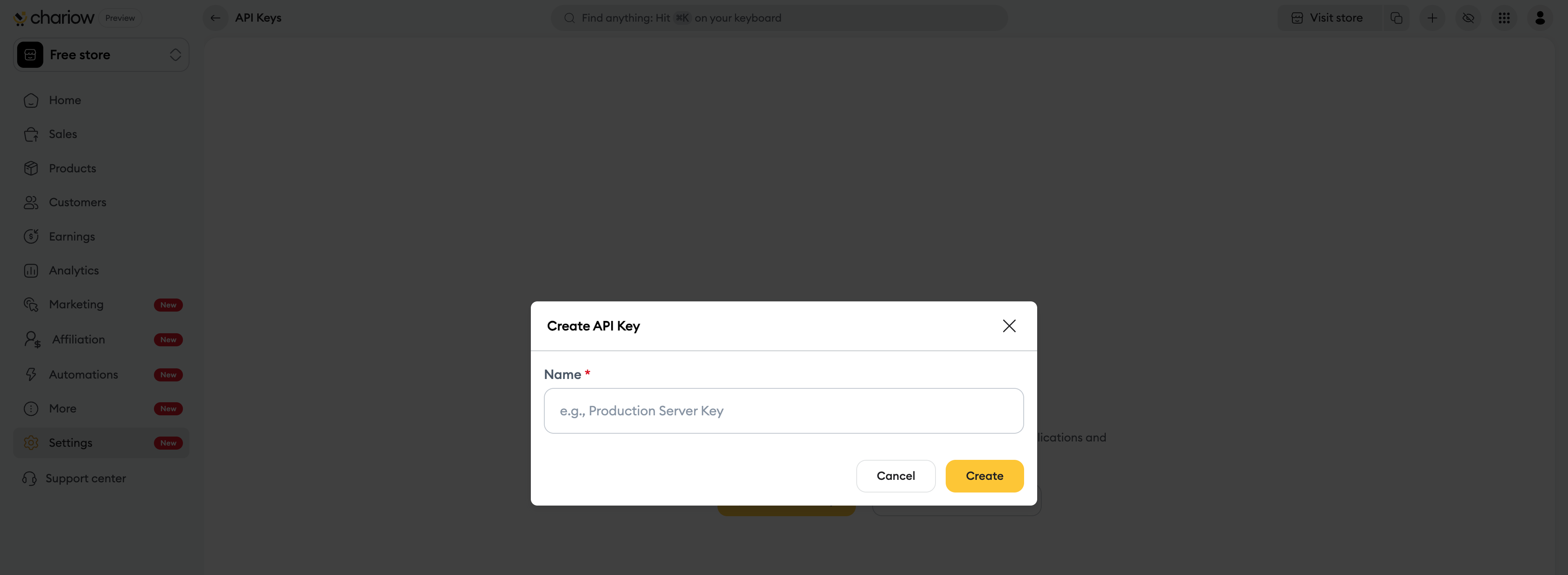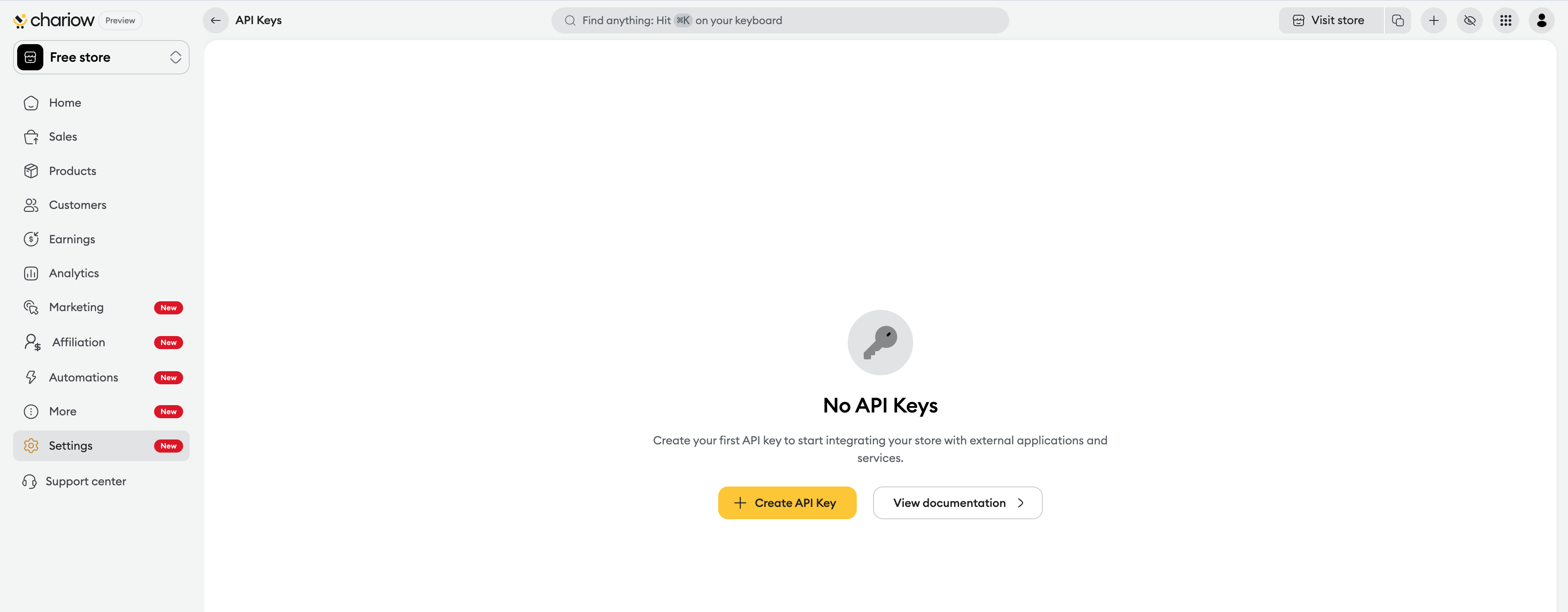 API Keys let you securely connect your store to third-party tools (like automation platforms or analytics services). They act as an identifier to authorize these services to communicate with your Chariow data.