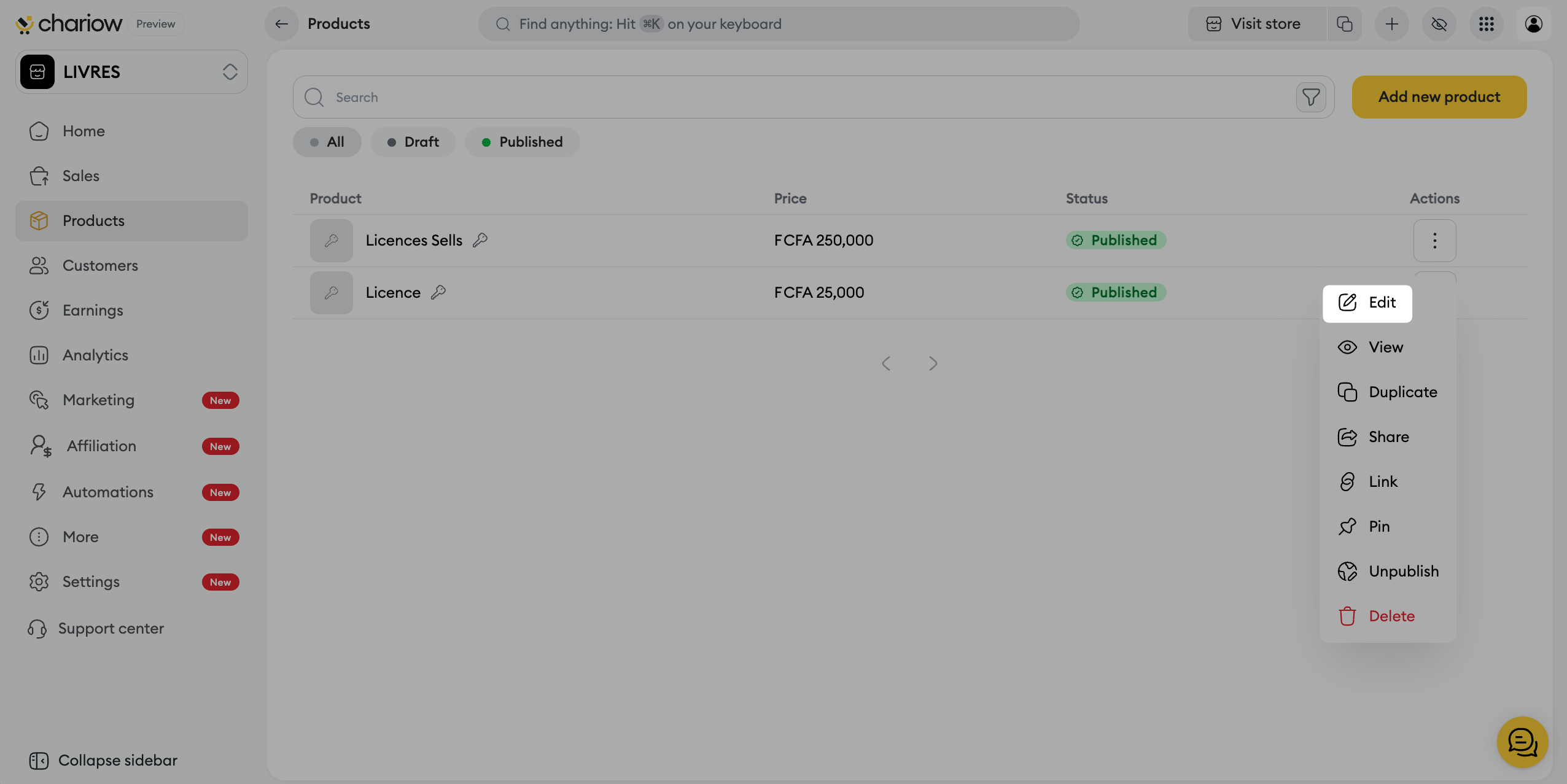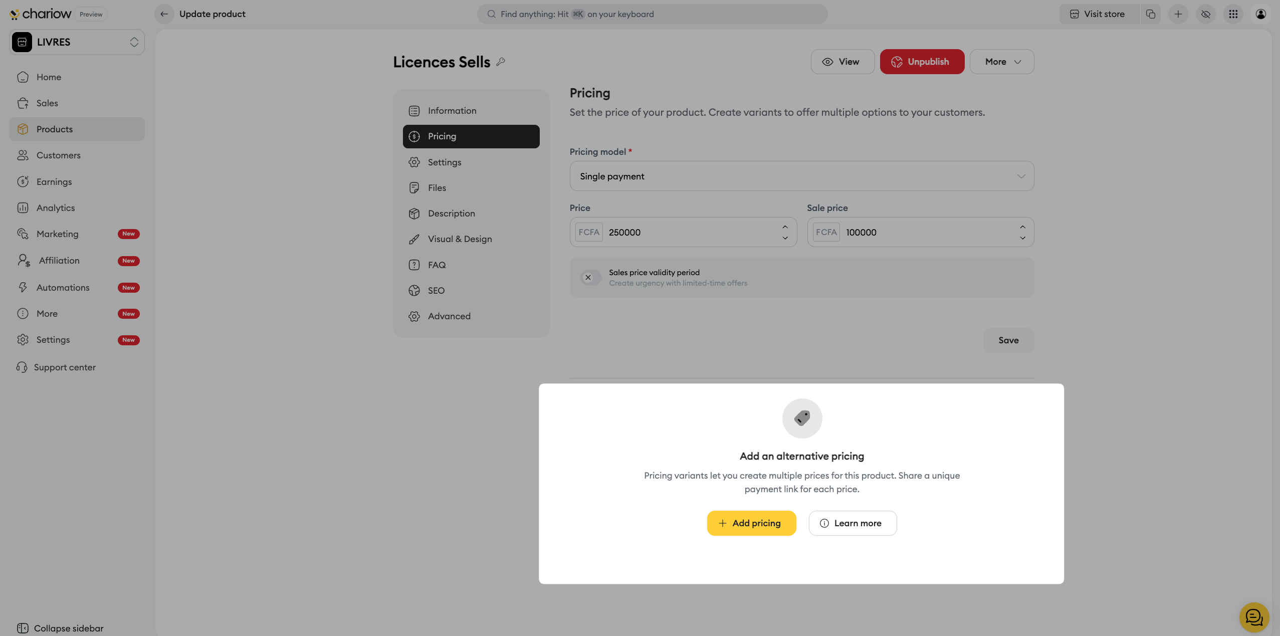 Chariow lets you offer several purchase options for the same product: