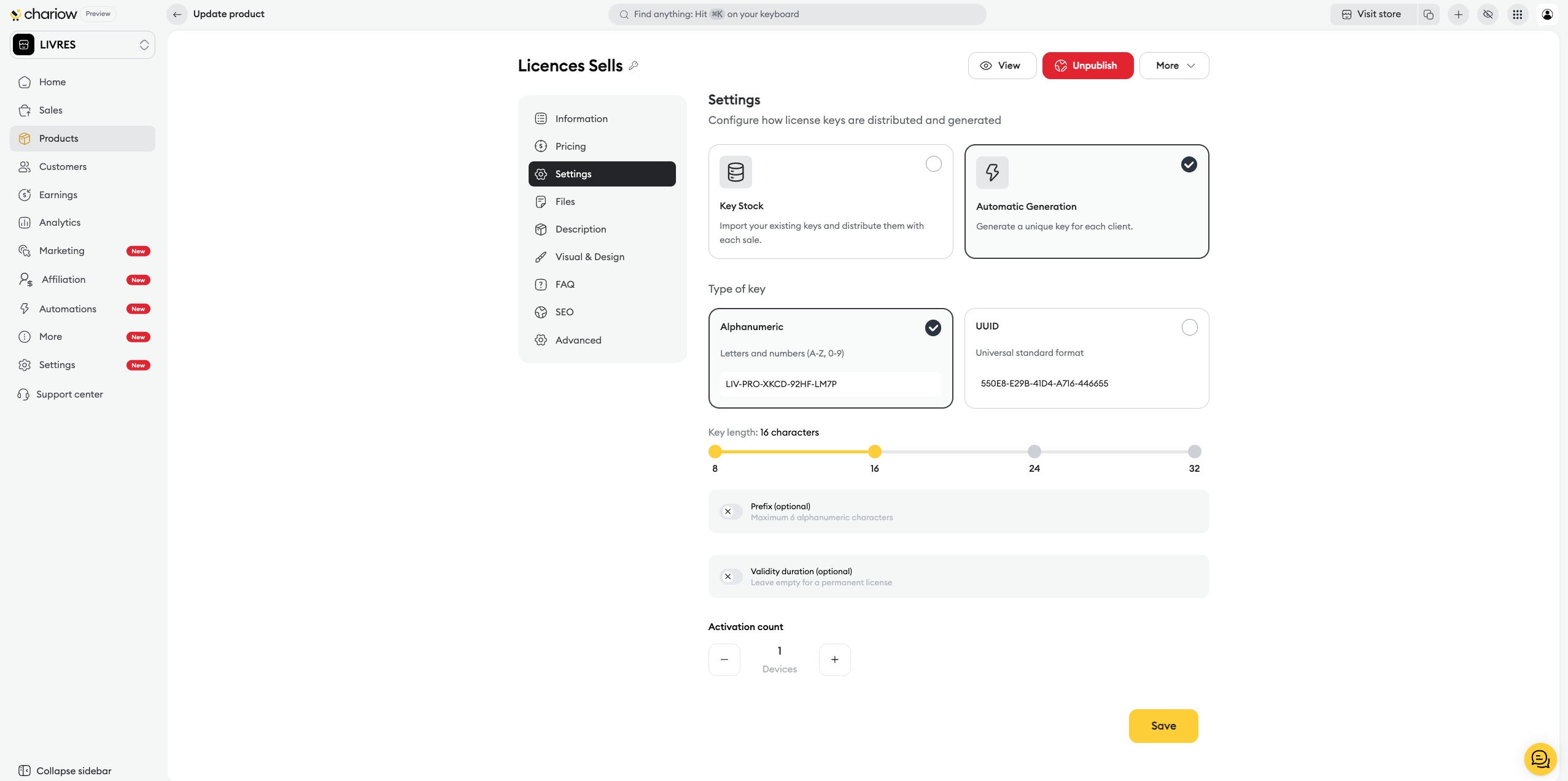 Key format: Set up the type (Alphanumeric or UUID), the length, the prefix, as well as the number of activations allowed per key.