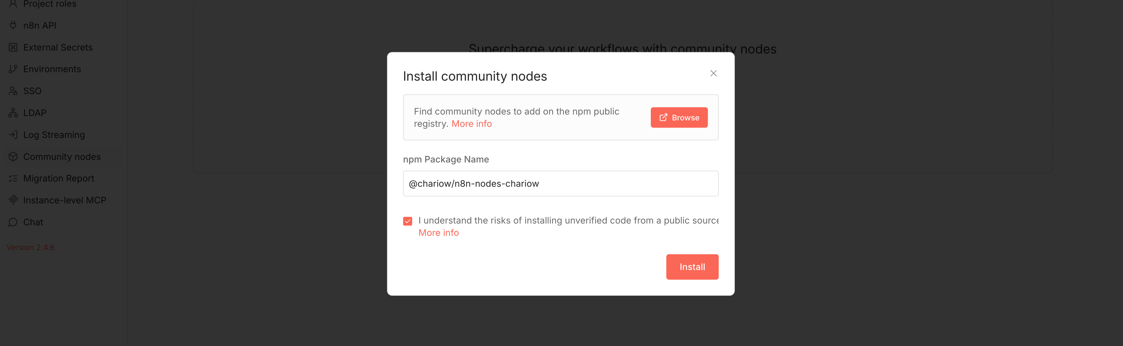 docker exec -it n8n npm install @chariow/n8n-nodes-chariowTo link n8n to your store:
