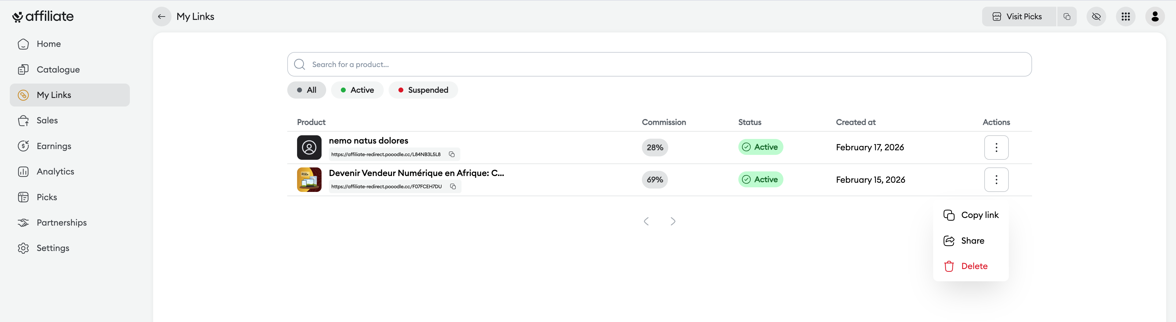 As soon as you click on "Generate an affiliate link" in the catalog, the product is automatically added to this section. You can track the status of your links there (Active or Suspended), share them, and access precise statistical data for each item.