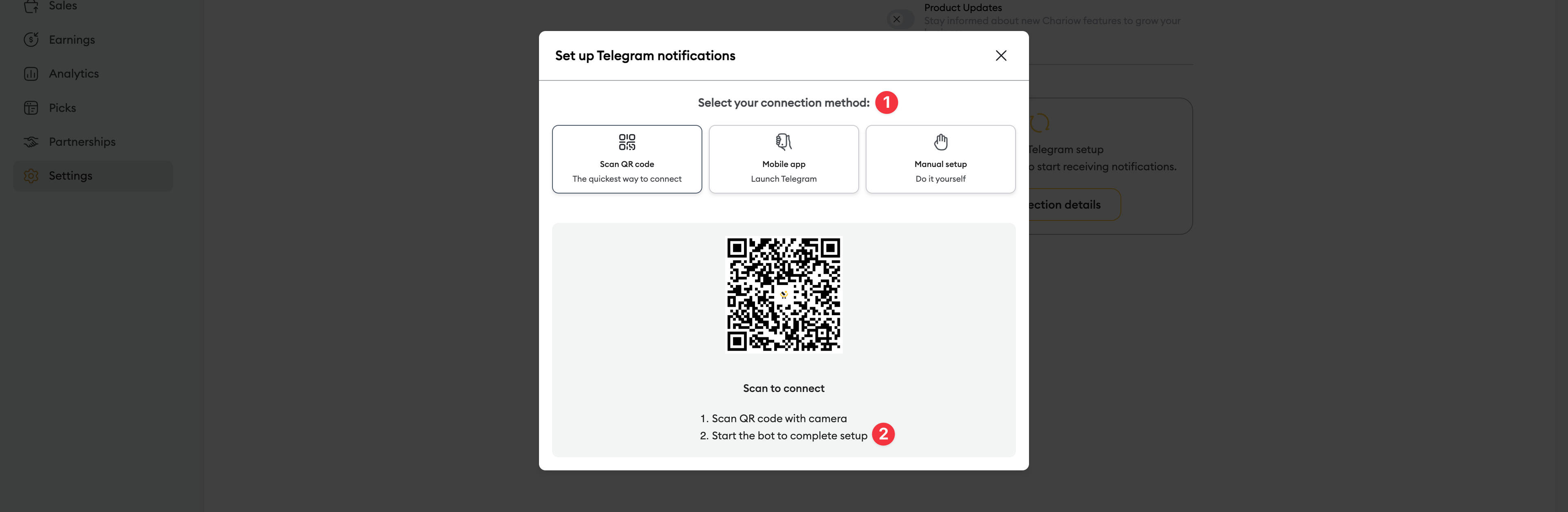 Chariow's Telegram bot lets you receive instant updates from your store (sales alerts, daily summaries) directly on your phone. It's the perfect tool to track your activity in real time.