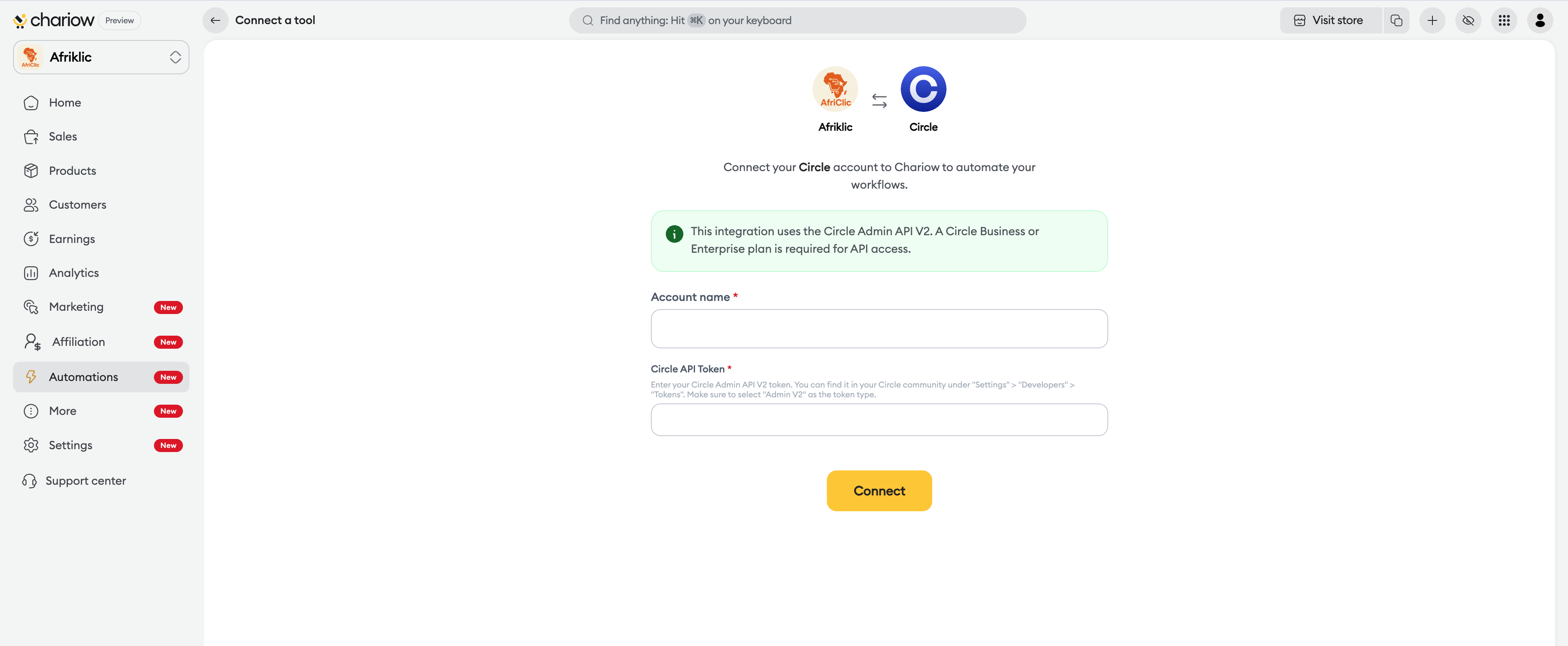 Once you've retrieved your token, finish the connection on Chariow: