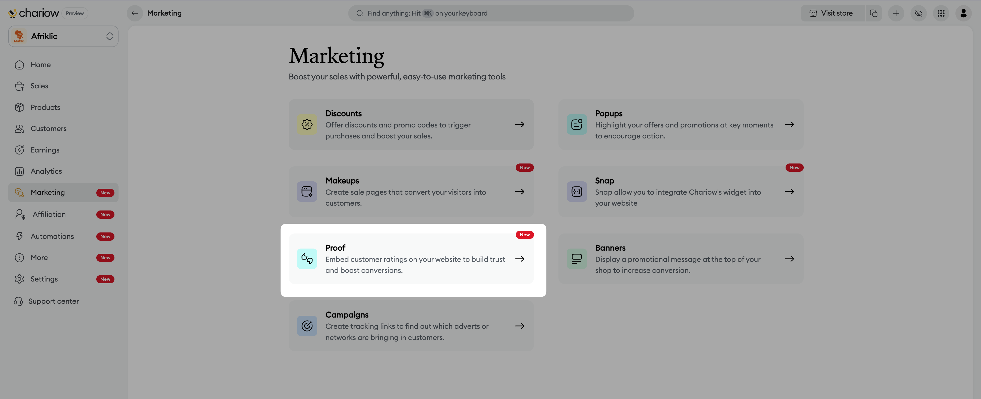 Access to the Marketing menu : From your dashboard, click on the Marketing tab in the side menu.