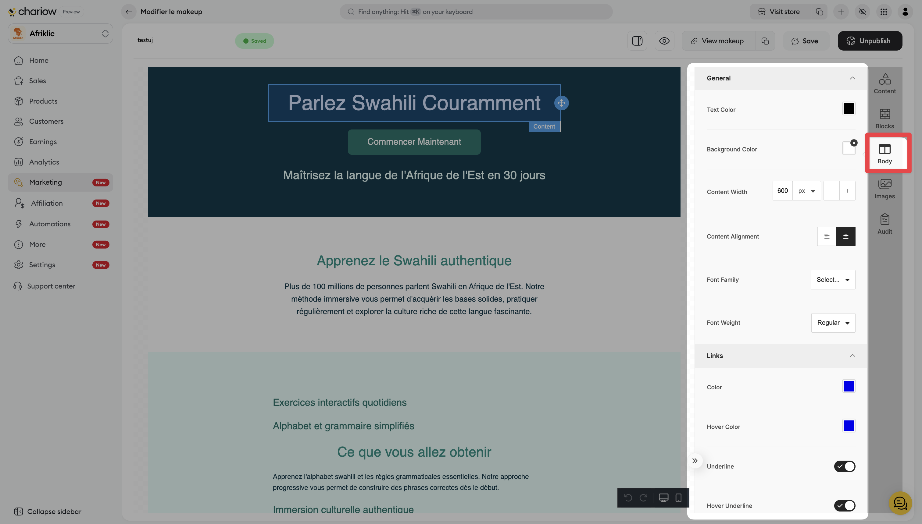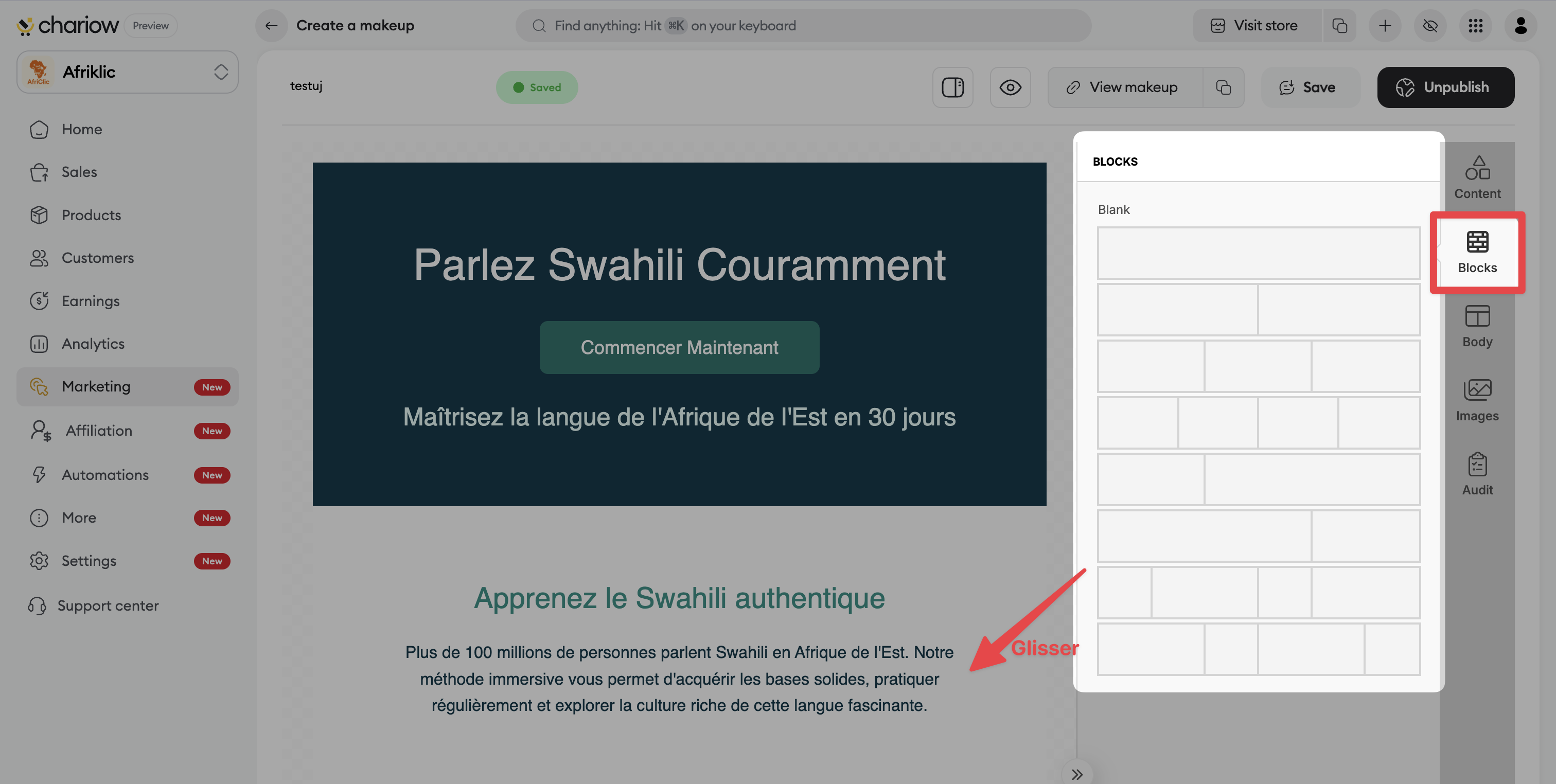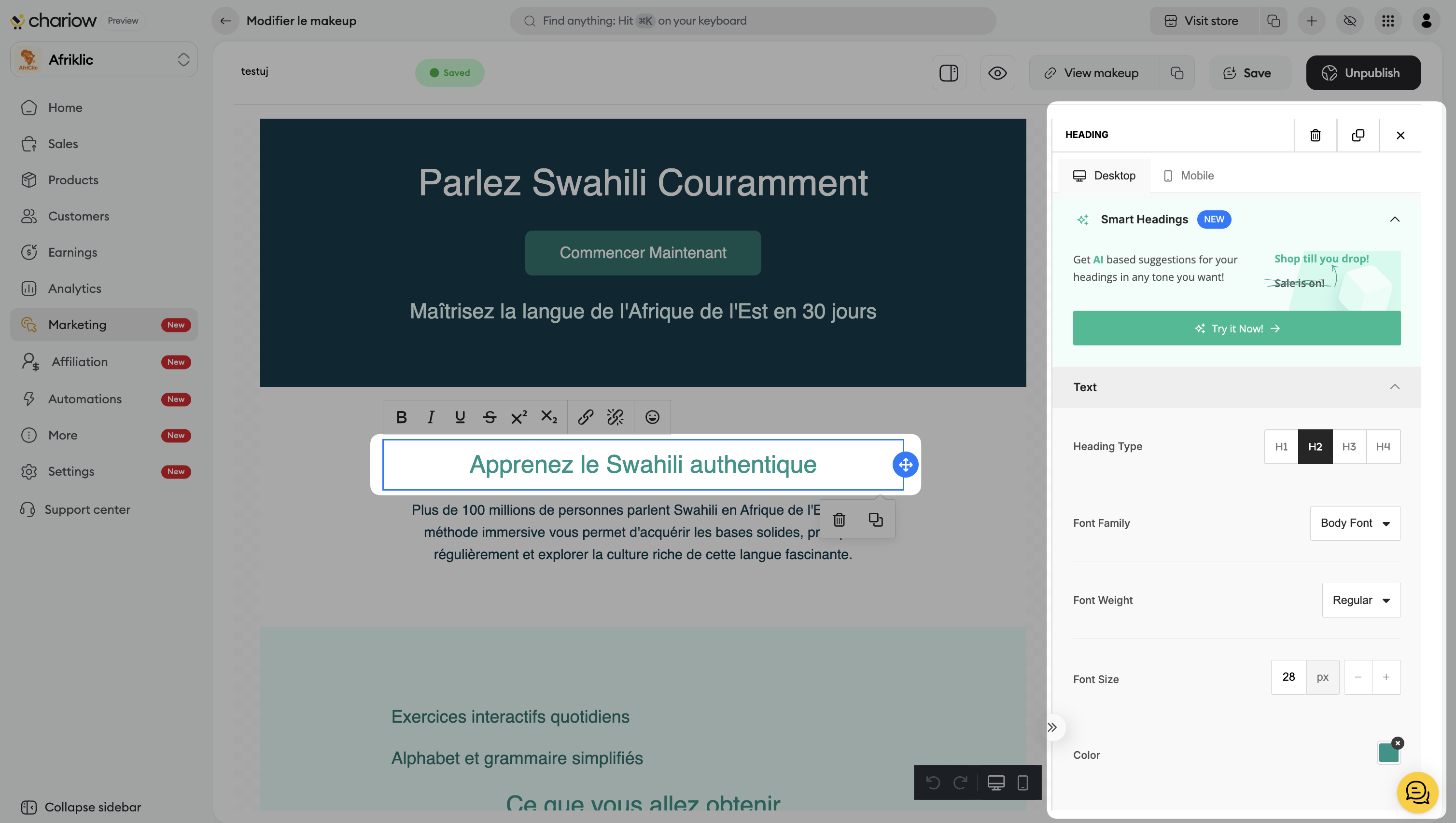 The Makeup editor is the central tool to turn your visitors into customers. Thanks to its intuitive interface, you can structure your pitch, illustrate your offer, and configure your purchase buttons without any technical skills.