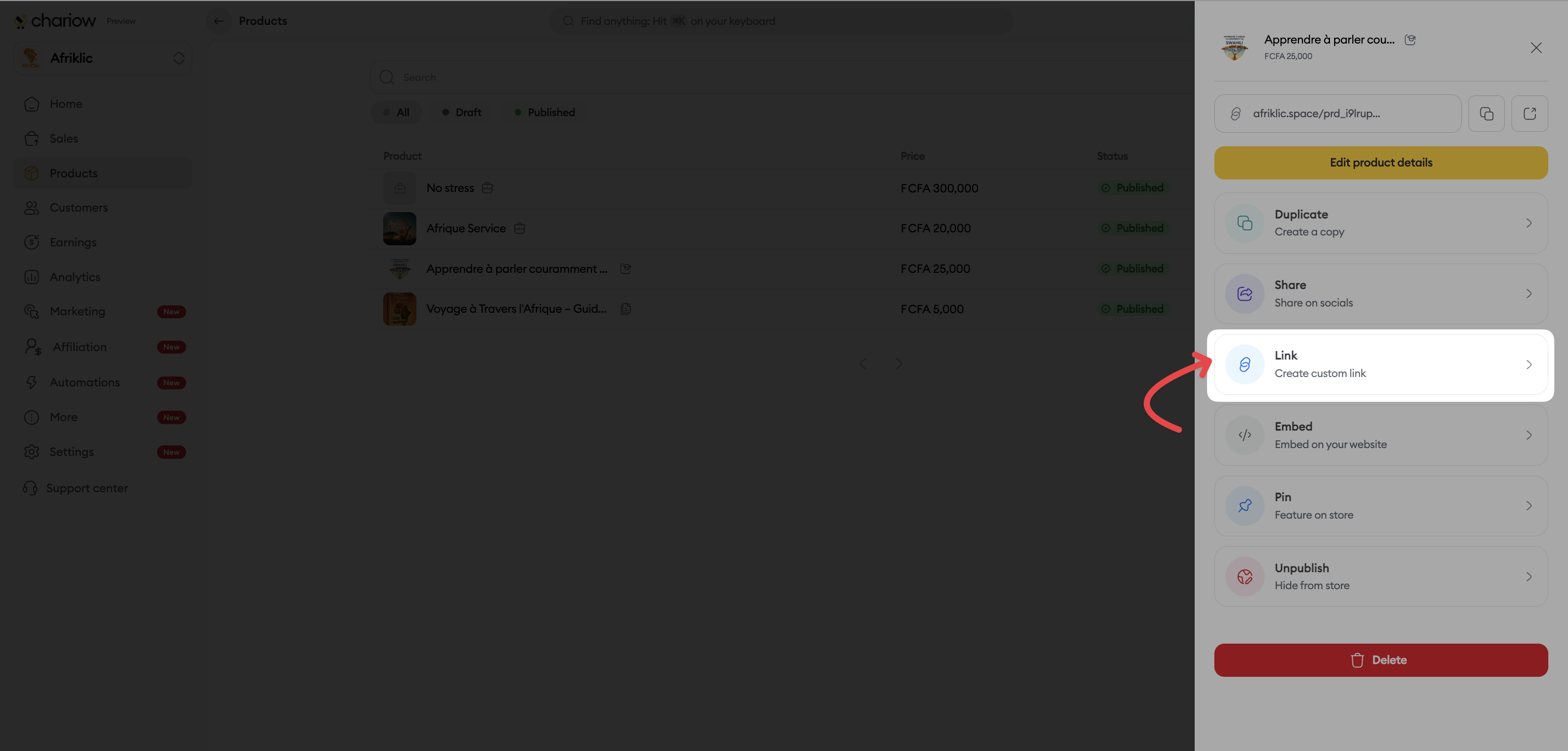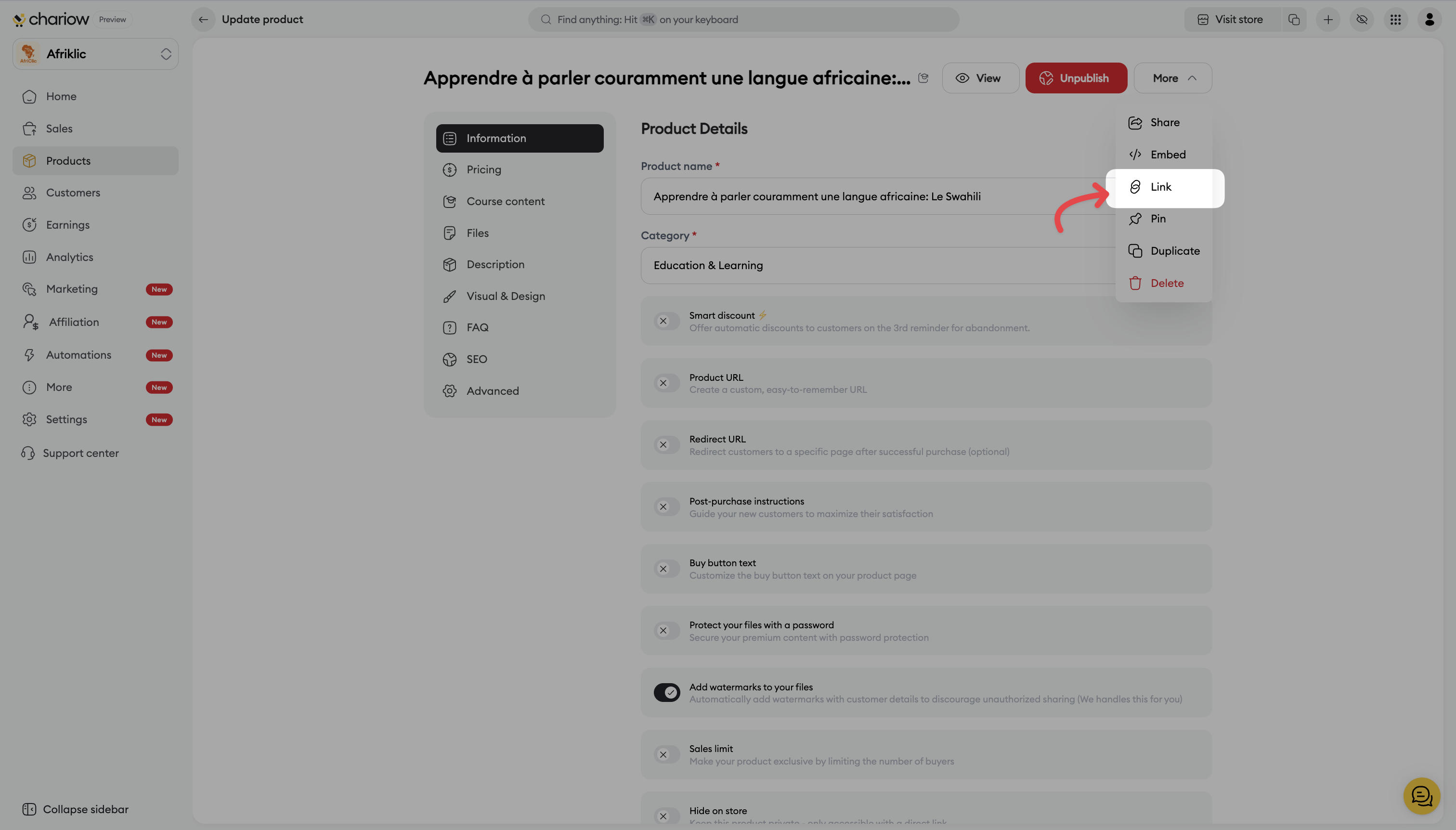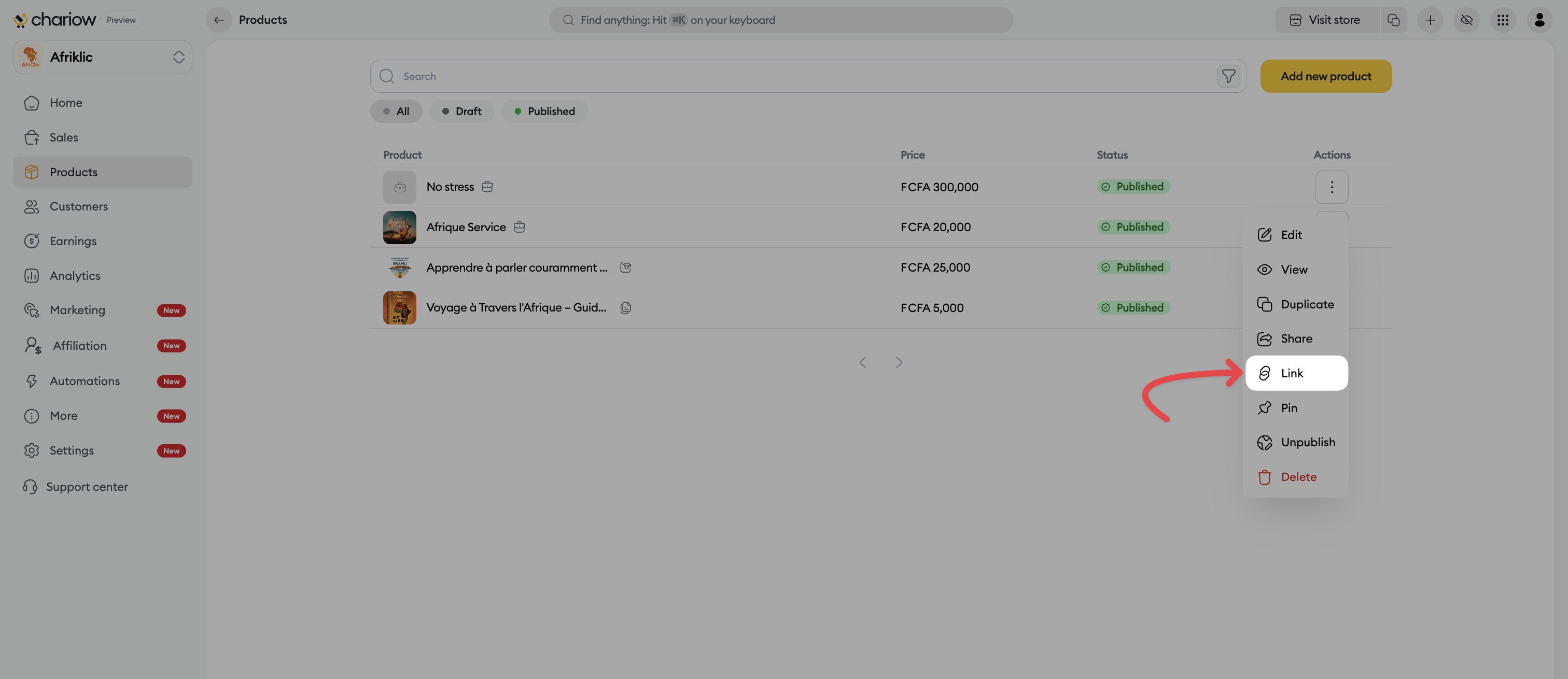 From the product list: Click on the three vertical dots (⋮) at the end of the product row and select the Link option.