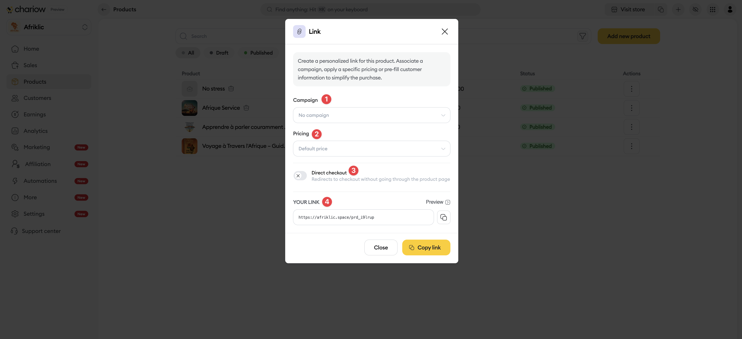 Direct access to payment : Turn on this toggle so the link sends the user straight to the checkout, without going through the product presentation page.