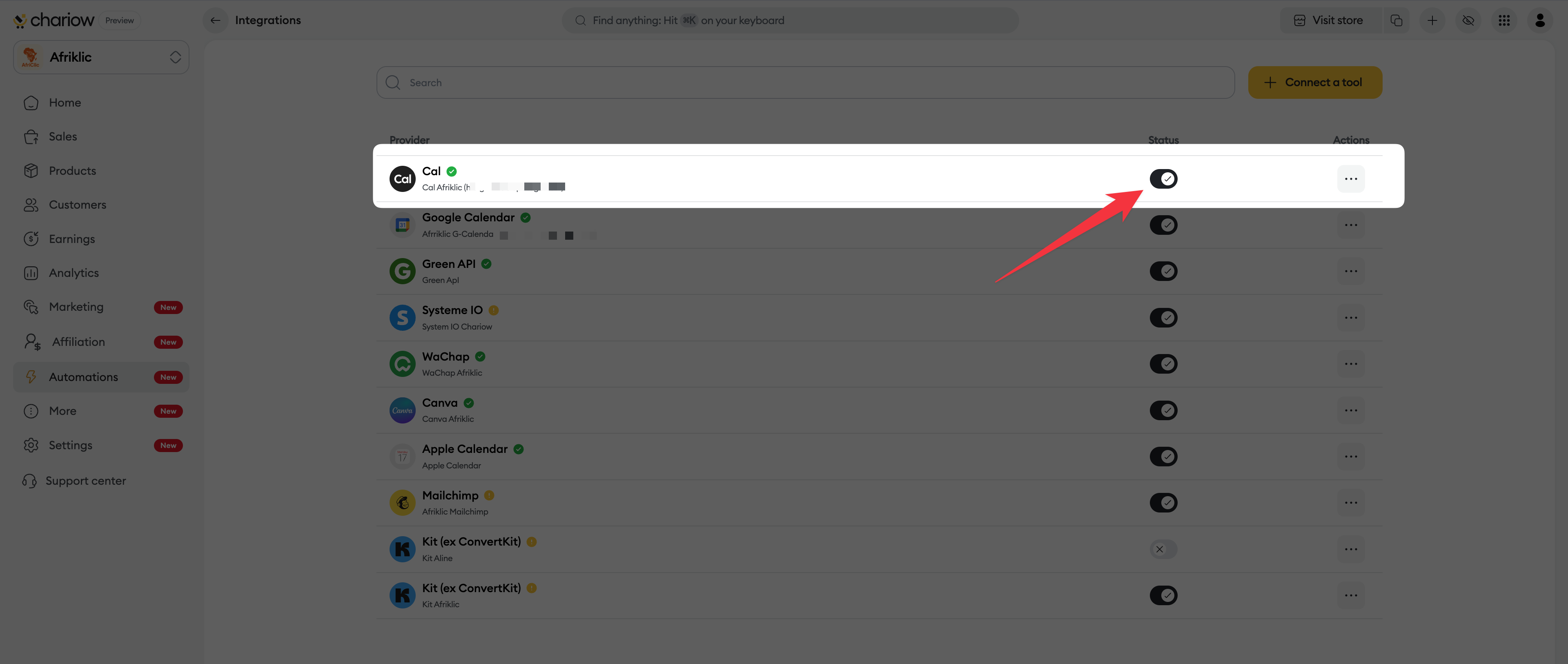 Once the authorization is confirmed, you'll be redirected to Chariow's "Integrations" tab. You should see "Cal" appear in the list of providers with an active status (switch in the on position).