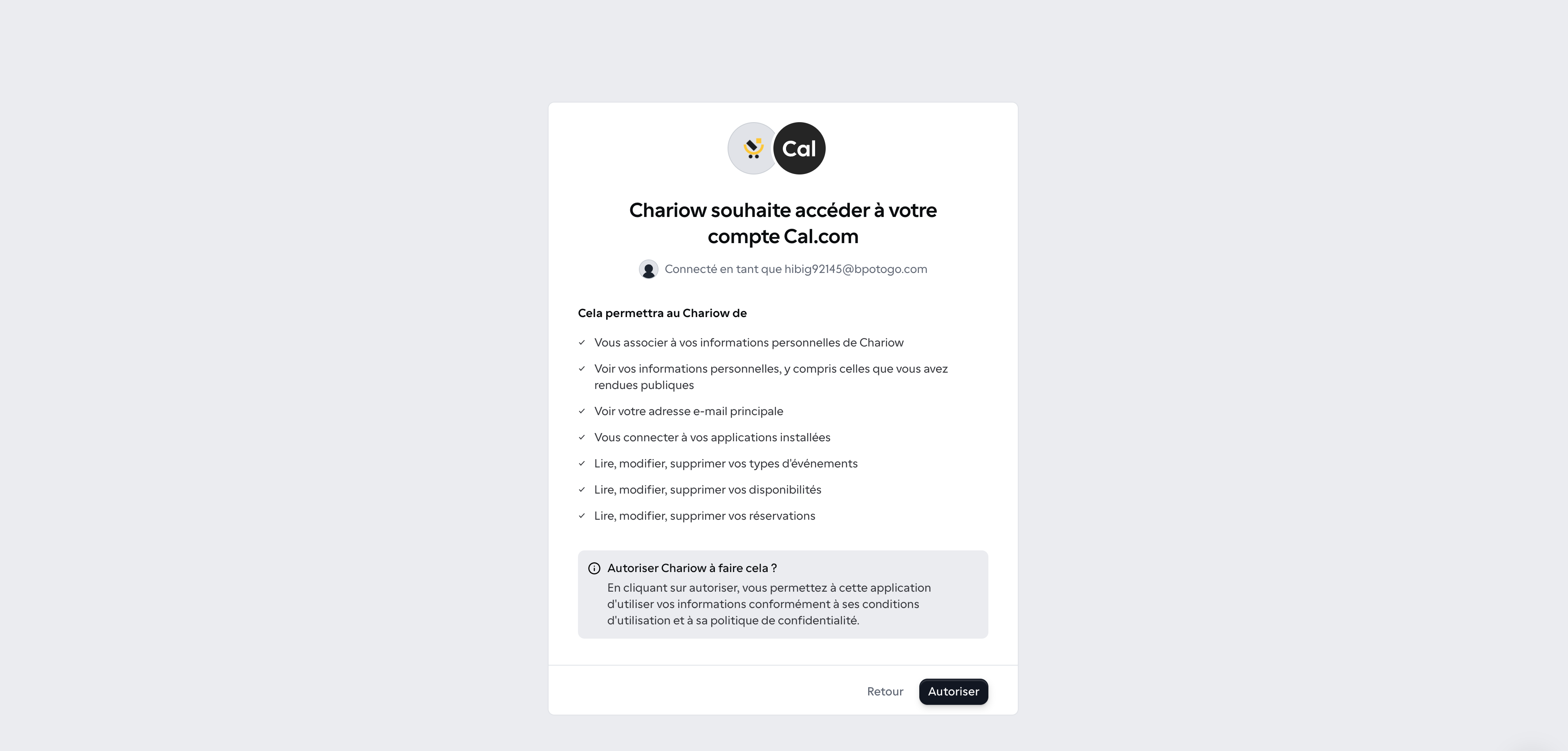 You’ll be redirected to a Cal.com authorization page. This step lets Chariow: