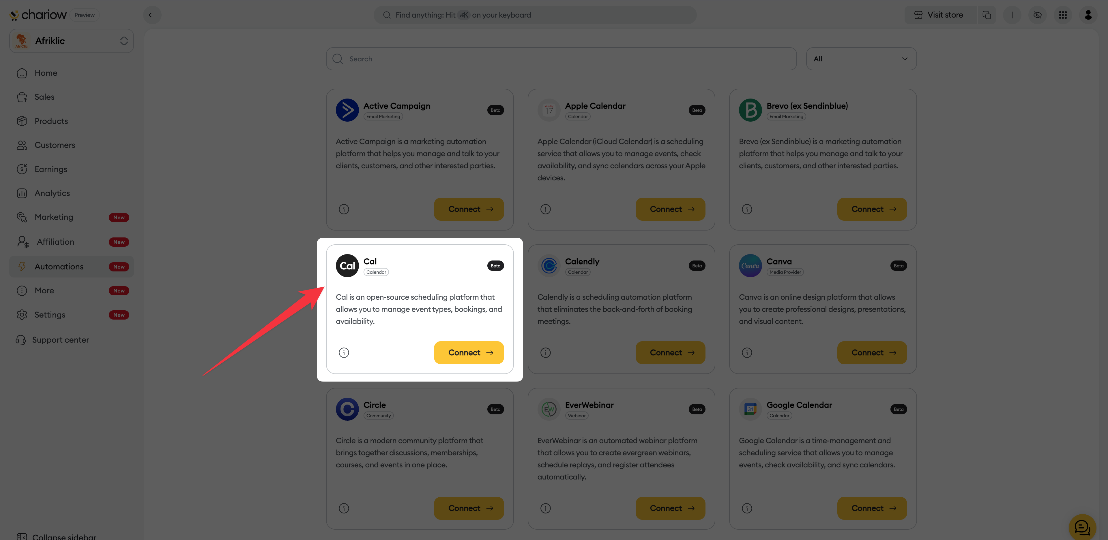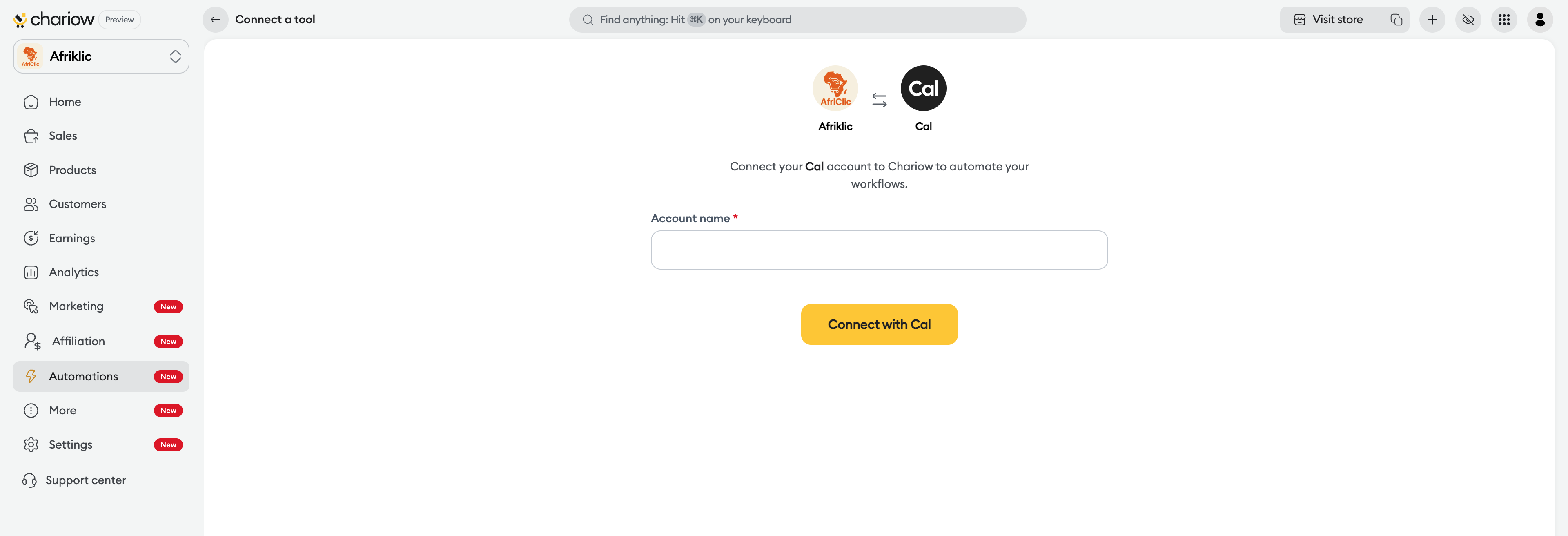 Cal.com is an open-source scheduling platform that lets you manage your event types, bookings, and availability. By connecting Cal.com to Chariow, you can sync your calendars and automate your workflows related to booking appointments with your clients.