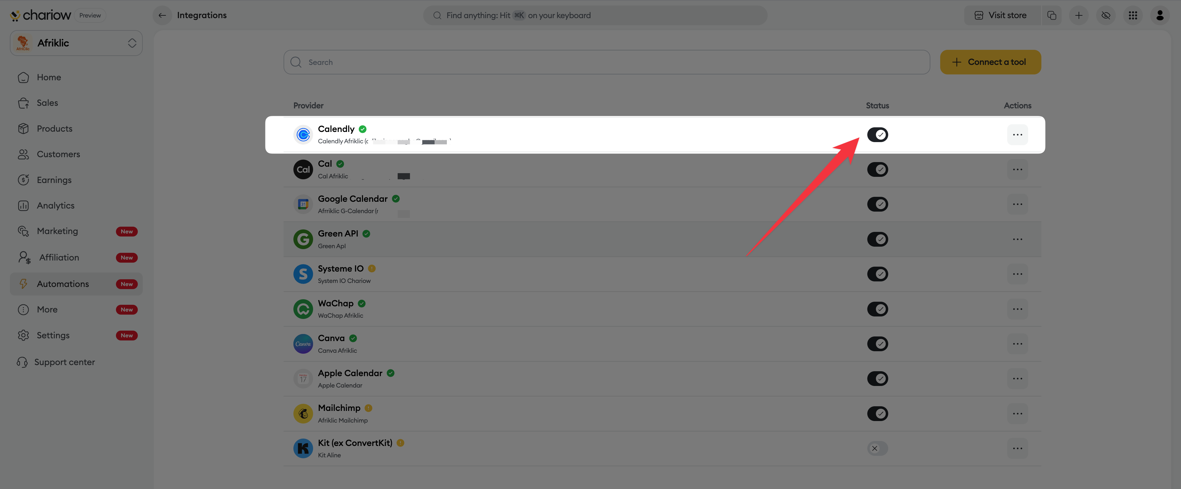 You’ll be automatically redirected to your "Integrations" list on Chariow. The "Calendly" row should now appear with a green checkmark next to the name and the switch in the "Status" column should be turned on.