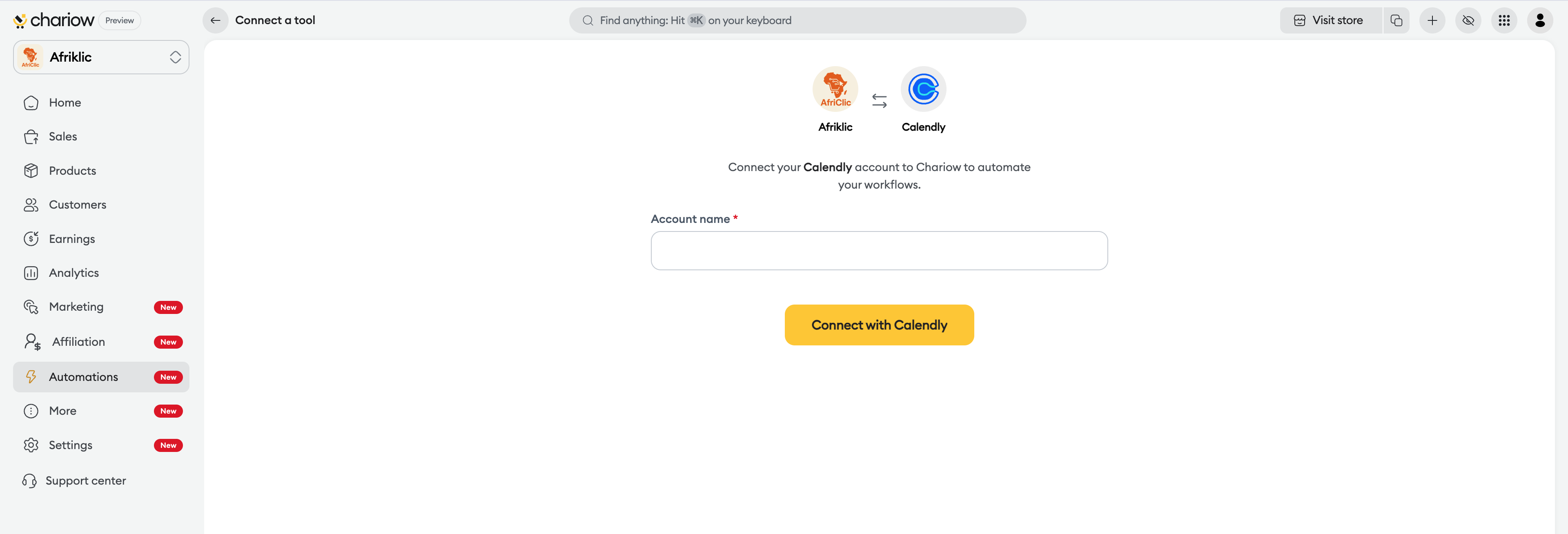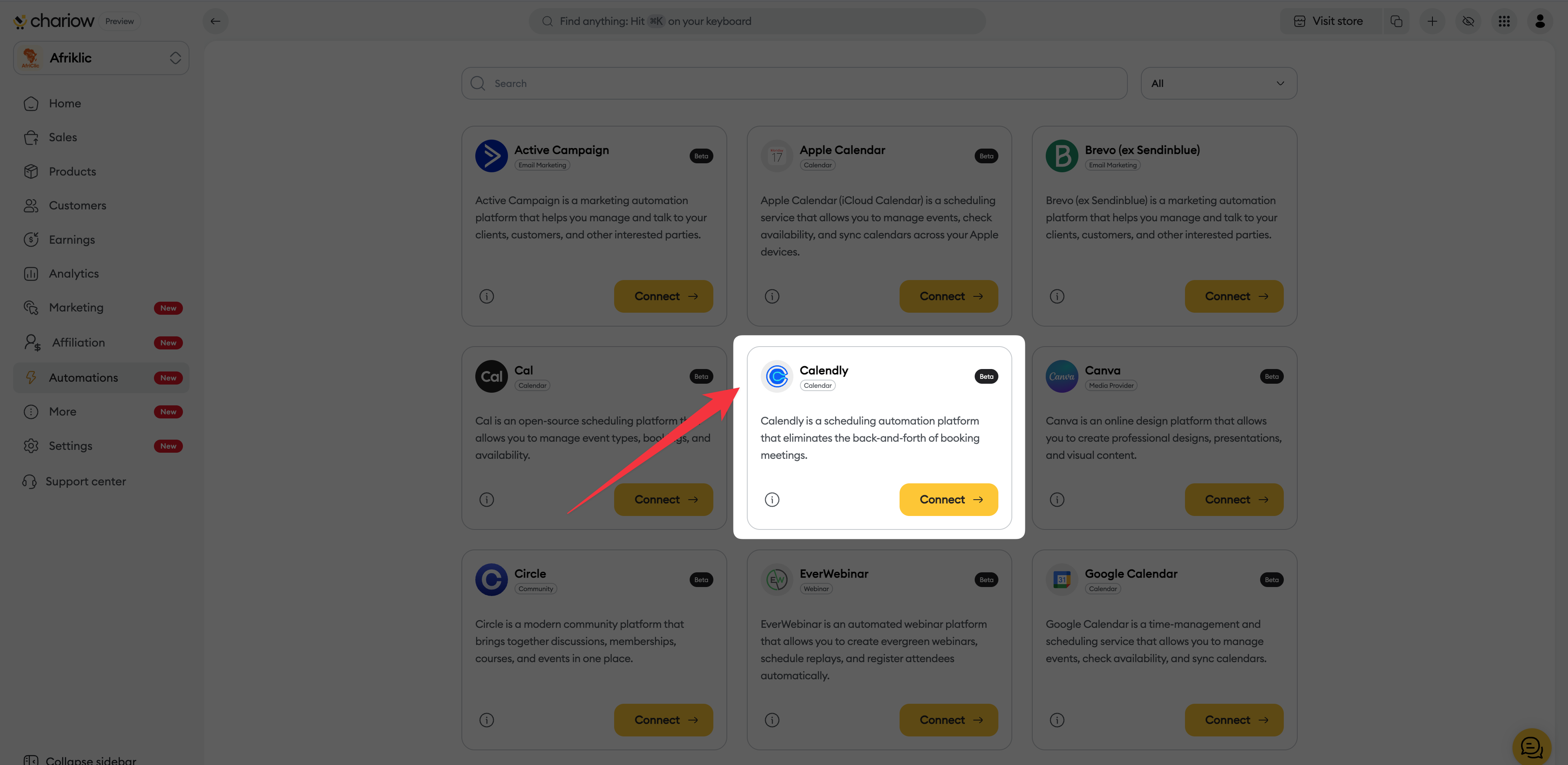 Calendly is an appointment scheduling solution that simplifies getting in touch by eliminating endless email exchanges. By connecting Calendly to Chariow, you let your clients book slots directly while centralizing the management of your appointments in your "Automations" interface.