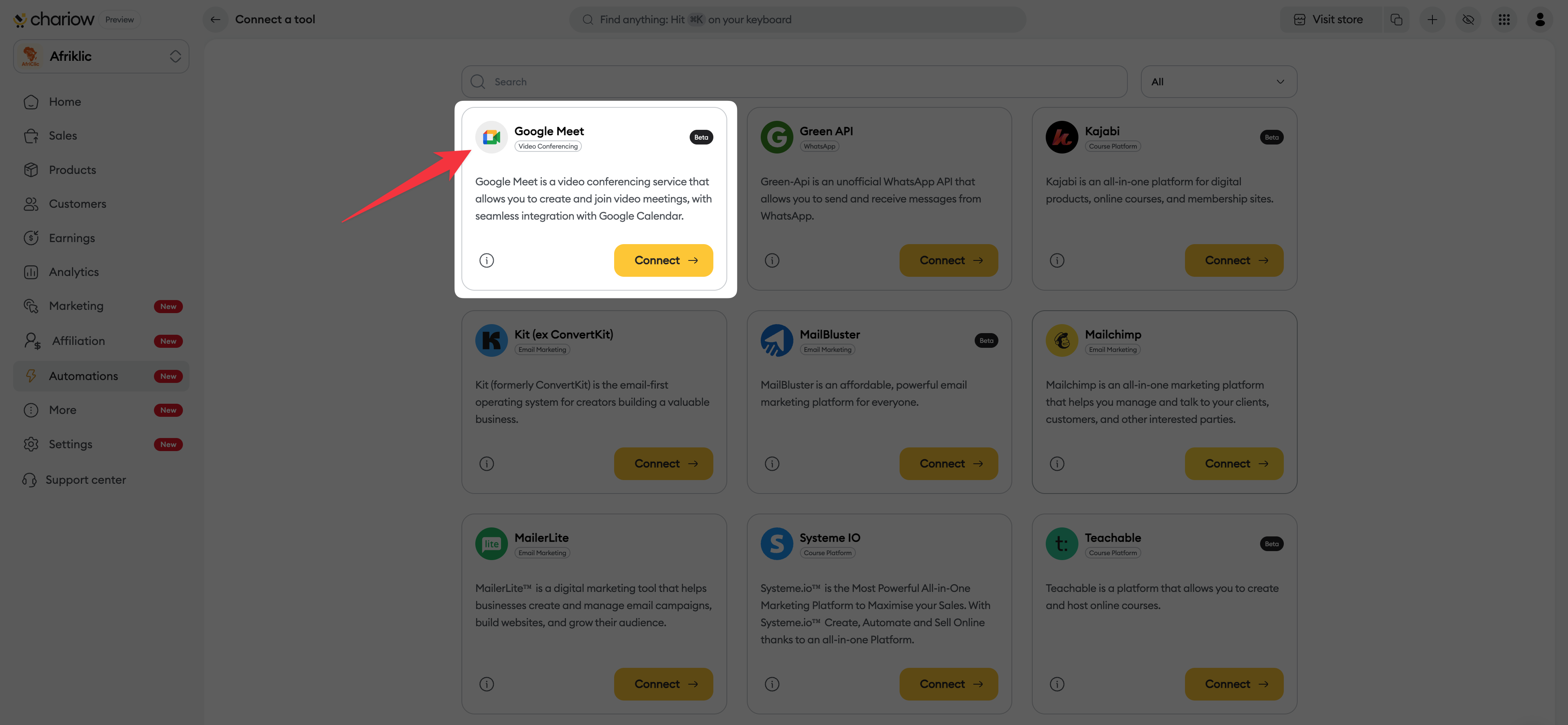 In your Chariow interface, click on the "Automatisations" tab in the left sidebar menu. Then click on the "Connecter un outil" button to display the list of available integrations.