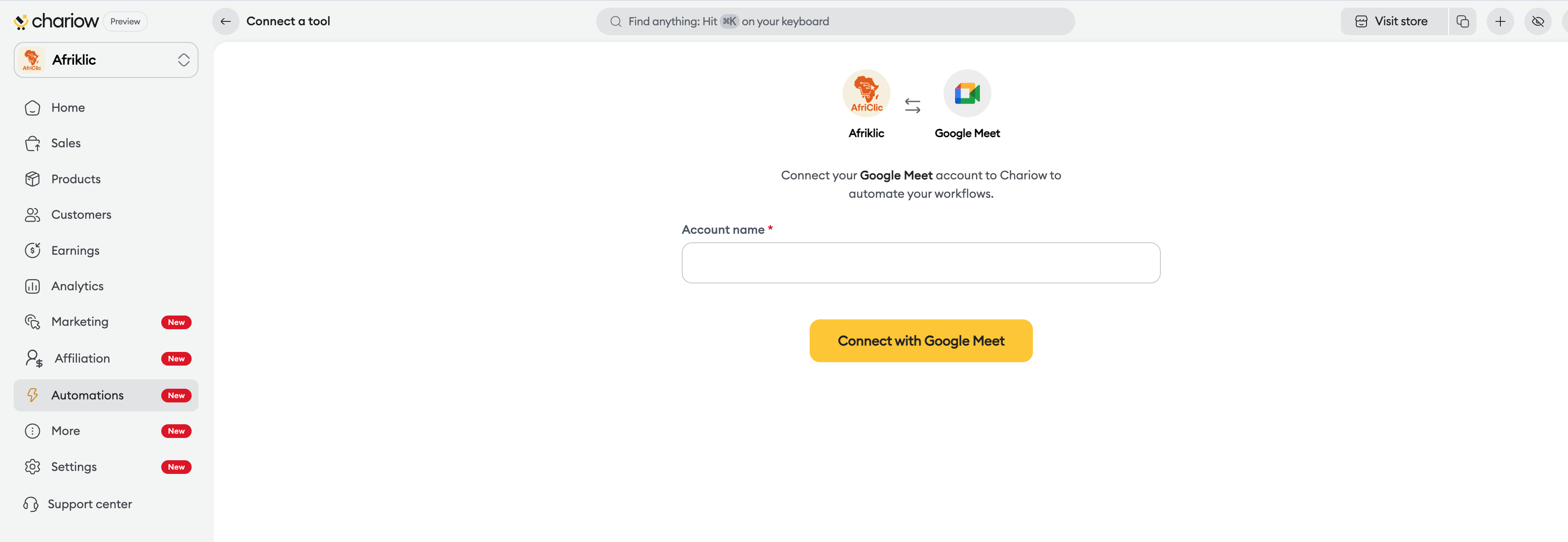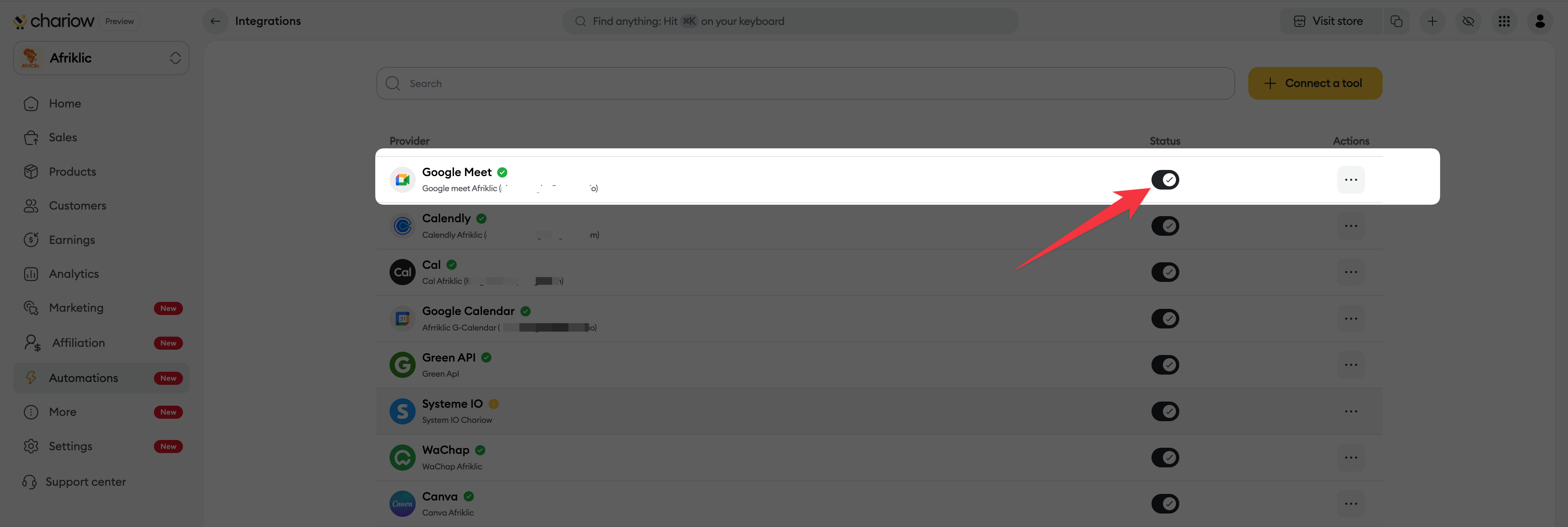 Once the authorization is granted, you’ll be redirected to your Chariow dashboard. The integration will now show up in your list of connected services with an active status.