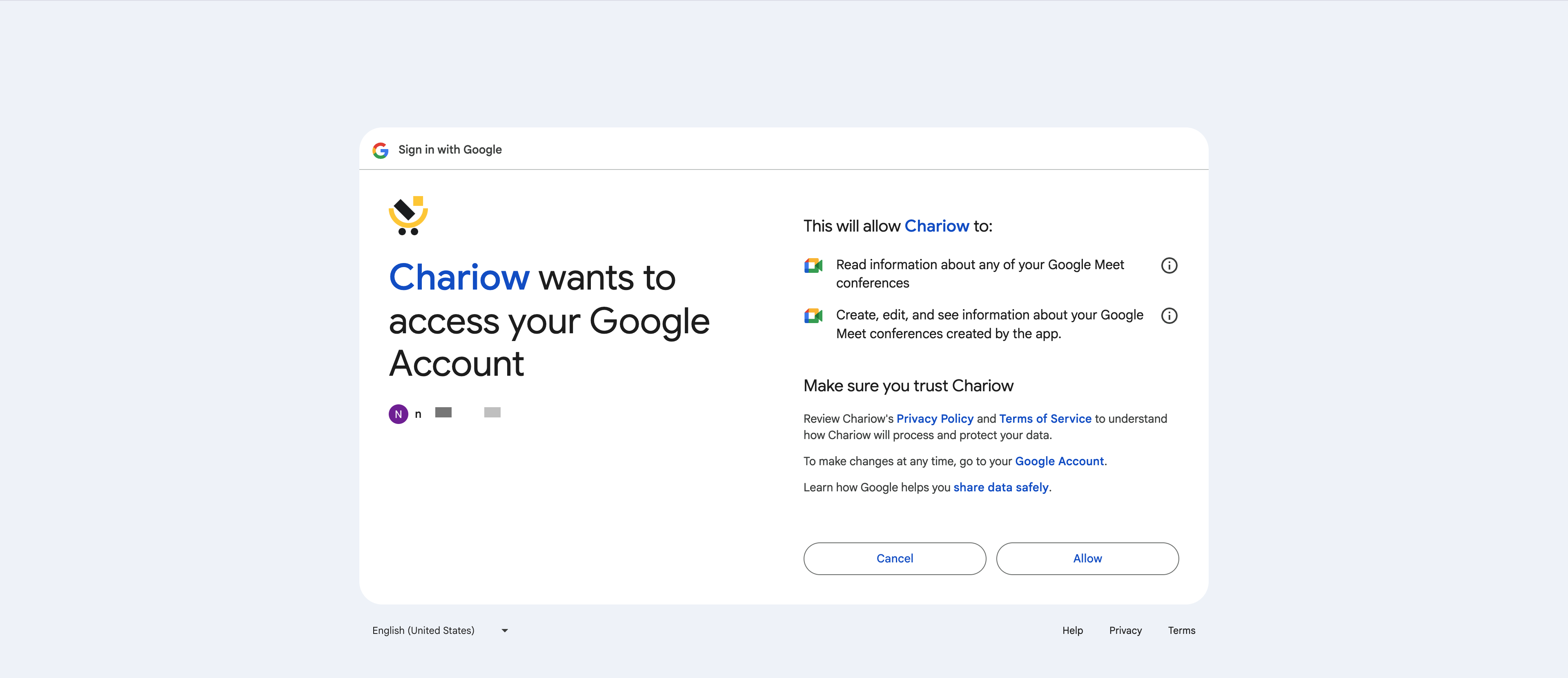 Click the "Continue" button to confirm Chariow's access to your account.