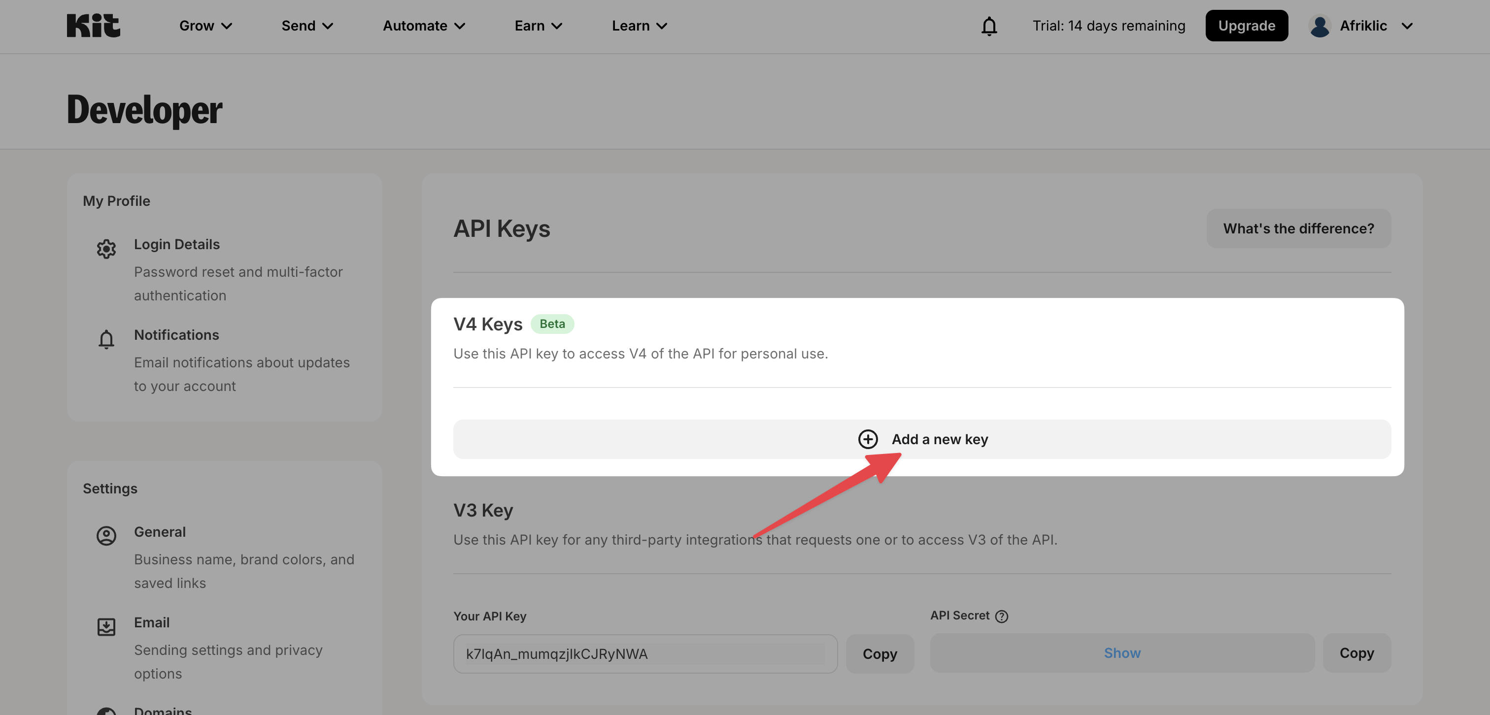 Click the button to create a new API key (usually "New API Key" or something similar). Make sure to select the option for an API Key V4.
