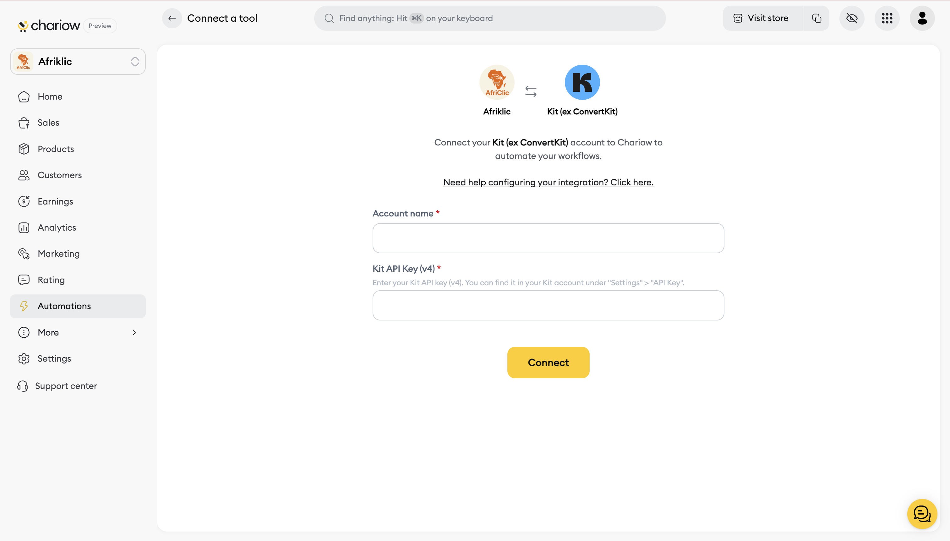 To set up the connection between your Chariow store and your Kit account, you'll need to grab your Kit API key and enter it in the Chariow integration interface.