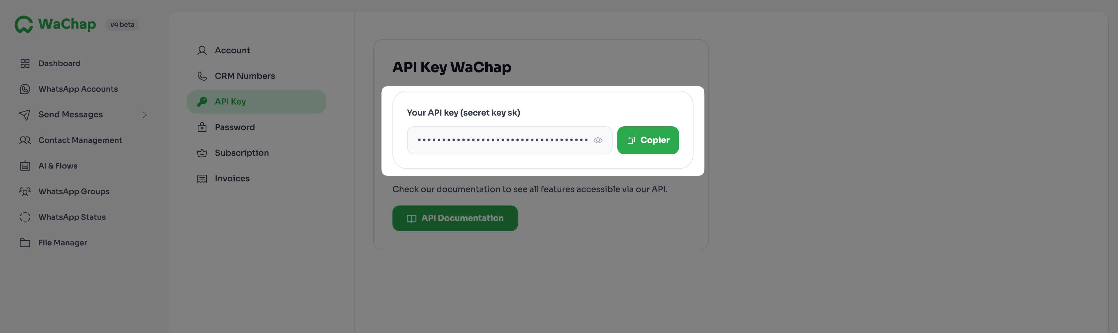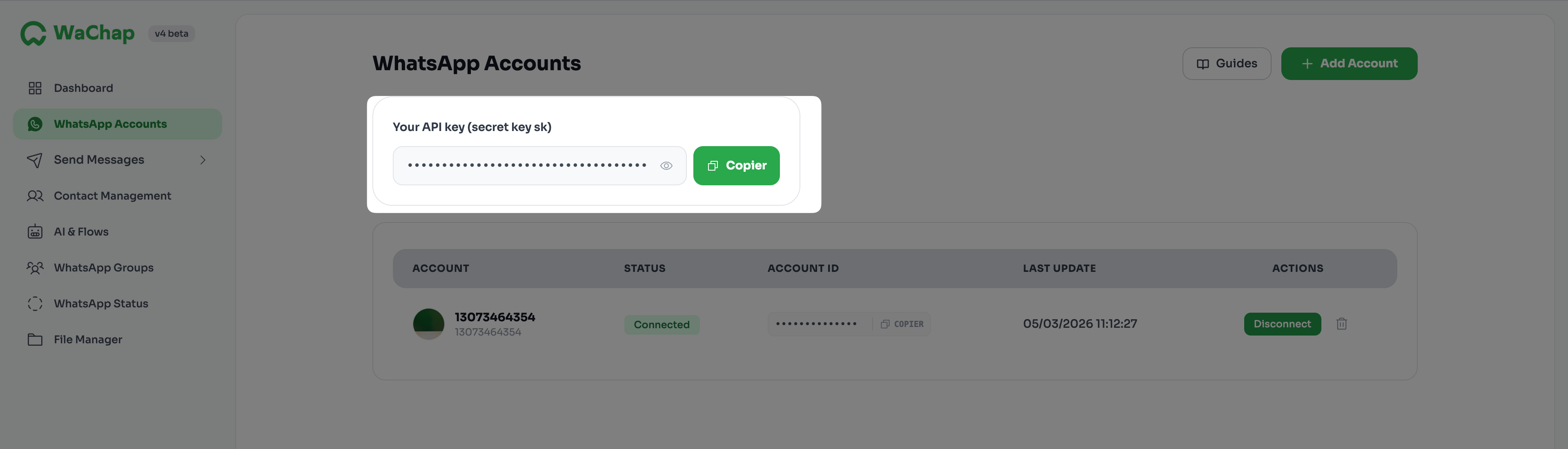 Option 1: Click on WhatsApp Accounts in the side menu. The secret key is shown at the top of the page.