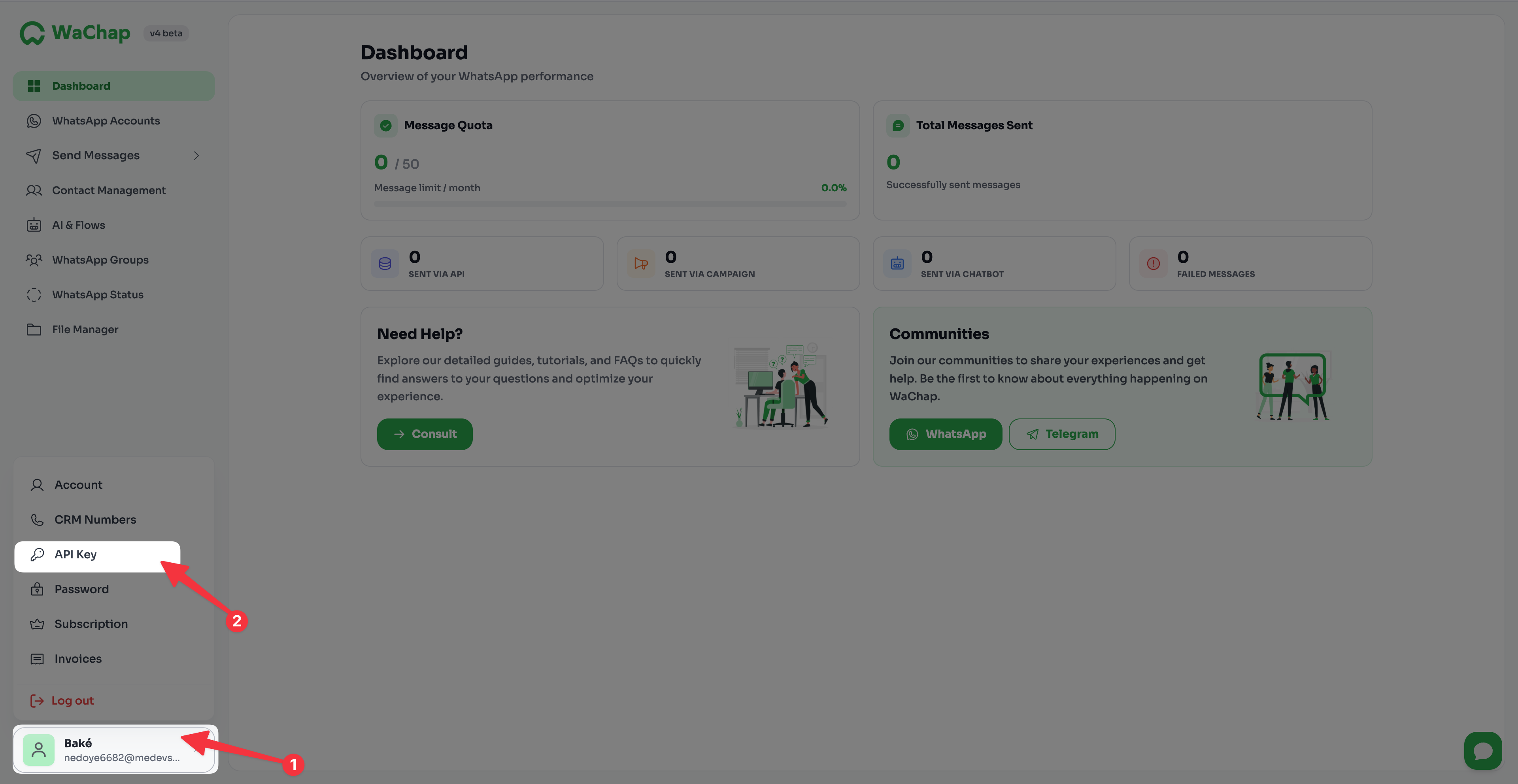 Option 2: Click on your Profile(1) (all the way at the bottom of the side menu) and look for the API Key(2) section.