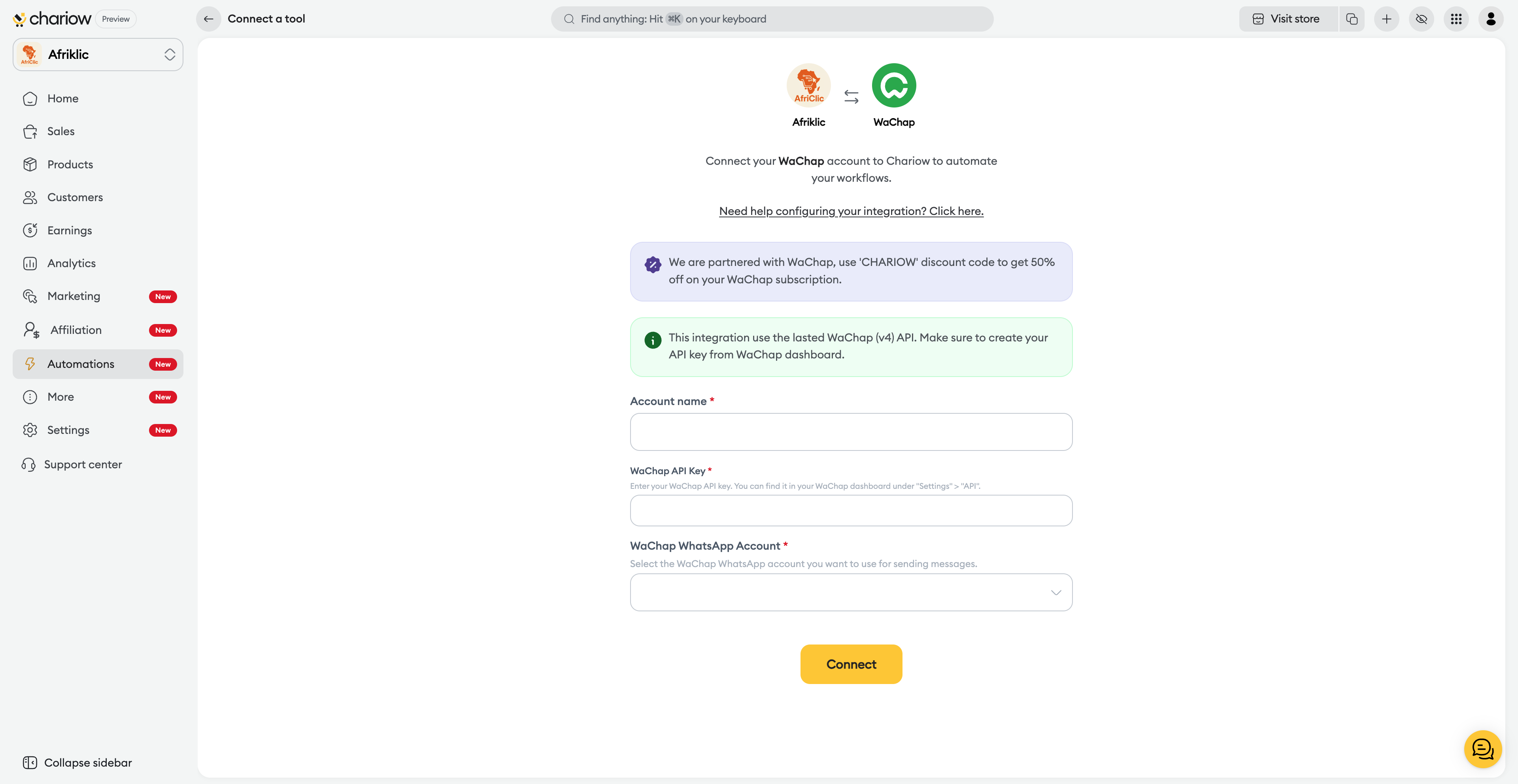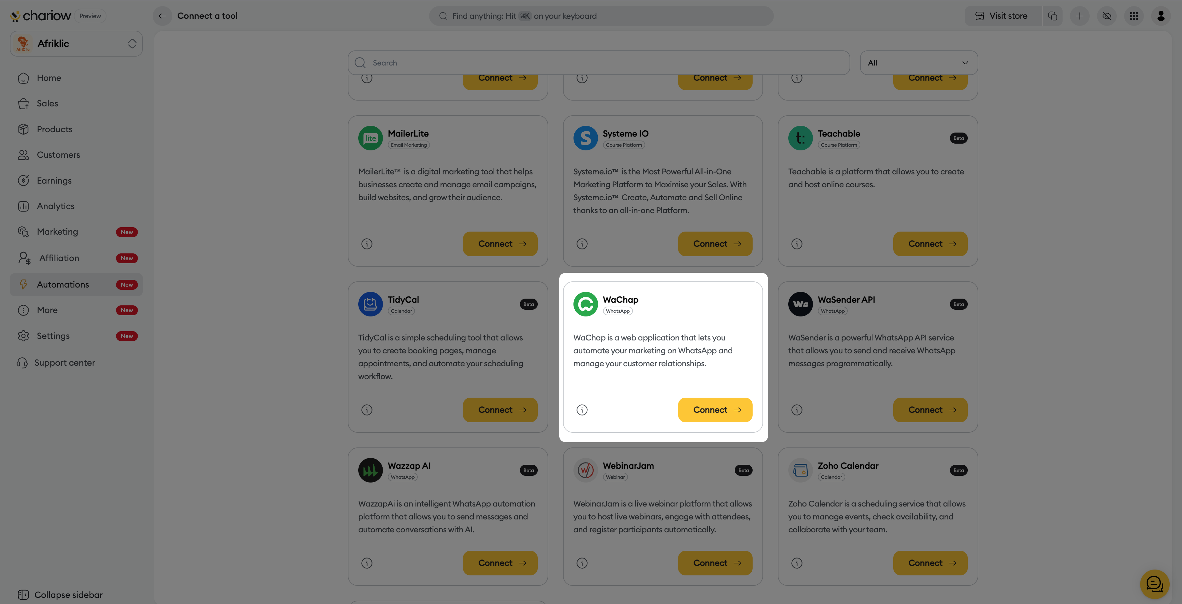 WaChap is a platform that lets you automate your business via WhatsApp and SMS. Its integration lets you create a direct bridge between your Chariow store and your WhatsApp account. This lets you centralize your communications and automate customer follow-up for maximum responsiveness.